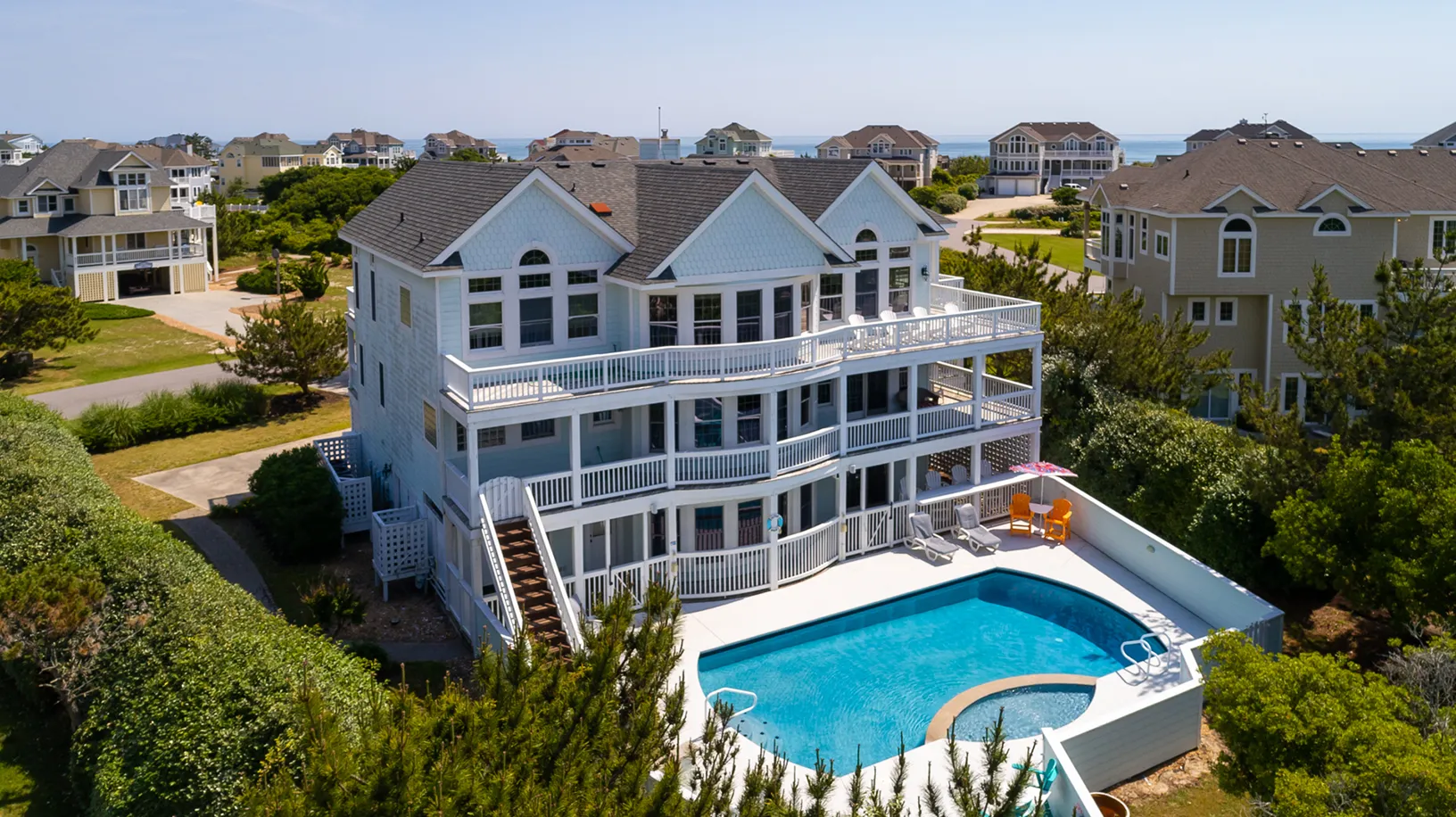 "The outstanding features of this house to me are (1) large but comfy and cozy living rooms in the upper and middle levels, (2) attractive and comfy first-level recreation room with kitchenette, (3) very well-appointed master bedrooms on all three levels, and (4) the largest and most beautiful swimming pool I've ever seen in Pine Island. There are many more great features but these are the more distinct ones I can think off when comparing other houses in Corolla we have stayed in over the past 32 years."
