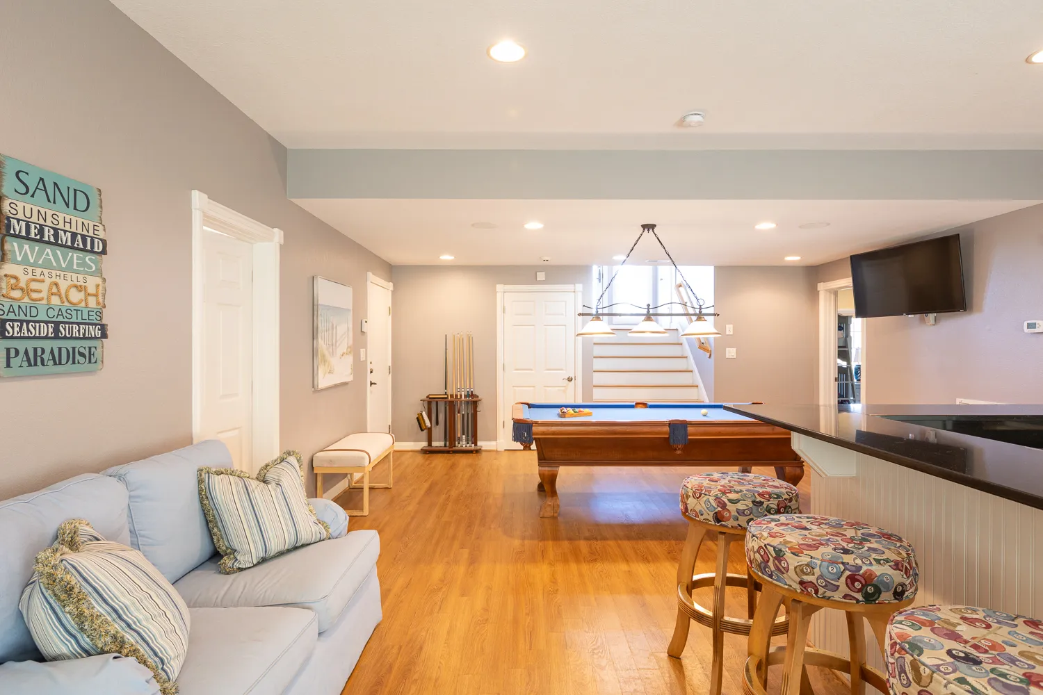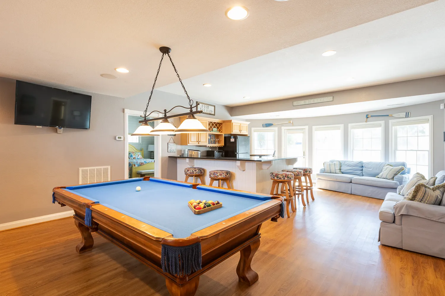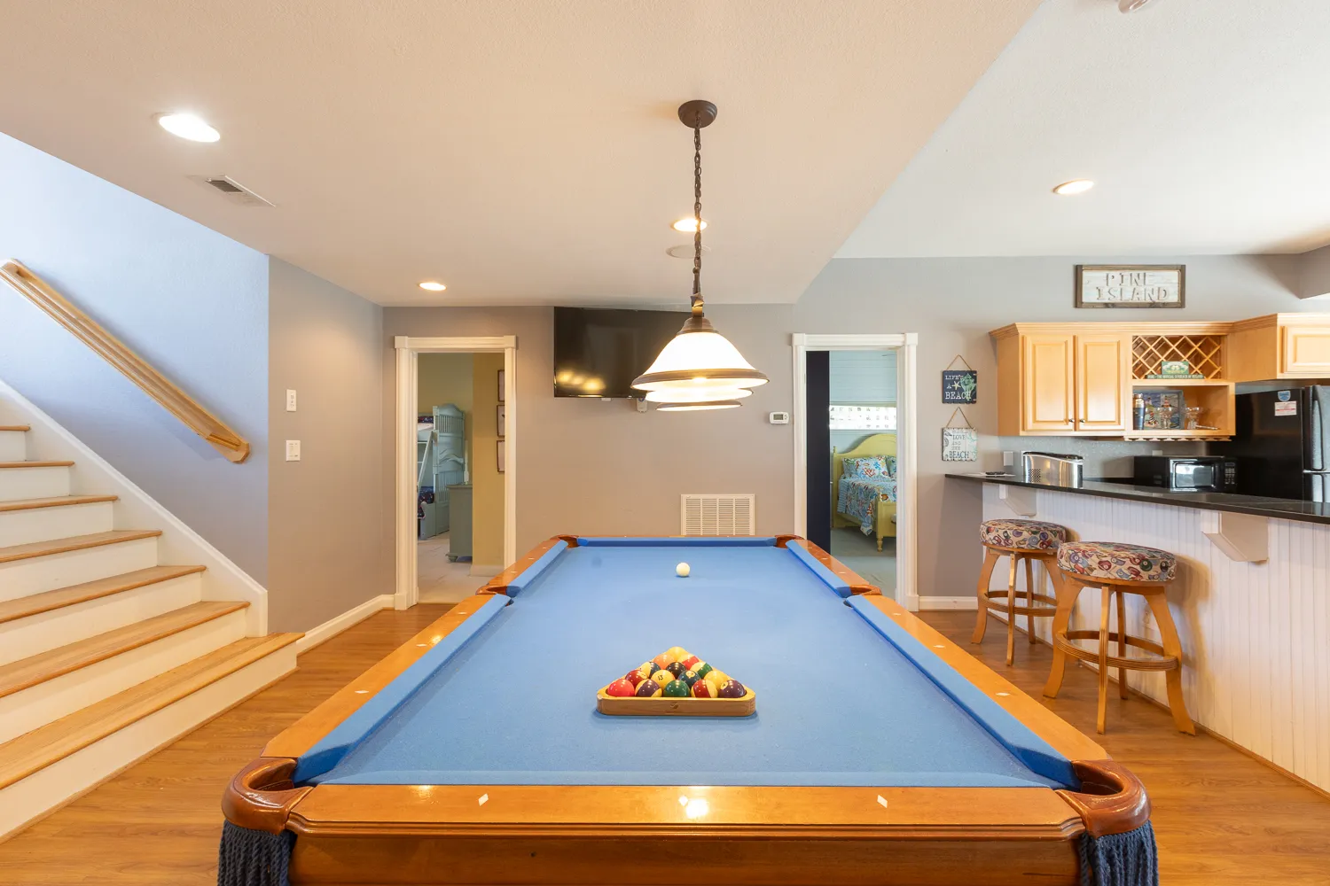 Rec room with pool table, sports bar, and kitchenette with full size refrigerator, microwave, dishwasher; laundry.
