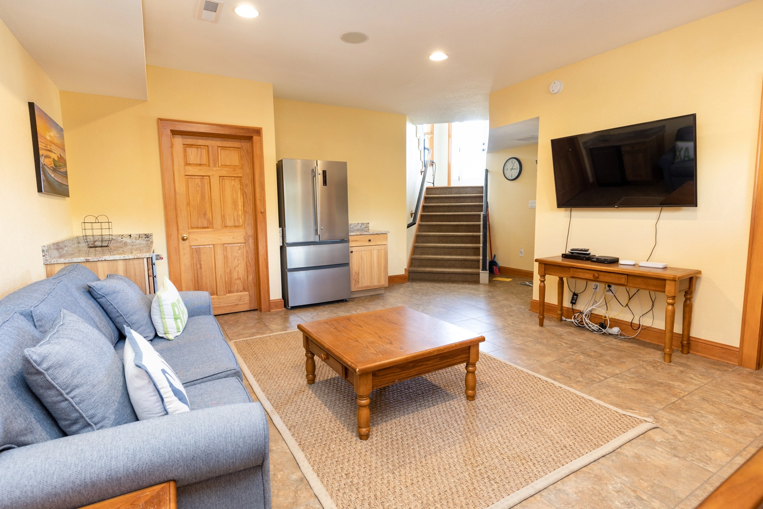 "Great location on a quiet street. Nice view of both the ocean and greenery looking towards the sound. Beautiful home, nicely furnished, excellent kitchen! Would be helpful to place the vacuum, and perhaps a broom on the main floor. We looked everywhere, and couldn't find the vacuum until the last day. The walkway to the beach is super convenient!"