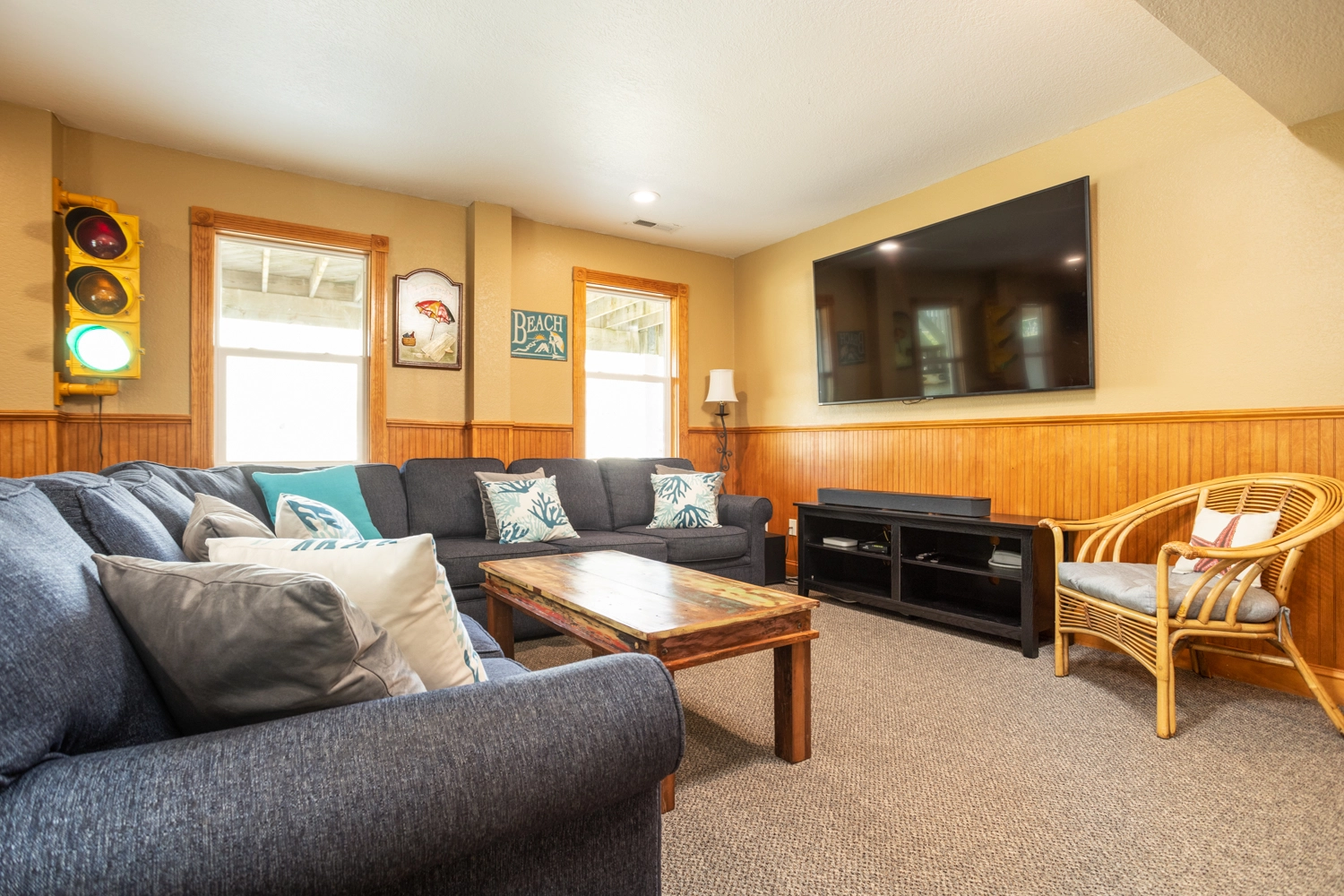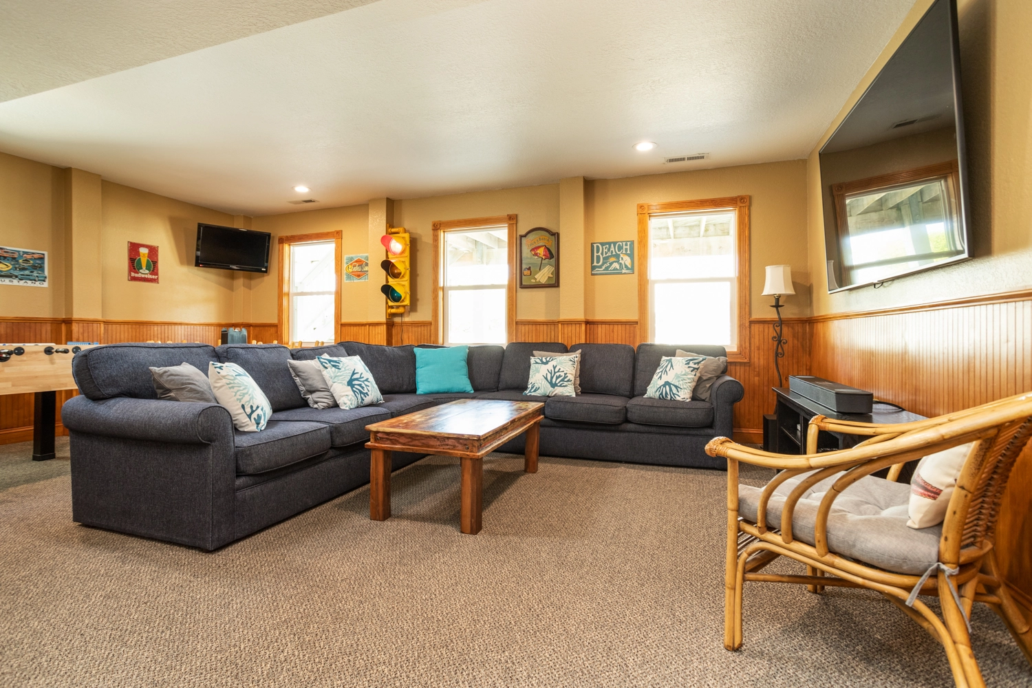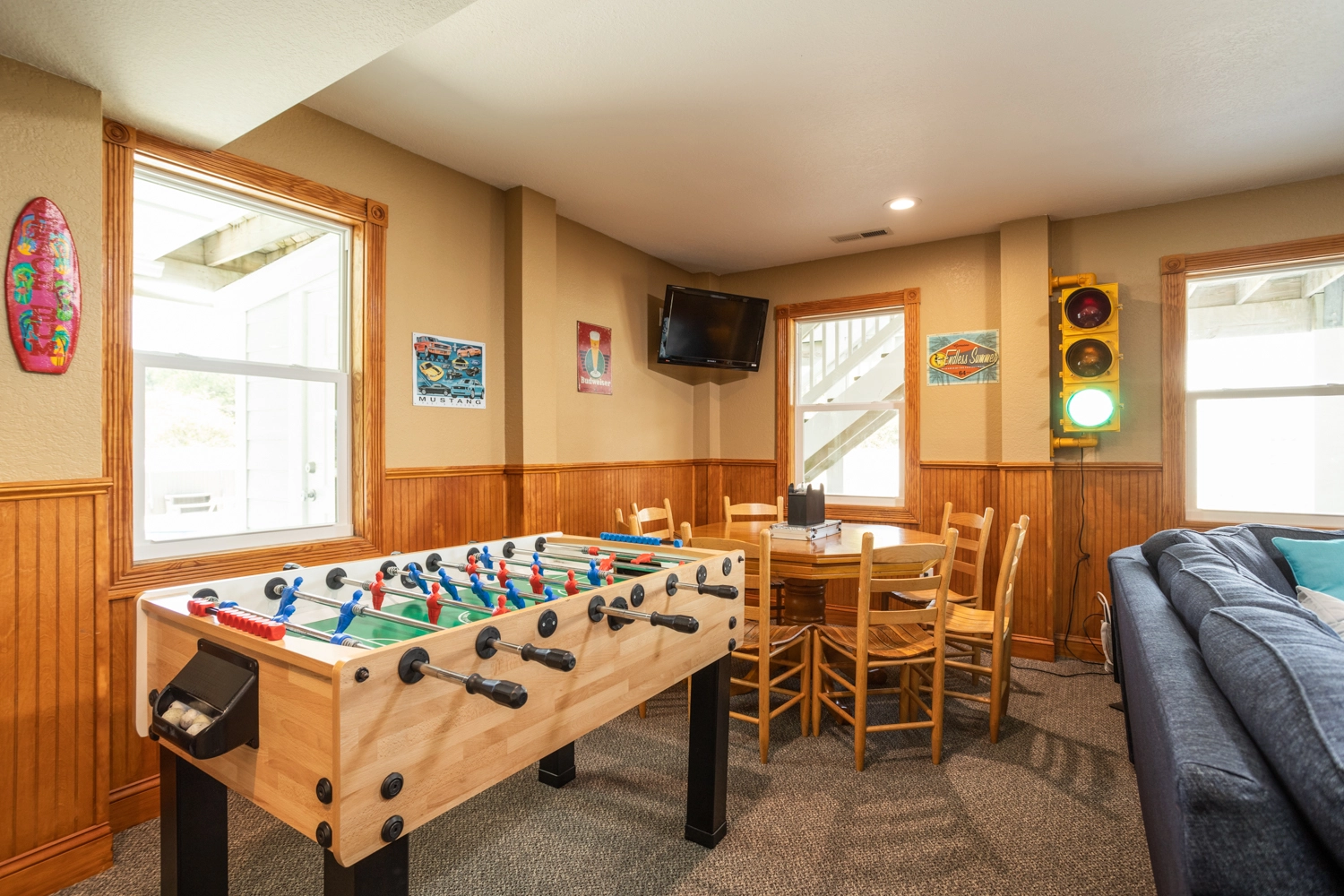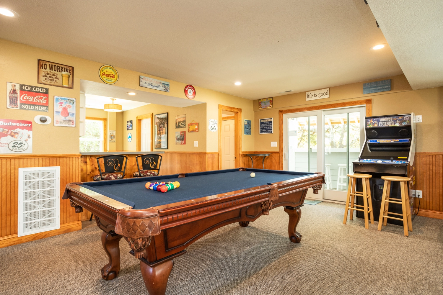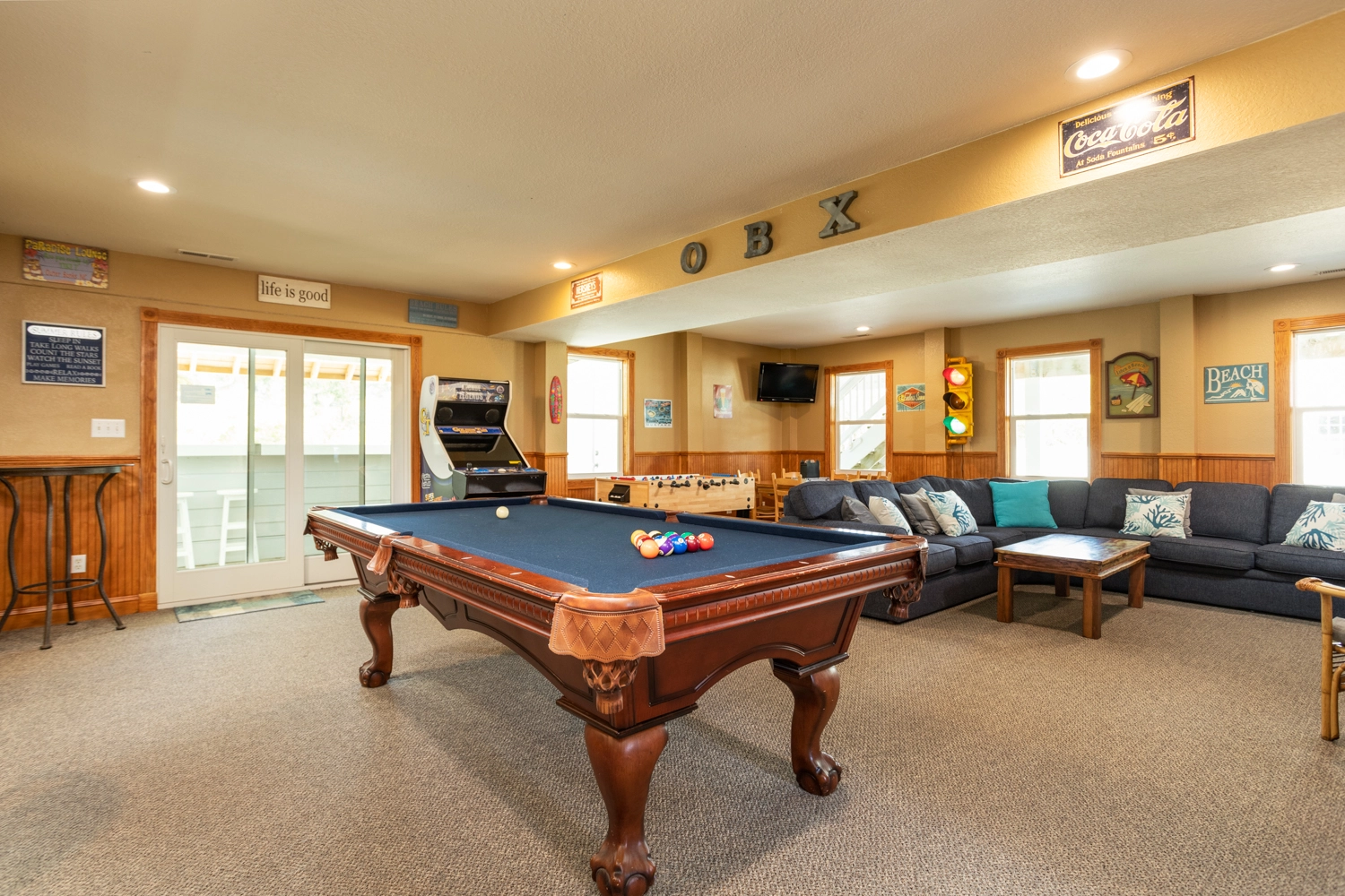 Rec room with pool table, foosball, arcade game, kitchenette, and full-size refrigerator; laundry.