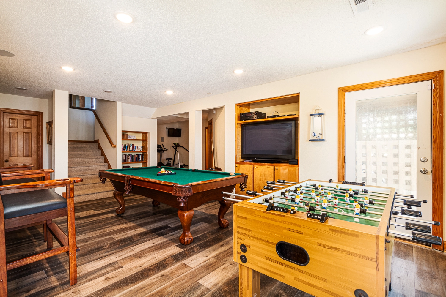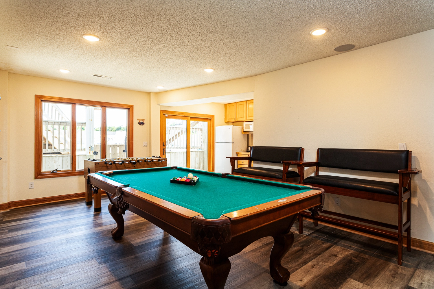 Theater room; rec room with pool table, foosball, and wet bar with refrigerator.