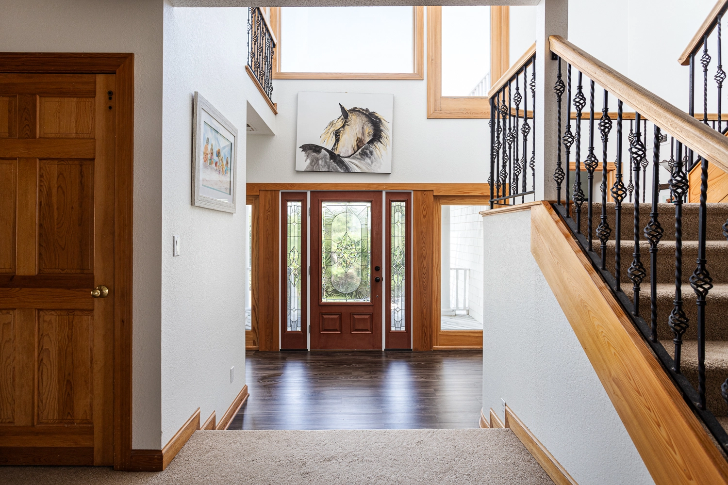 Sitting area with wet bar with beverage refrigerator; laundry.