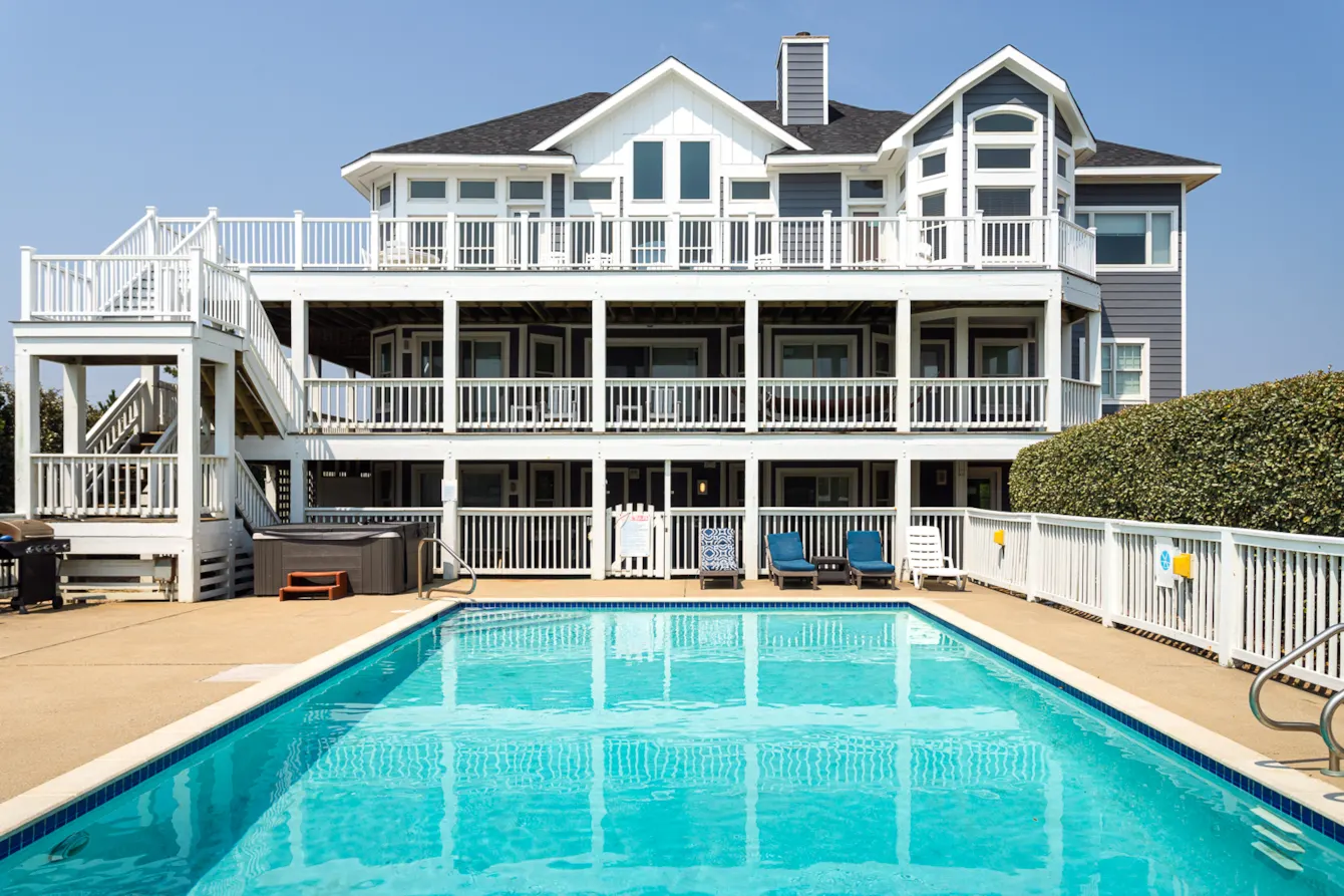 "Living the Dream has fantastic decking with enough poly-wood furniture in front and back to seat a large crew. The ocean view from the top floor is amazing. Nothing like seeing the sunrise from the dining room table or deck! Nice view of the sunset colors from the back deck as well. The pool, hot tub, pool table and shuffleboard court provided a lot of fun as well. Loved having a private walkway and the seating area overlooking the beach was nice too. Our weather was not the best, but we enjoyed our stay for sure."