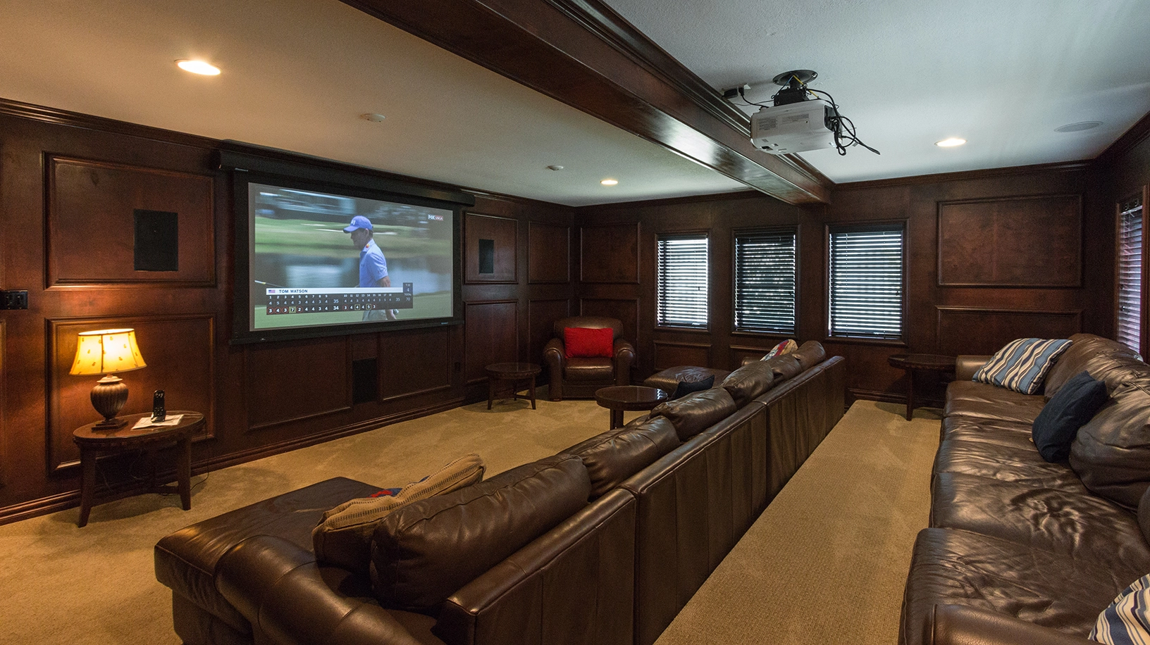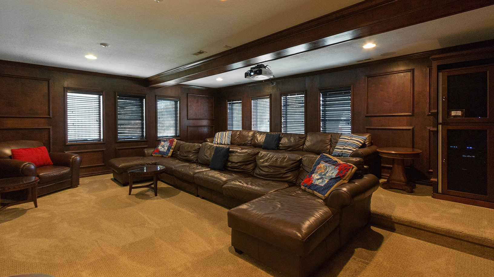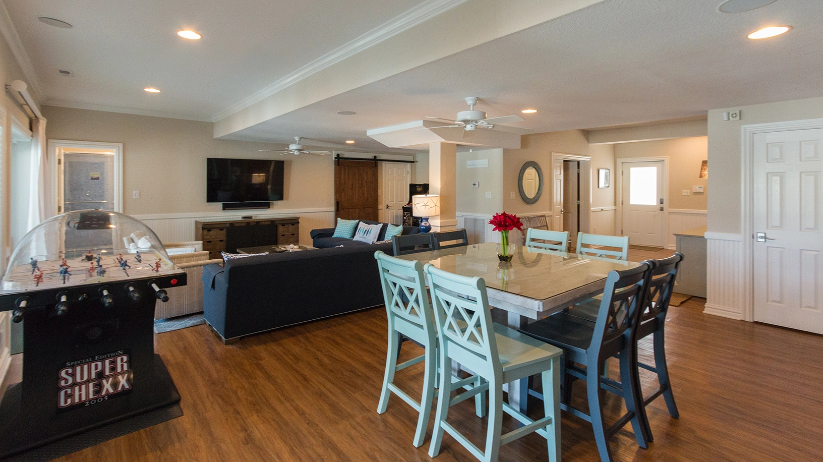 Theater room with tiered seating; rec room with large TV, bubble hockey table, pinball machine, multi-game arcade machine, and access to private heated pool and hot tub; kitchenette with refrigerator, ice machine, and microwave; double laundry.