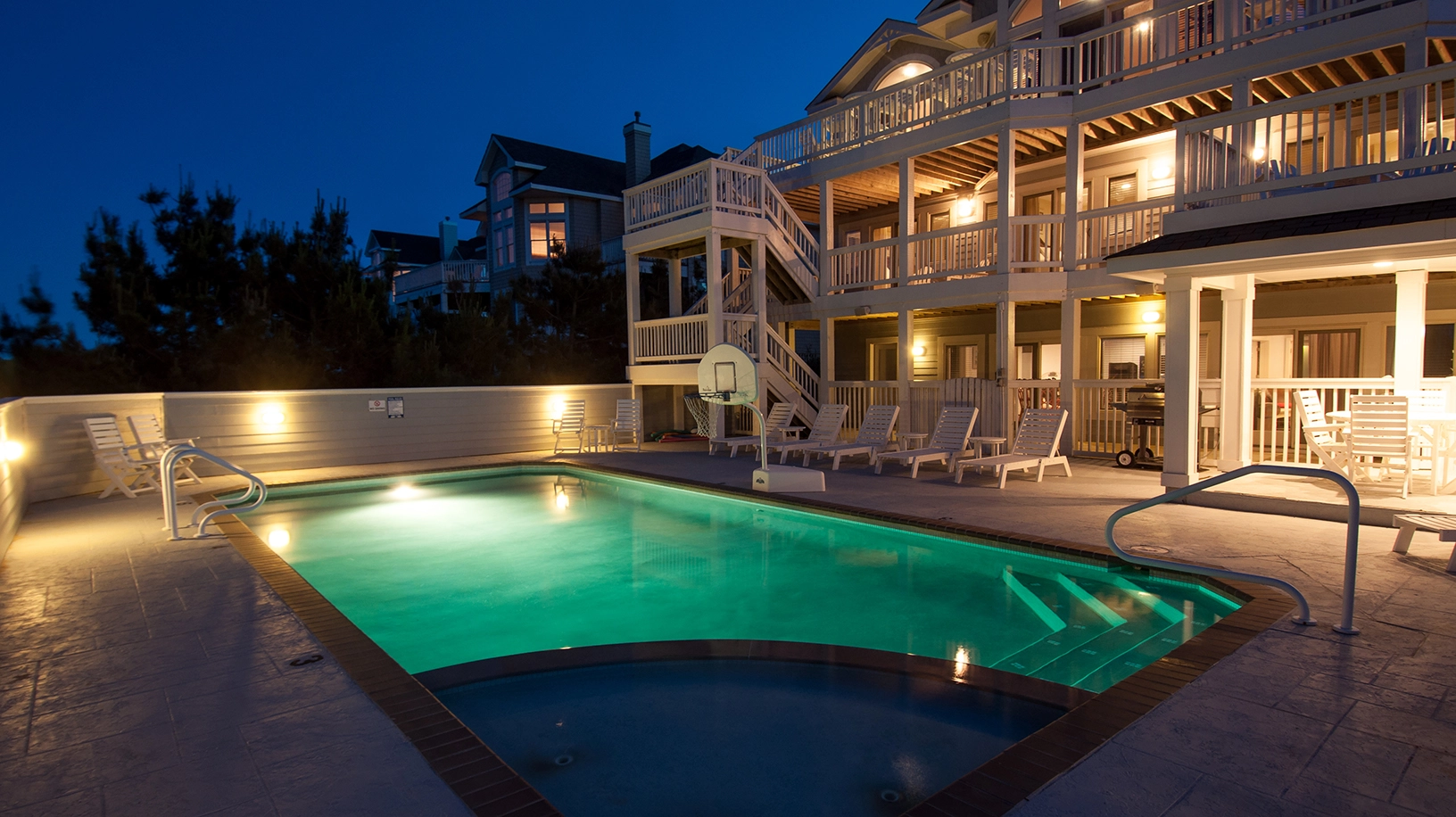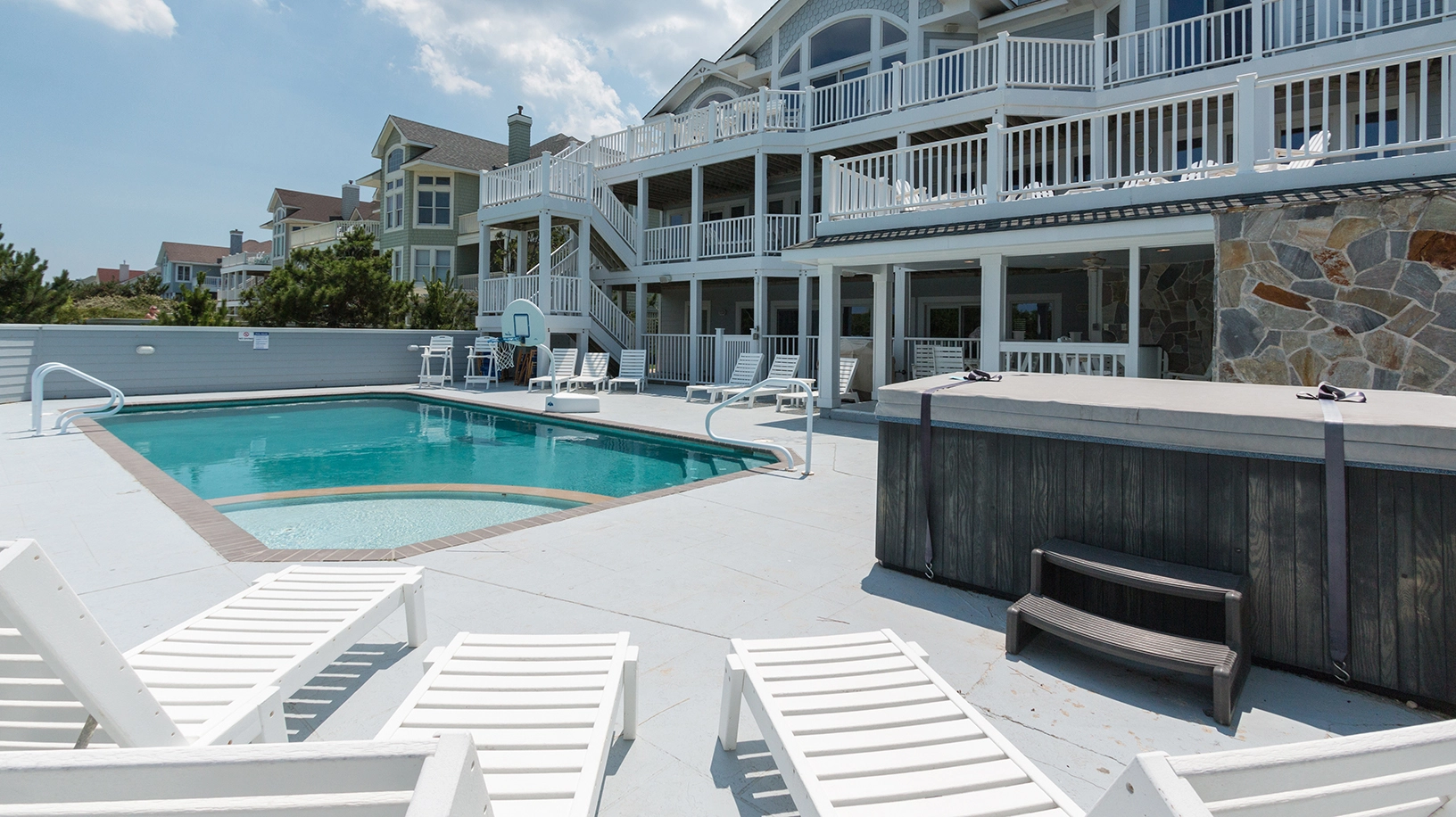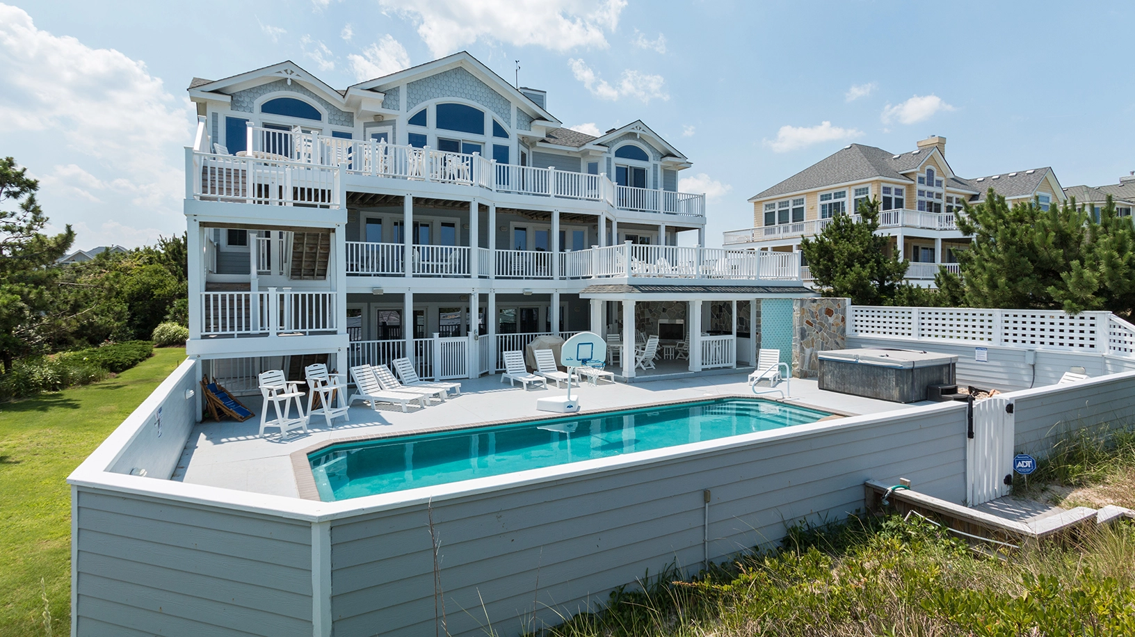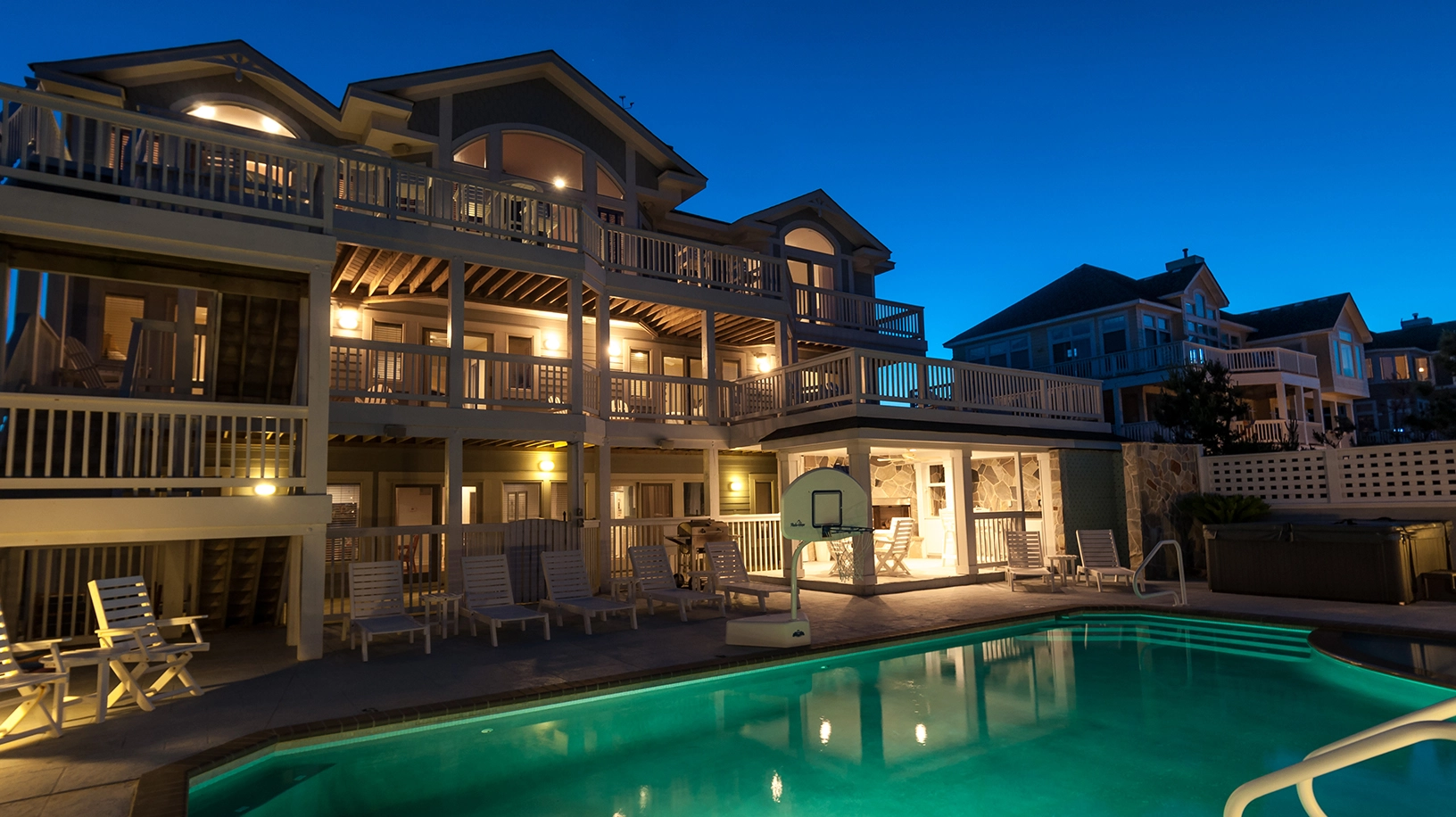 "Heated pool, close proximity to the beach, nice extras like ice machines, basketball net for pool, all the kitchen utensils, lots of seating on all levels, theater room, Sonos system, bathroom for the pool deck area and top floor, outside shower for after beach…so many nice ‘extras’ we didn’t expect."