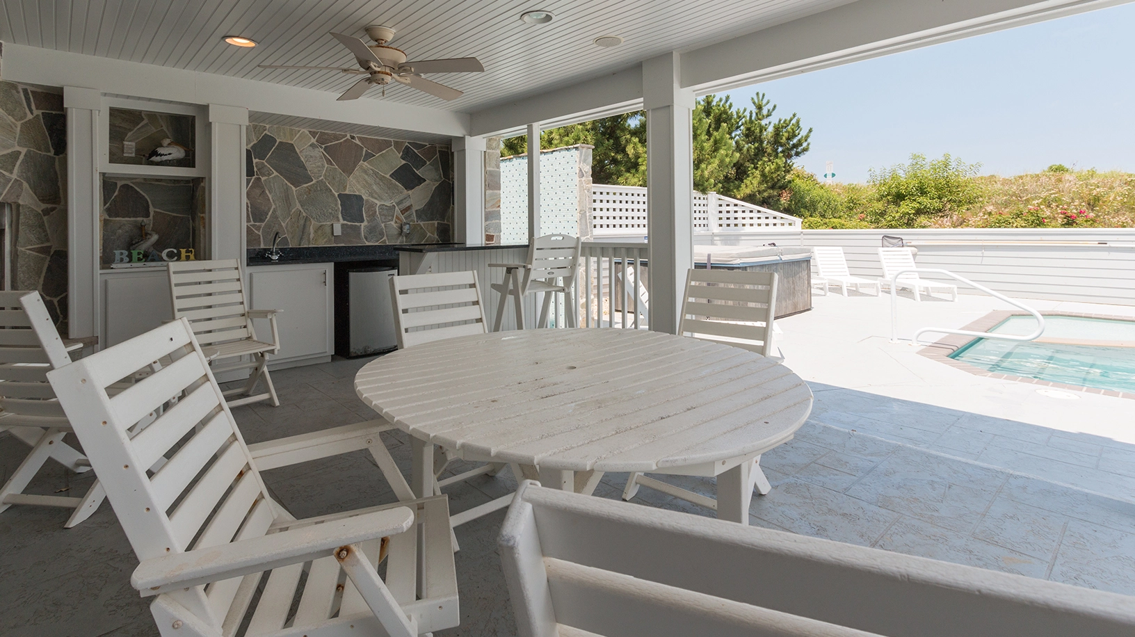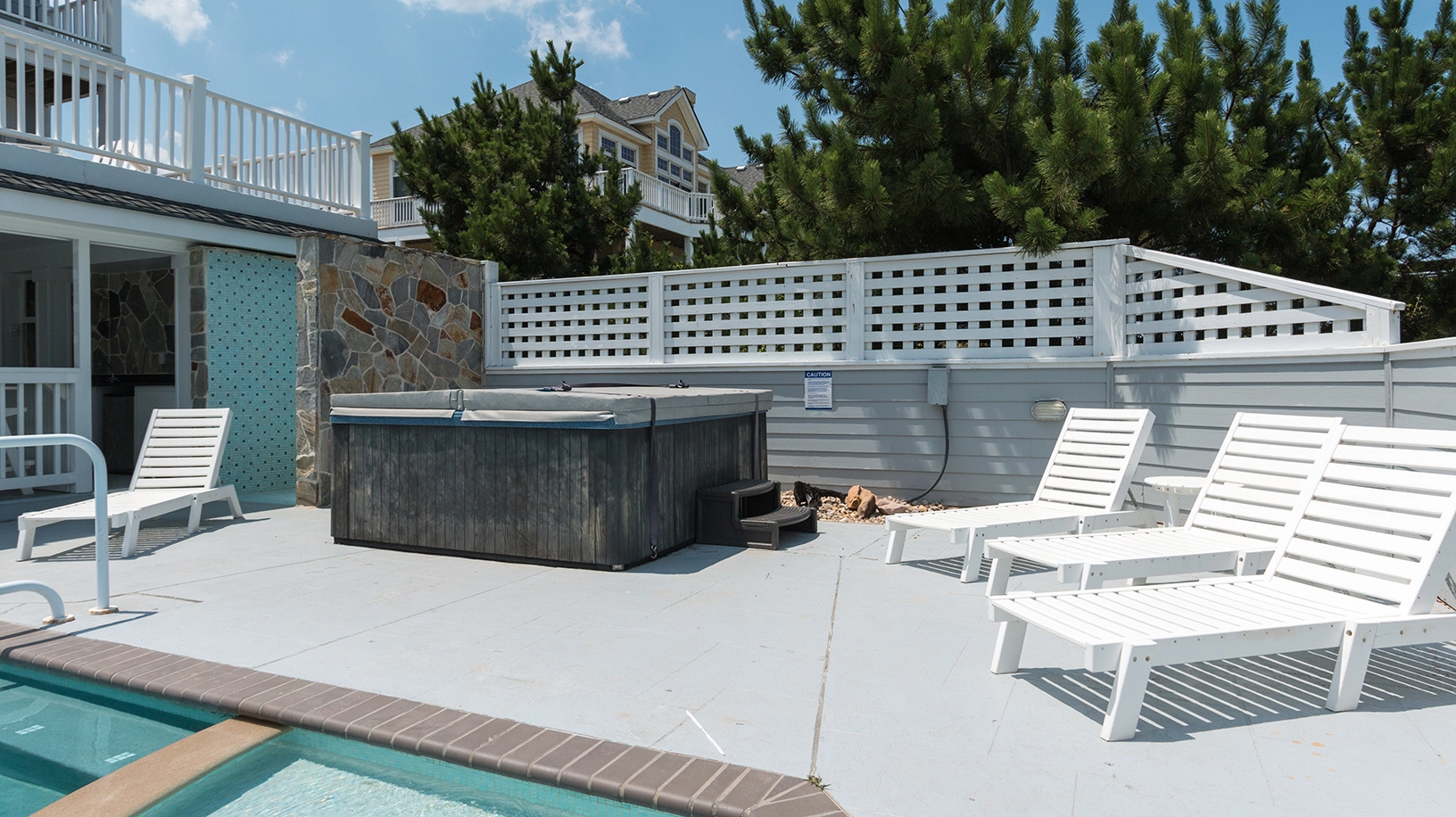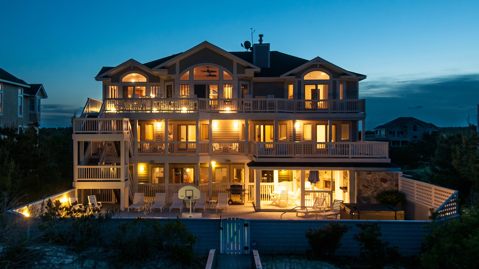 "Heated pool, close proximity to the beach, nice extras like ice machines, basketball net for pool, all the kitchen utensils, lots of seating on all levels, theater room, Sonos system, bathroom for the pool deck area and top floor, outside shower for after beach…so many nice ‘extras’ we didn’t expect."