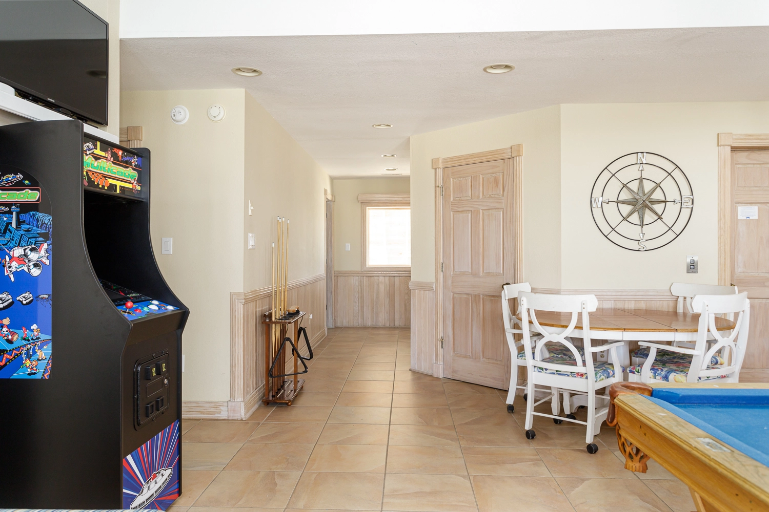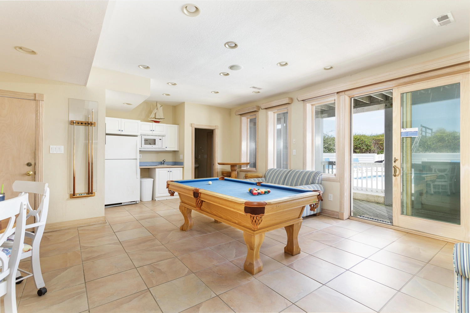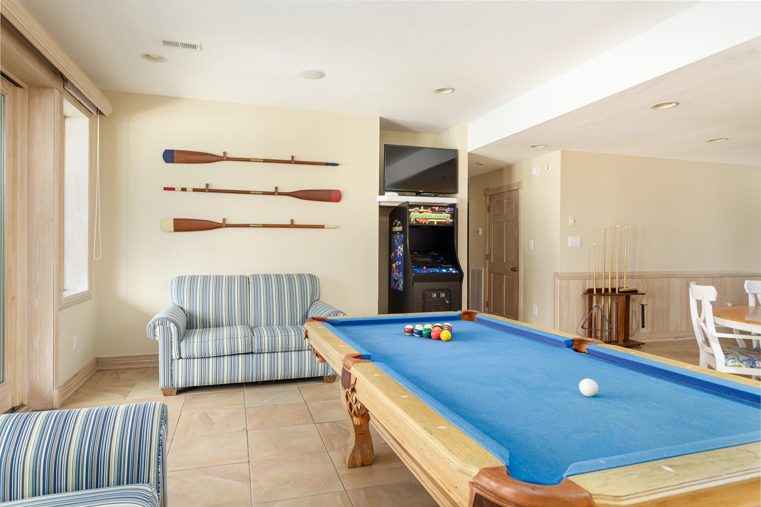 Rec room with pool table, game table and kitchenette with full-size refrigerator; double laundry; garage.