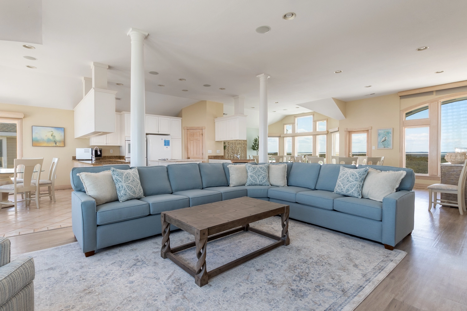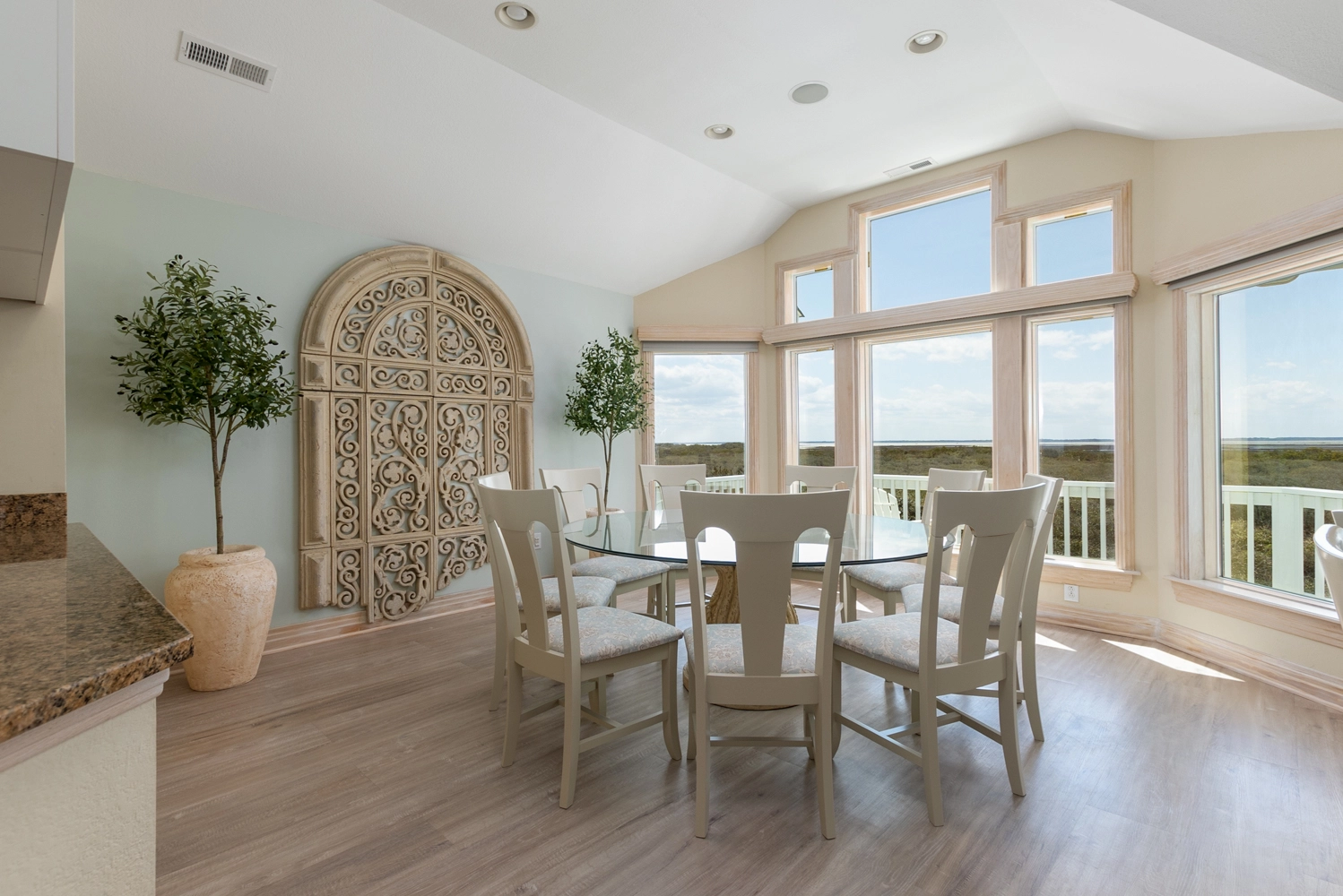 "The layout of this home fit our 4 families very well we loved the top floor open layout and round tables . It was a great entertaining kitchen. The location in pine island is what we love there was gorgeous views everywhere you looked. The previous renters were smokers and left full ashtrays of cigarettes on the decks outside, while this is not the owners fault i think things might get missed on the cleaning company due to lack of help.Overall the place was buggy, there was layers of bugs dead around all of the doors and windows on the outside. This made sitting outside on the deck chairs impossible due to the bugs. There was some water damage that the owners will need to address on the front bay window and door. Didn’t affect our stay but don’t want the house to be damaged. The beach access is very close, minimal steps. we didn’t have towels when we first arrived but Twiddy took care of the issue efficiently and promptly."