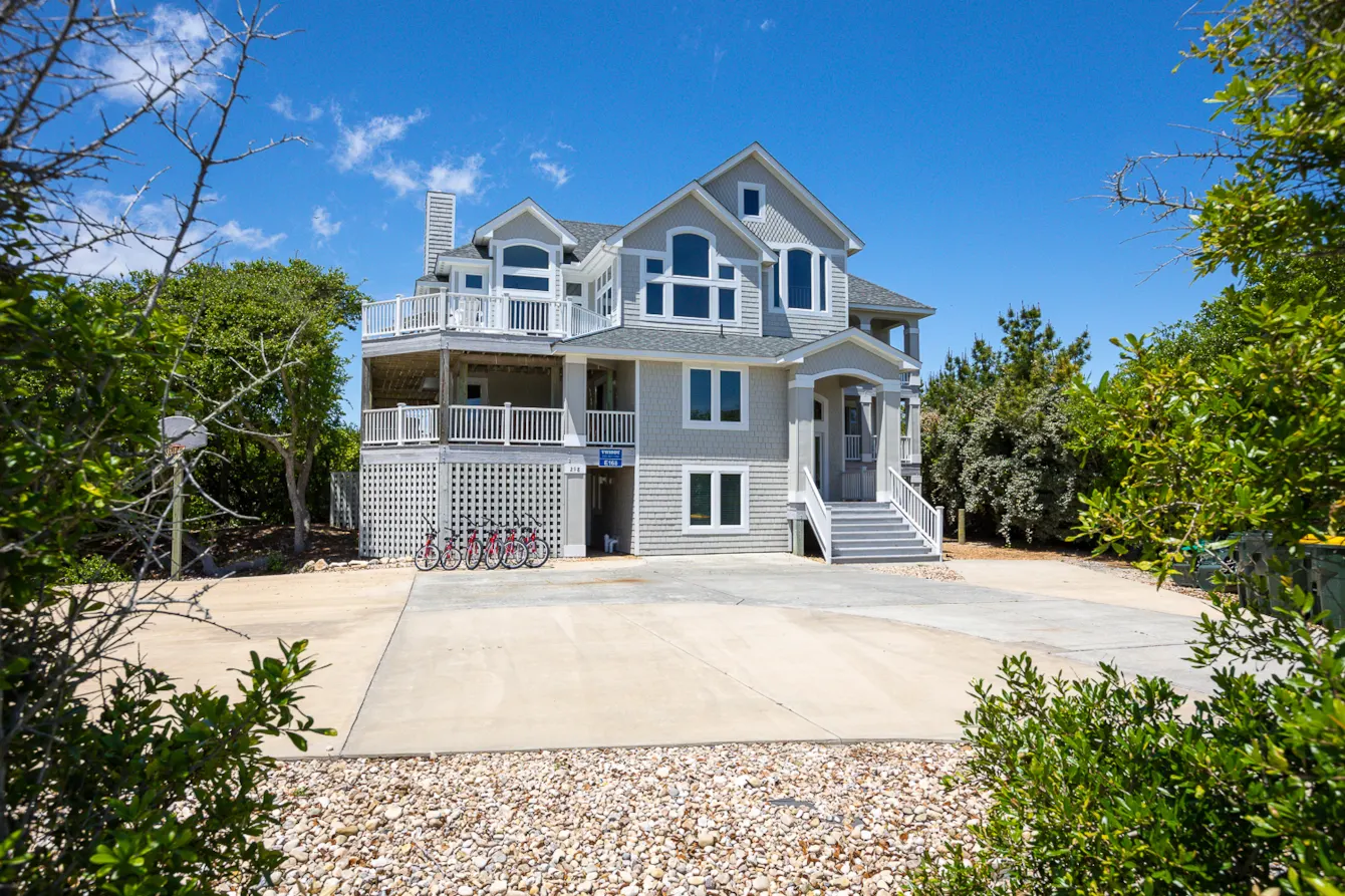 "This is our first year in this home. We had stayed in several homes over the last 15 years but as our families grew we had to move on to other homes. This past year we had a new addition which will be the families last and we needed to find a home with 9 bedrooms. This house checked all our boxes and it is also cosmetically updated inside and out. The owners redid the pool and chairs and there is a really cool outside cabana with a TV and bar. The outside shower could fit a whole family! The beach access is literally across the cul de sac from the house and the walkway is new, wide, and safe. Also a plus being in Pine Island, a few miles from Harris Teeter and Timbuck II. The kitchen has 2 of everything (microwave, fridge/freezer, stoves/oven, microwaves, sinks, coffee pots, also very well stocked with everything you need. The upstairs also has a smaller living room with a sliding glass door that serves great for us as playroom/Kids TV watching area. The basement has a pool table with TV and separate area with couches and another TV. The front deck access has beautiful views of the ocean as well as a great place to sip your morning coffee. We also lucked out on weather on only had rain intermittently one day! We had puzzles to keep us busy on that day. This will now be our lifelong OBX home and we have already reserved for next year!"