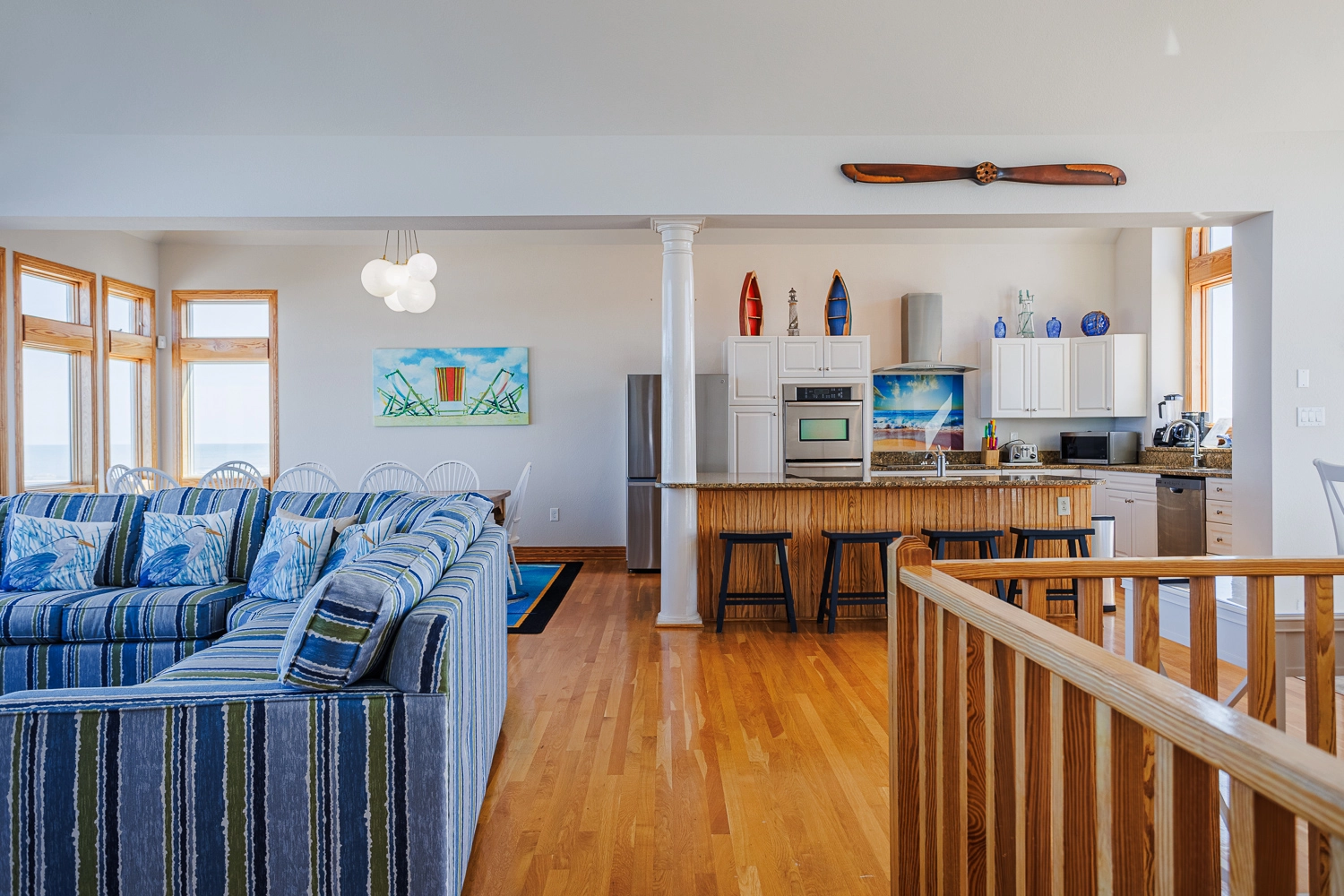 Ocean Sound is one of the select oceanfront homes located on a single row of houses where you will enjoy uninterrupted sunrise and sunset views of the Atlantic Ocean and the Currituck Sound from the open plan top floor. Wake up to the sound of waves and soak in spectacular views from the floor to ceiling windows in this 6-bedroom ocean front retreat. Designed for comfort, privacy, and breathtaking natural beauty, this home offers direct access to the beach via a private walkway and, with no public beach access nearby, offers an uncrowded shoreline right on your doorstep.