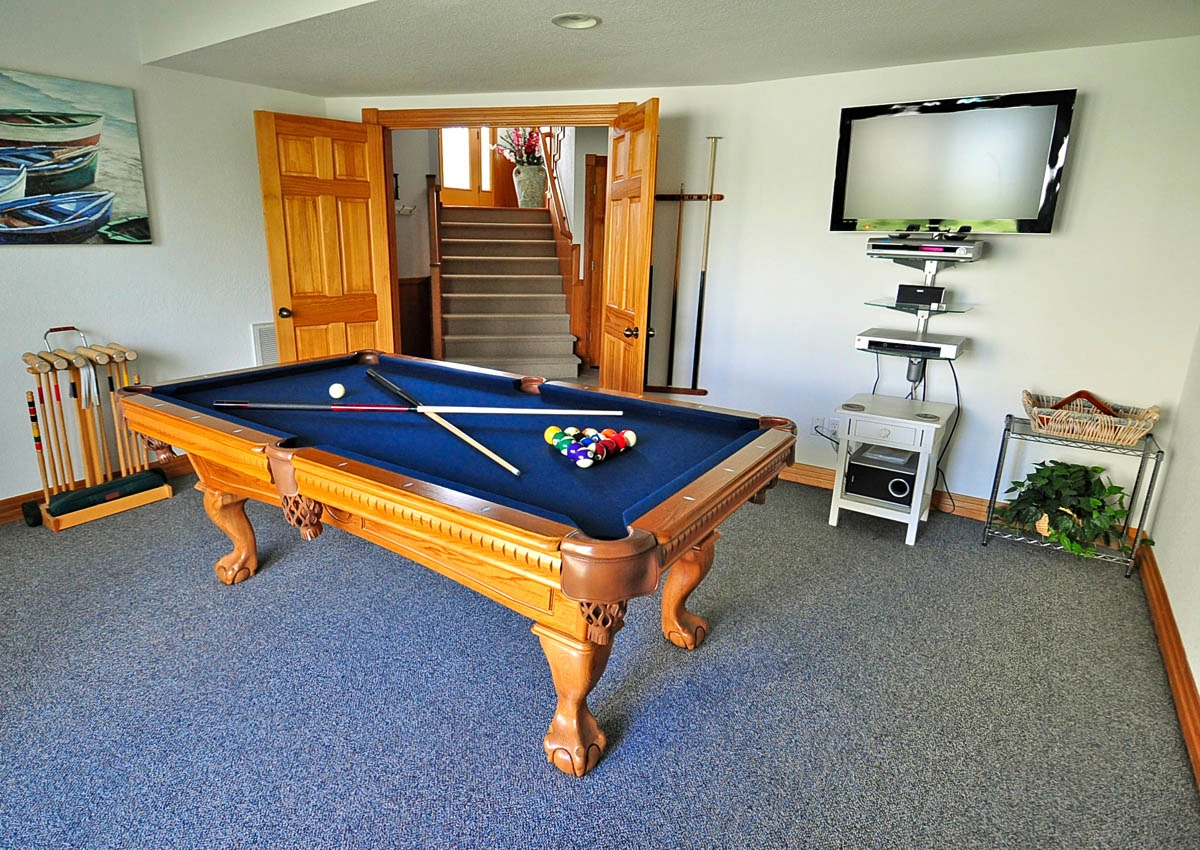 Rec room with pool table and home theater system; den (QSS) with kitchenette, wet bar and refrigerator; laundry.