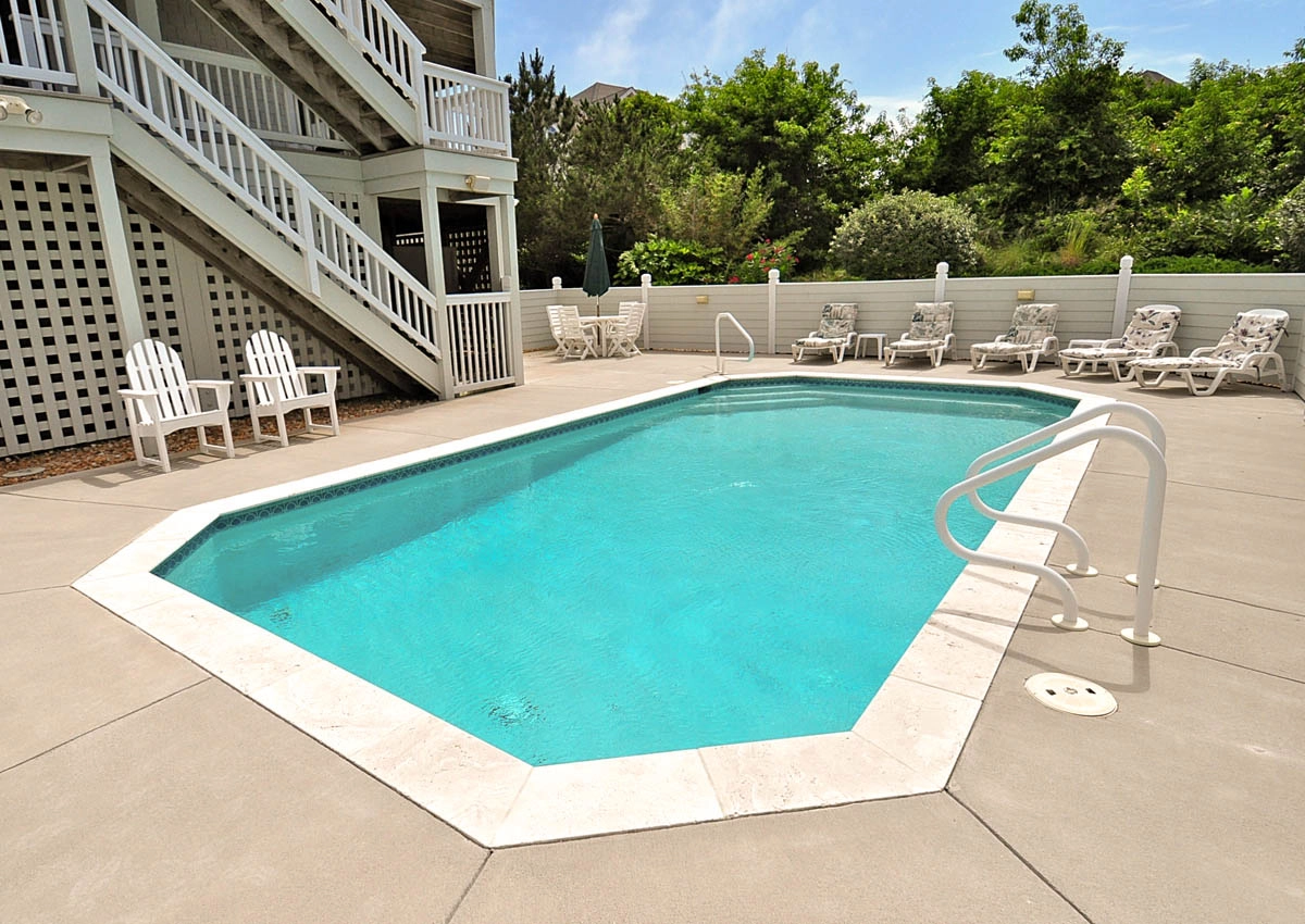 Private pool, hot tub, gas fireplace, gas grill, basketball goal, enclosed outdoor shower/dressing room, professionally landscaped yard, short walk to community tennis courts, and the community walkway that leads to the beach is accessible from the private pool area.