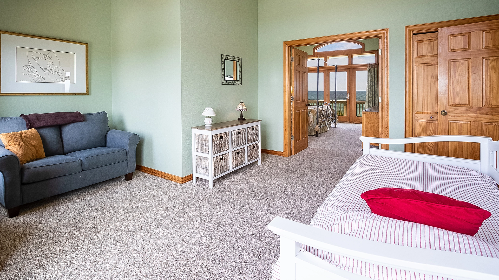 "All the rooms had lovely furniture; all the beds were comfortable; bathrooms were large and updated; every room had its own bathroom; the bunk rooms looked just as good as every other bedroom and were roomy enough; the kitchen was well stocked and had great appliances and ice maker; the driveway was large enough to park a lot of cars easily without having to move them around; both living rooms were comfortable and had enough seating for everyone; the view was astounding; everything was very clean and well kept"