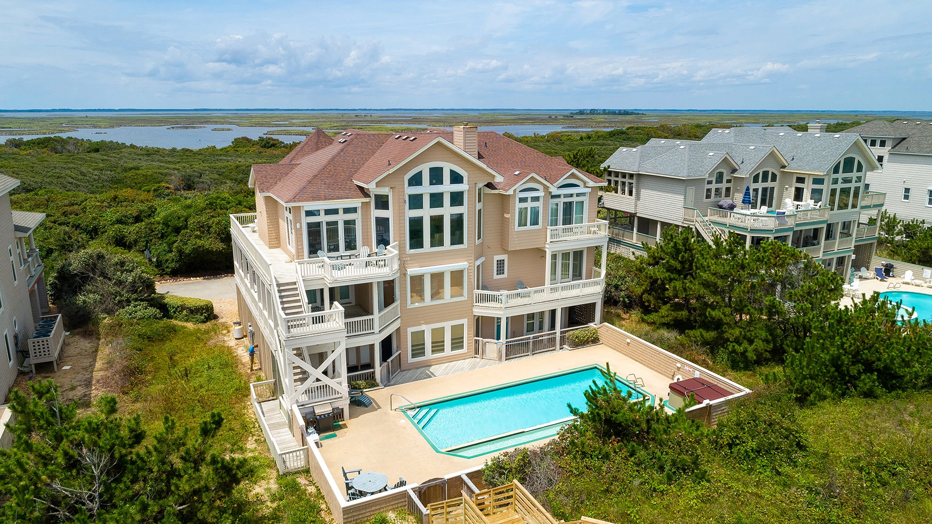 "This home is just plain incredible!! Our family had an incredible week at this home! The elevator was a big plus!! I was so amazed at the kitchen! 2 sinks, 2 dishwashers, the ice machine, huge refrigerator, and freezer!! Plenty of serving dishes, utensils, everything you would need!! We were amazed that we were able to use the pool as the weather was amazing and warmed up enough to use it! Each room has its own flat screen TV and private bathroom, wow another treat! The view was phenomenal both oceanside and bayside. Saw wonderful sunrises and sunsets! The porpoises can by each day around 9:15 am. Beds were very comfortable and each room had a fan. The walk from the house to the bed was also wonderful. Nice platform at top of the steps with a great view. The upper and lower shower when returning to the home from the beach really helped keep the sand out of the house! The grill worked great and we accessed the many puzzles and games during the week! Of course the pool table and foosball table was enjoyed by the guys!We will most definitely stay here again. This was our 6th rental in Corolla and by far the best home we have stayed at. Thank you to the owners for providing such a lovely home for our family vacation!!"