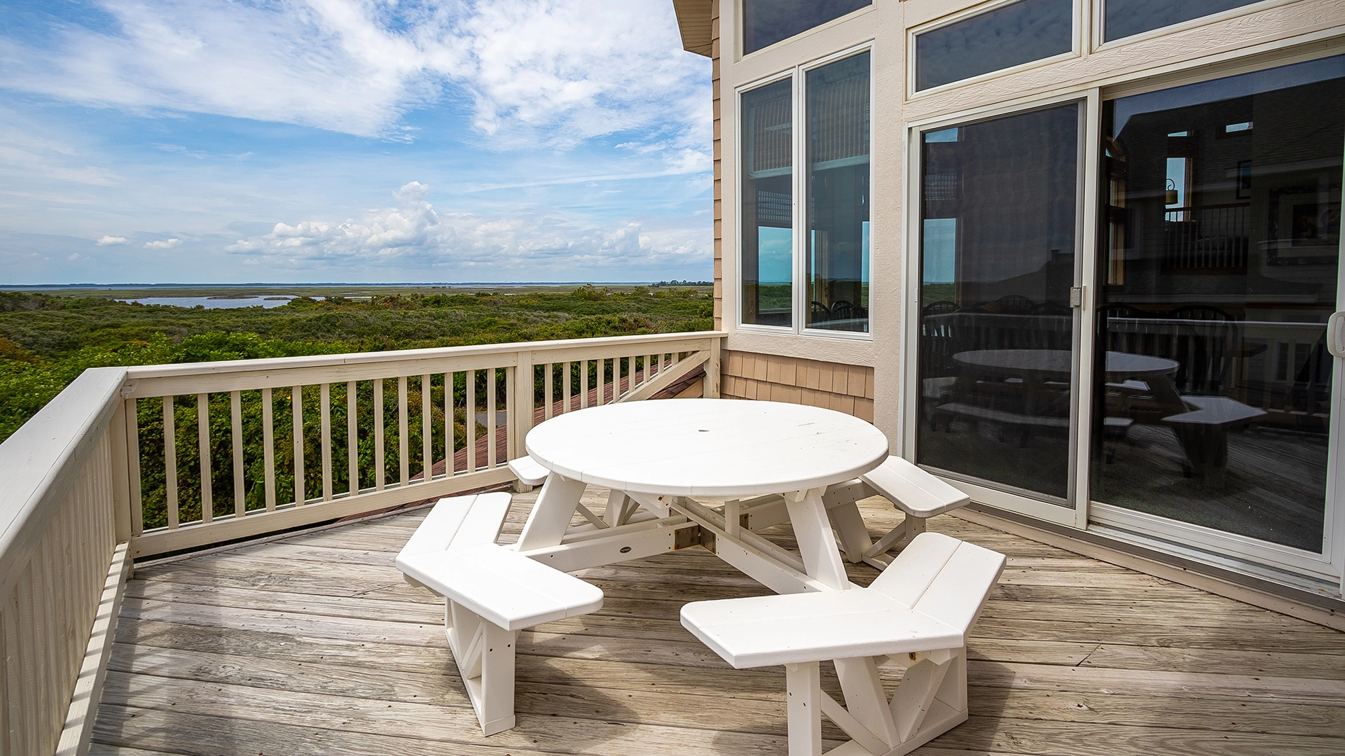 "This home had the most incredible views out both sides! Expansive ocean views out the back and incredible sound/marsh views out the front. Just stunning! Very comfortable living space too. We especially loved the swivel/rocking chairs in front of the picture window. Wish there was a bit more deck space-not enough chairs or space for all of us to hang out on the top floor deck, and no outdoor table large enough for an outdoor meal for more than six people. The kitchen was great with two cooktops/ovens, two sinks, and two dishwashers, however the pots and pans have seen better days."