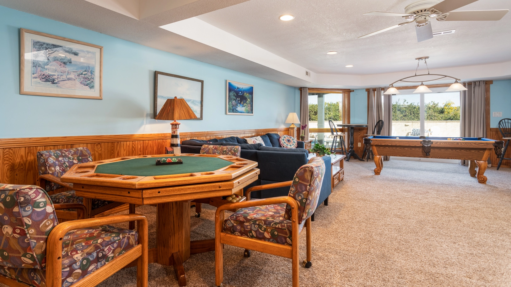 Rec room with pool table, bumper pool table, card table, and kitchenette; ping pong table in the garage; laundry.