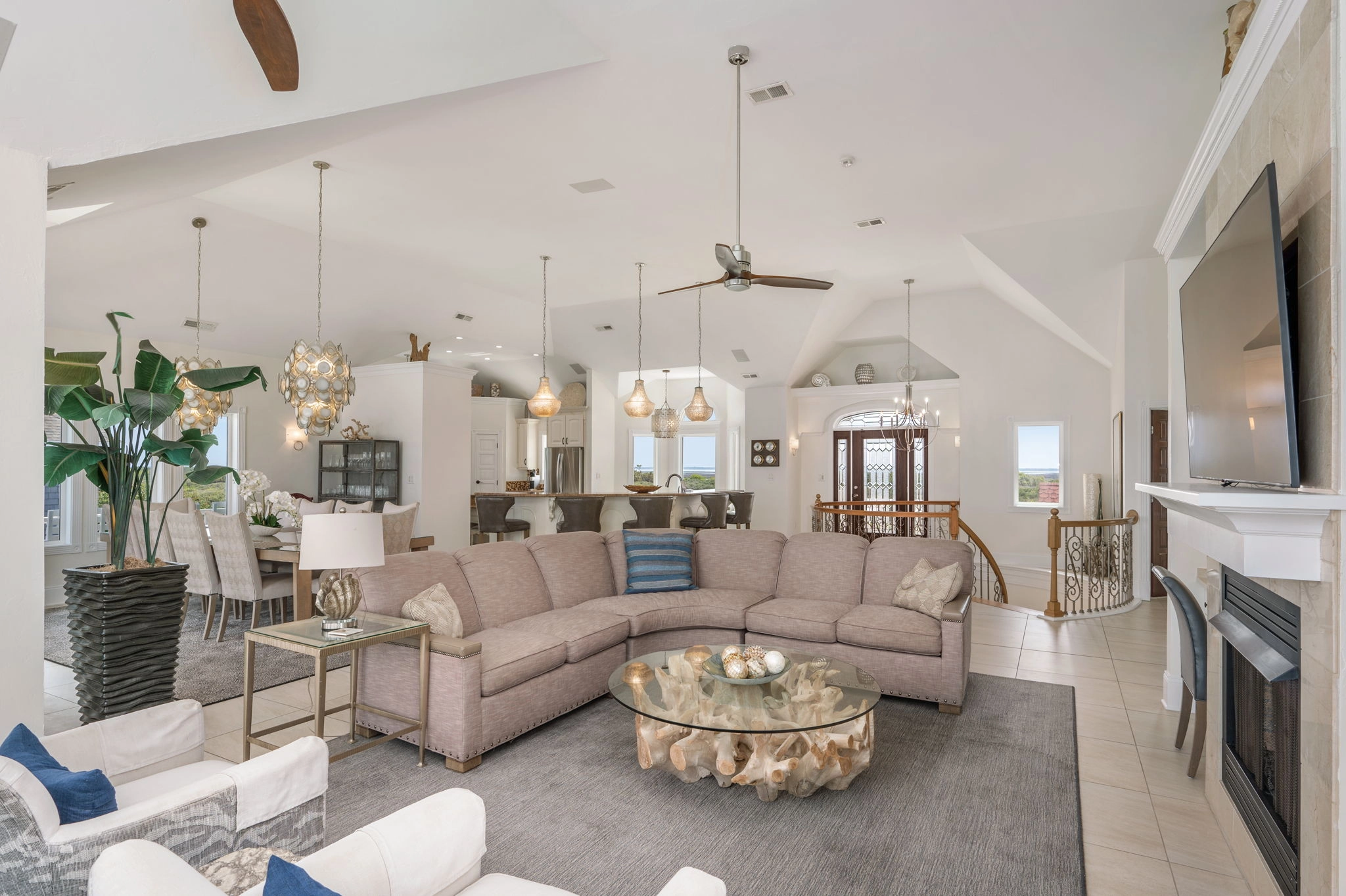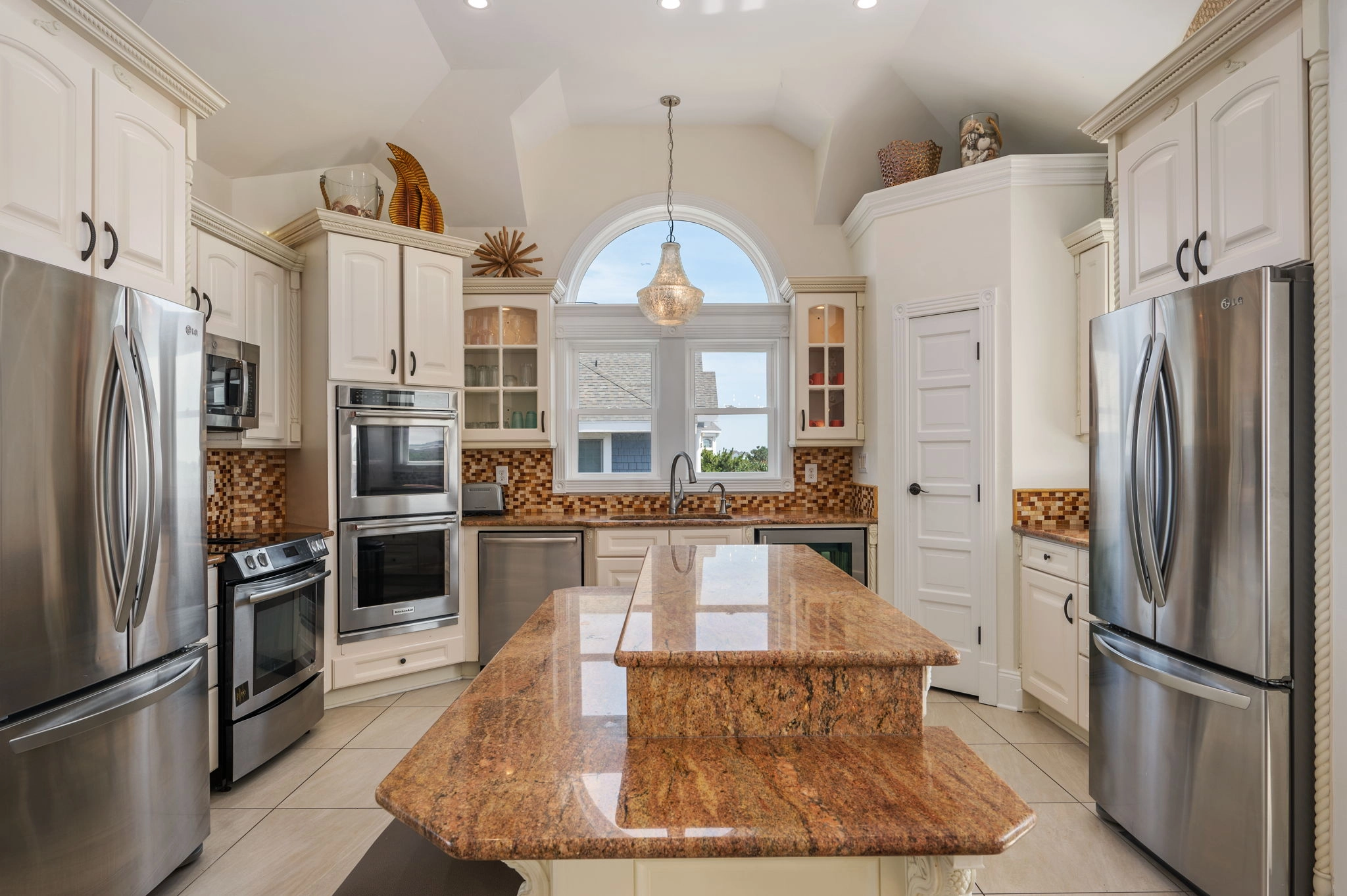 Great room with gas fireplace; kitchen with three ovens, two cooktops, two refrigerators, two dishwashers, and wine cooler; dining area; laundry.