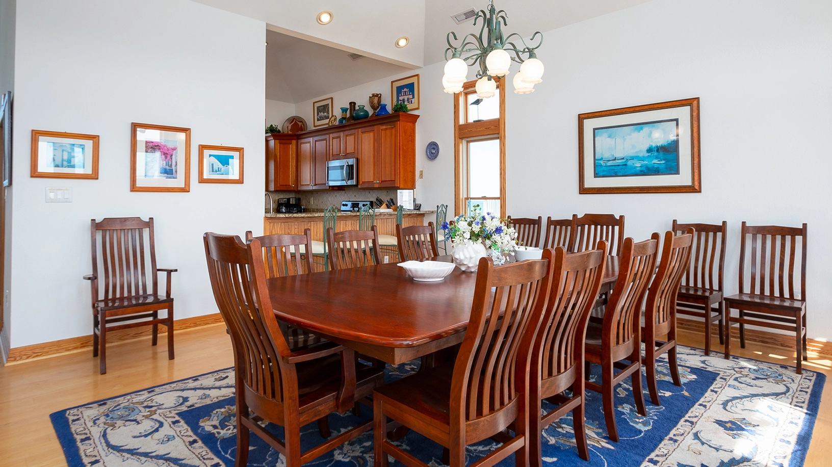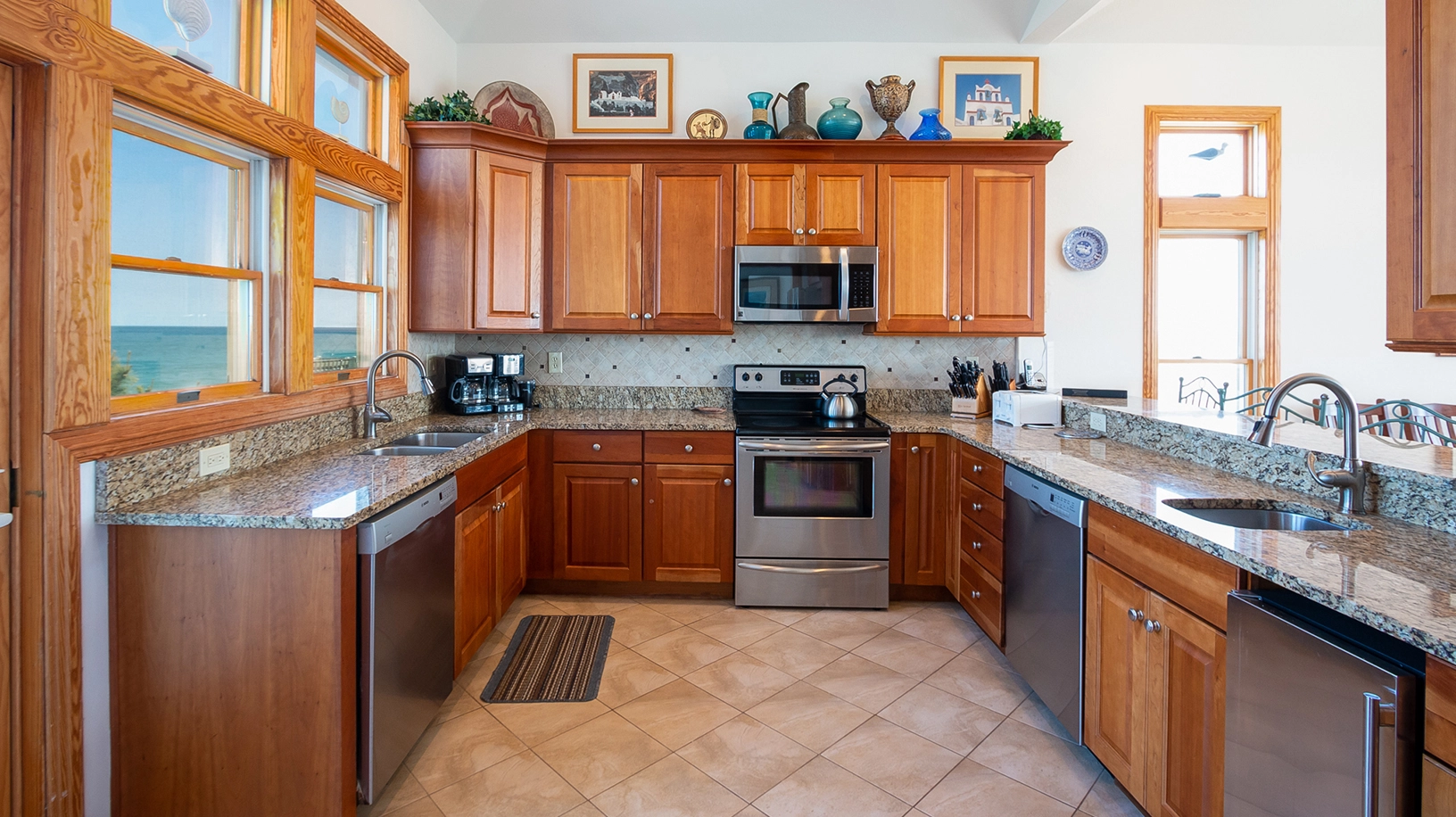 "Large kitchen, ice maker and two dishwashers. Dining area and table to accommodate all. Spacious living area with comfortable seating. Awesome views of the ocean and sound."