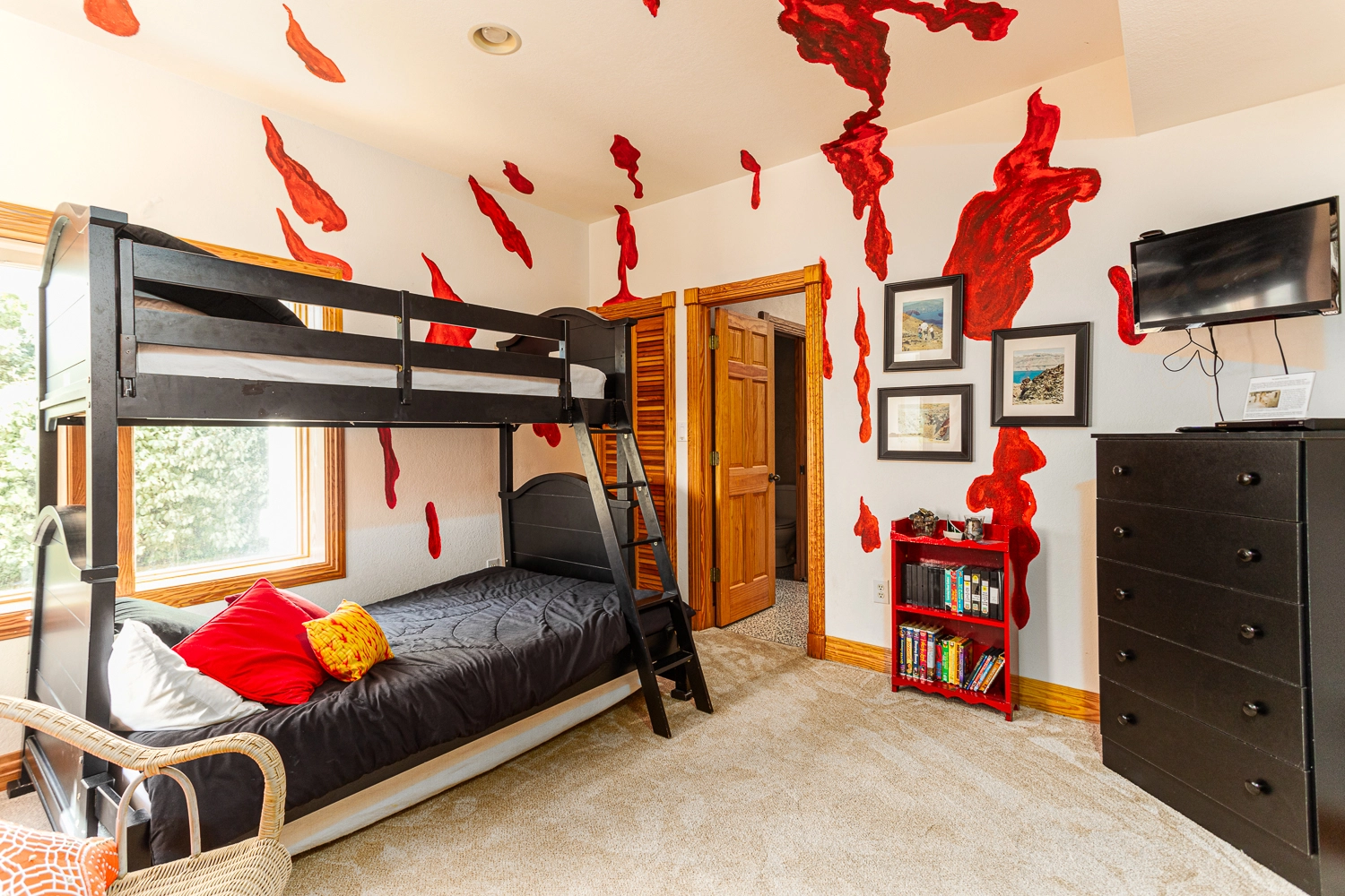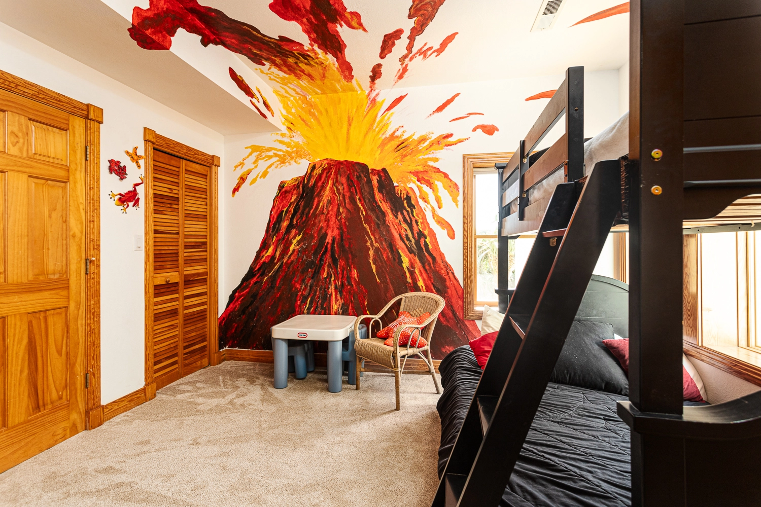 Great room with cathedral ceilings, hand-painted mural, gas fireplace; well-equipped kitchen with granite countertops, and two dishwashers; dining area.