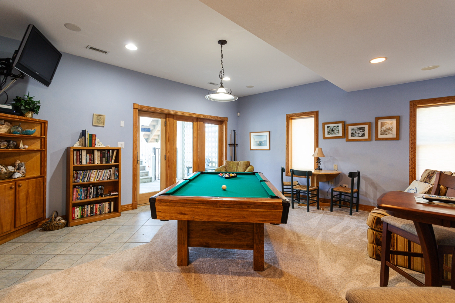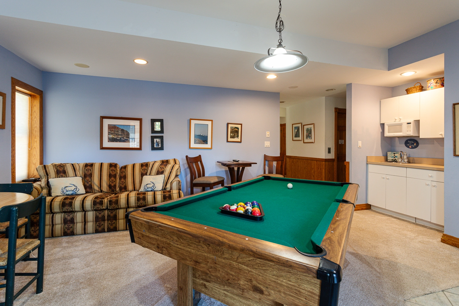 Rec room (QSS) with pool table and wet bar with microwave; laundry.