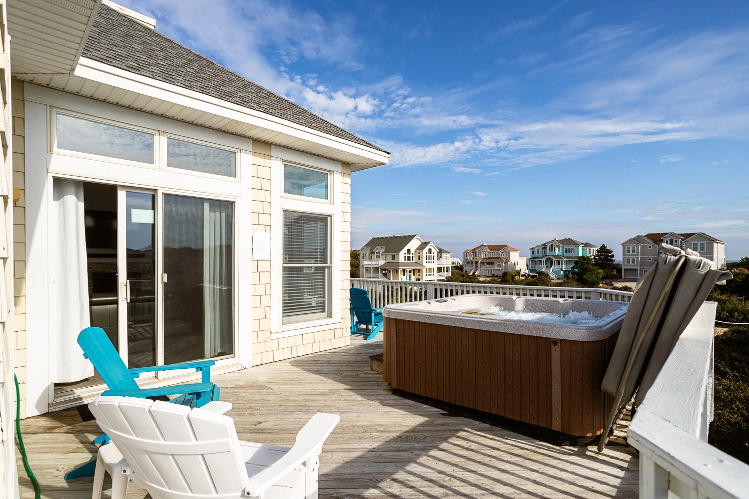 "Hot tub on the top level with the amazing view. Wrap around deck."