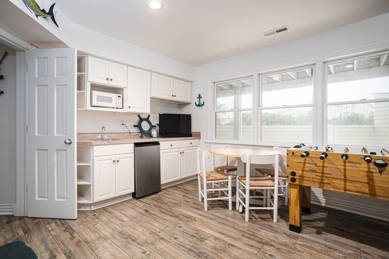 Rec room with foosball table, kitchenette with mini-refrigerator and microwave; laundry.