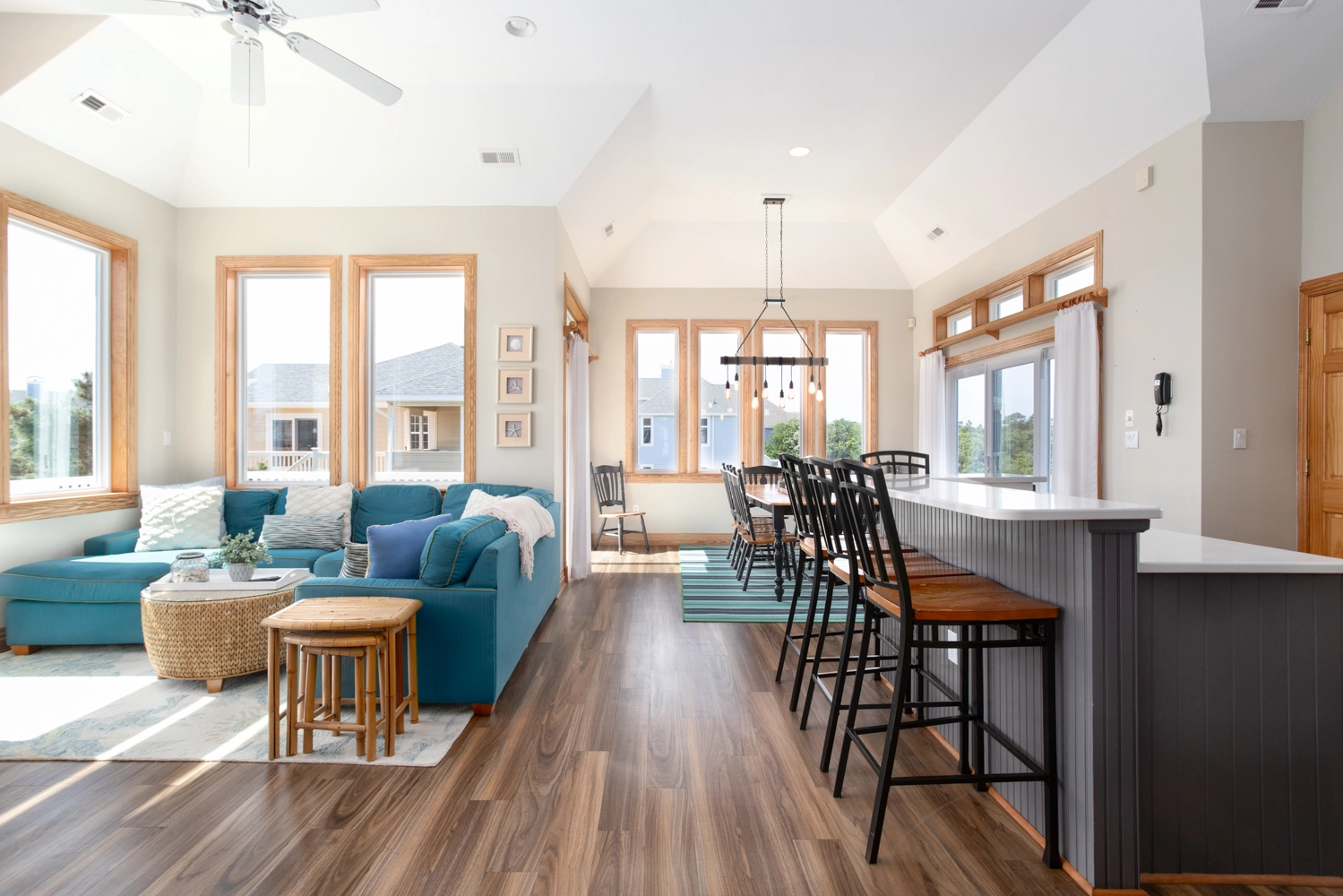 Great room with gas fireplace; kitchen; dining area.