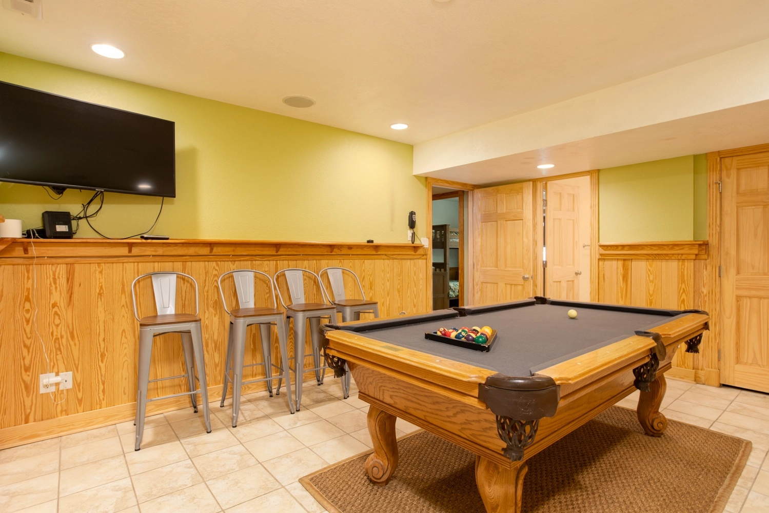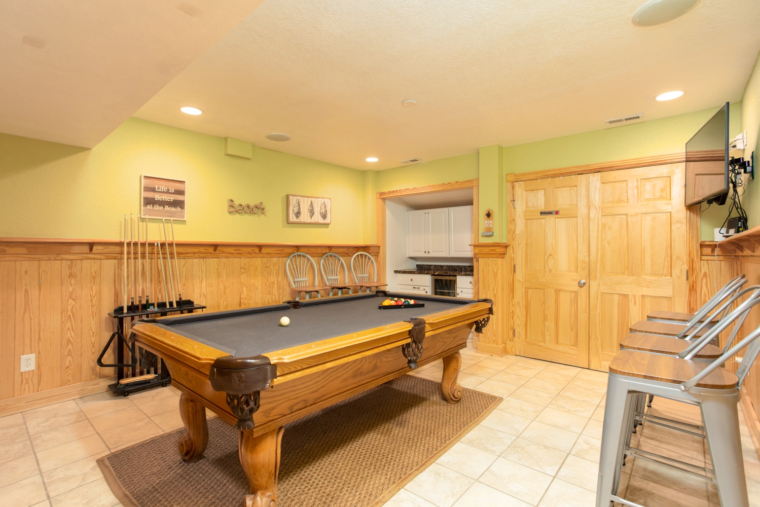Rec room with pool table and TV; laundry.
