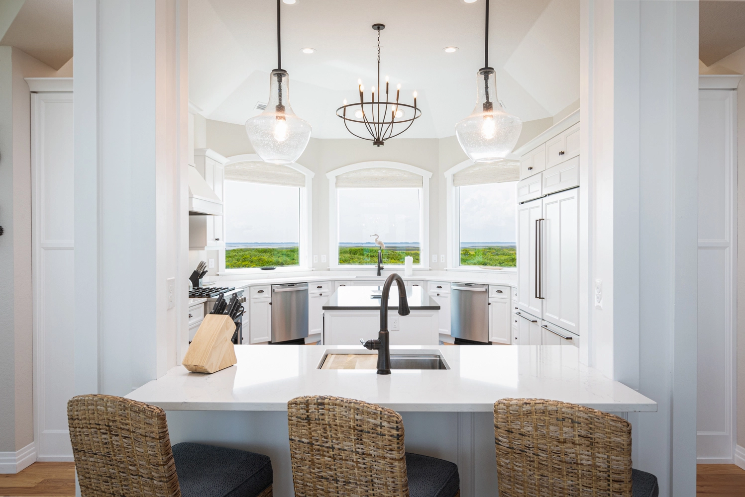 In the great room on the top floor of the home, gorgeous views are available no matter which direction you look. Relax in the comfortable living area, which features floor-to-ceiling windows that allow the beautiful ocean view to fill the room. A desk facing the ocean is available if checking in with work or school is required during your stay. Refreshments are never far away, as there is a wet bar provided in the living area. Across the room, the well-appointed kitchen is a chef’s dream. Large picture windows facing the sound allow you to gaze out at the marsh while preparing meals or cleaning up. Big family meals can be prepared with ease, as the kitchen is equipped with two ovens, a six burner gas stove, two refrigerators, and plenty of counter space, including a kitchen island. The elevator assists with getting groceries from the ground floor up to the kitchen on the top level. A separate kitchen island includes a second sink and barstool seating, perfect for a quick breakfast or snack before heading outside. Two dishwashers are helpful when it’s time to clean up after family meals. Two separate large dining areas are available so the entire family can have a seat at the tables. Just around the corner and up a few steps, the ship’s watch is another comfortable place to relax. Views of the ocean and the sound are available from the ship’s watch, making it a great place to catch a sunrise or a sunset. Natural light flows through the many windows, making the ship’s watch the perfect place to curl up with a book at any time of the day.