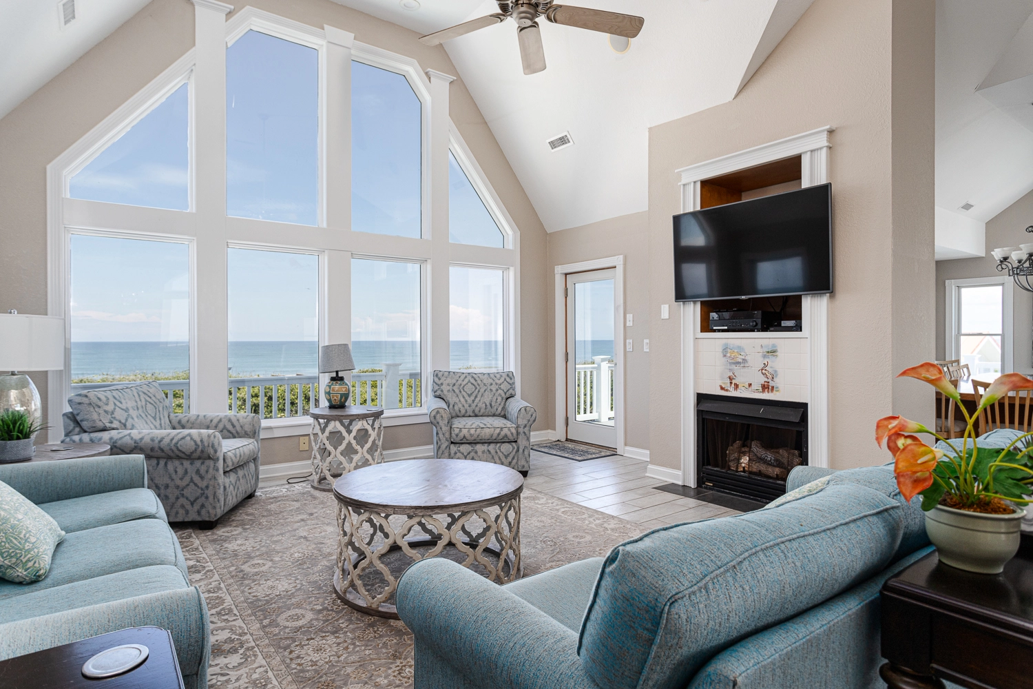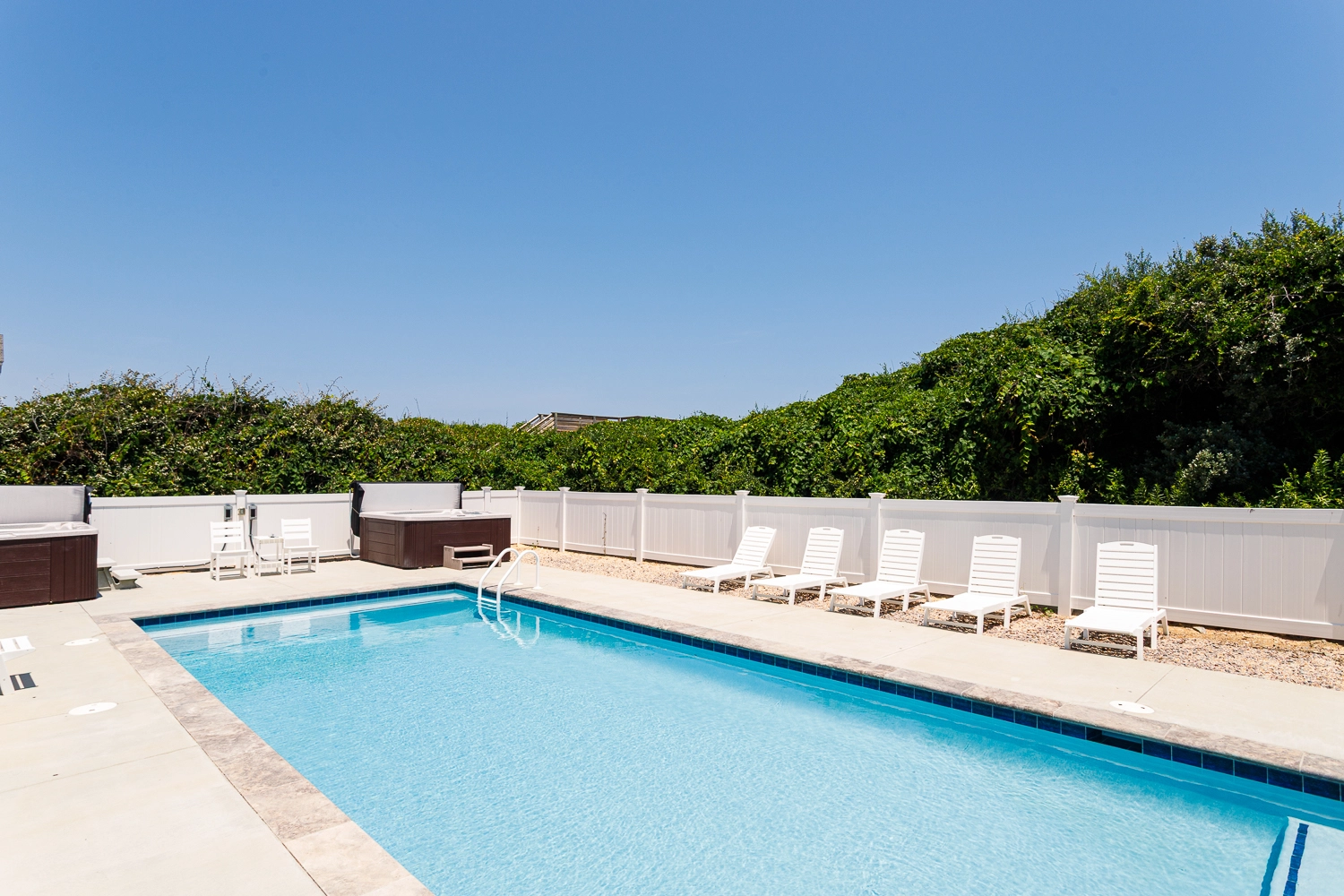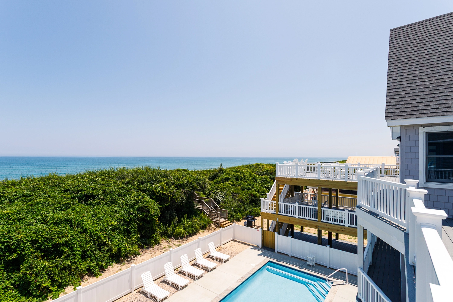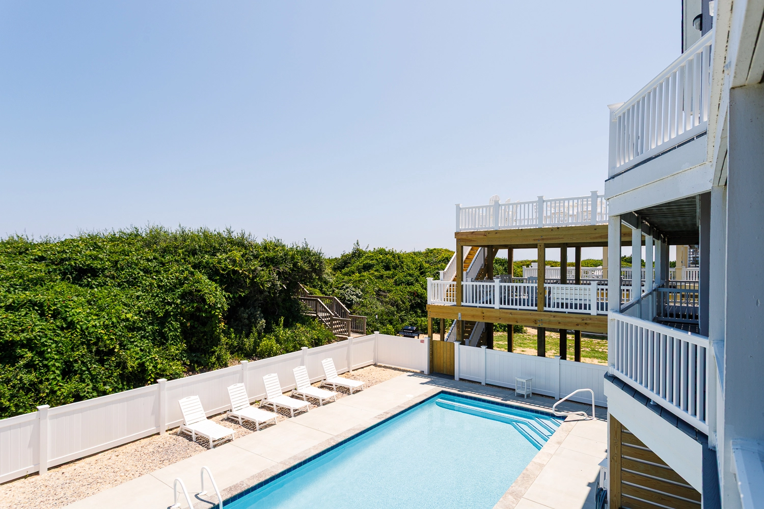 "With a view of both the sound and the sea, this house is in a league of its own. It has every feature you could want for a wonderful vacation. The unparalleled exclusivity of the Pine Island community provides peace and privacy we've found nowhere else. The house's expansive decks are not only practical and well-constructed, but they provide just enough shade on the pool for even the fairest of skin to enjoy. Of all the houses we've rented with heated pools, this one is the warmest and most consistent. Using the house's private walkway, it's just a short walk over the dunes to get down to the beach. The cabana service provides a extra level of convenience that we truly appreciate - alleviating the need to wrestle with a tent and chairs every day and saving additional room on the car ride down. Inside, the kitchen is equipped with every appliance you could want; and the theater room and elevator are a huge hit with our older guests! For a house so peaceful and far away from any noise, it's still close to the grocery store, ice cream shop, and anything else you could need. This was our second year in the home and we already can't wait to come back next year!"