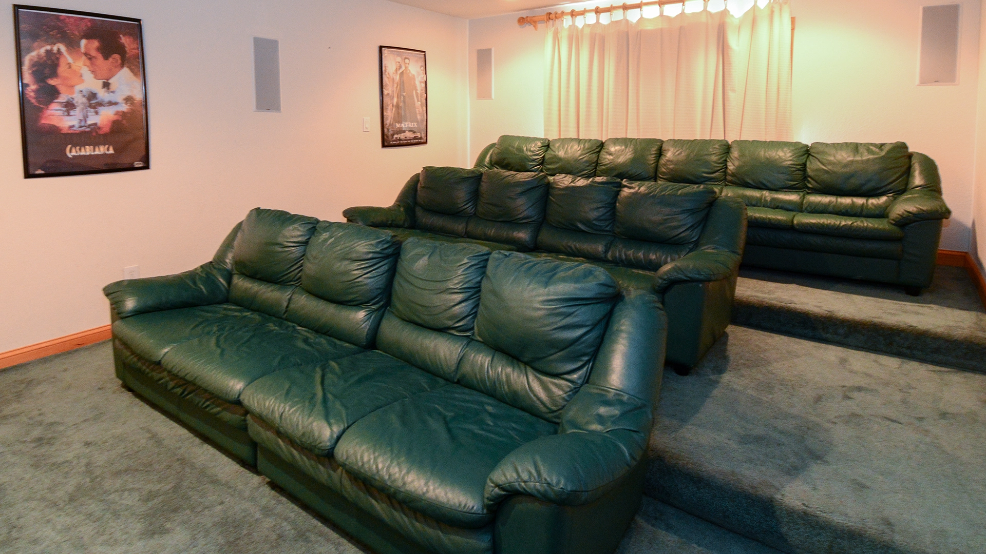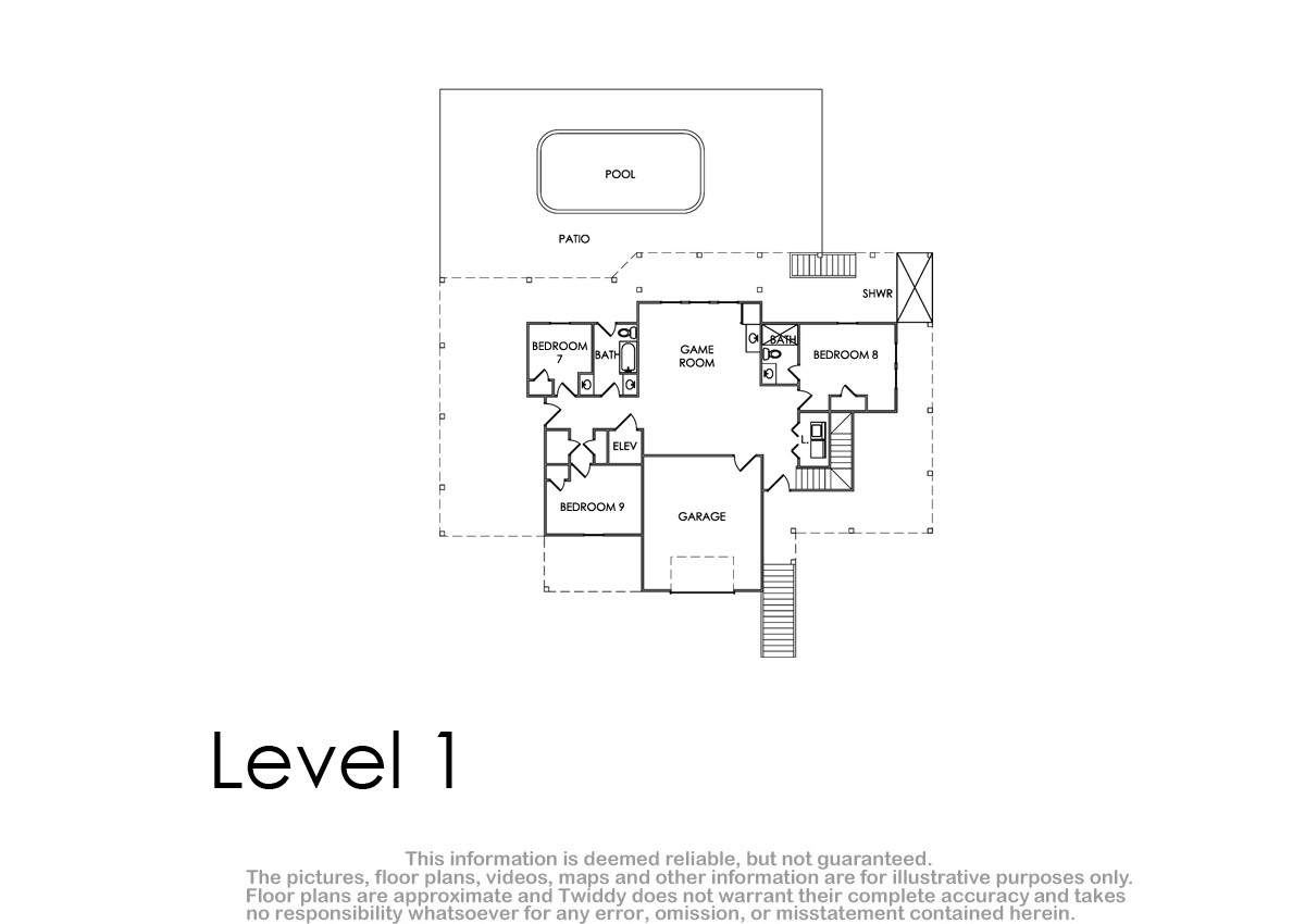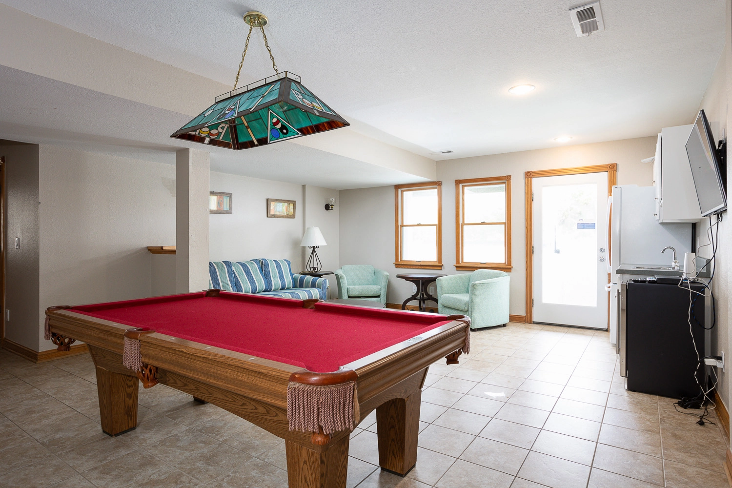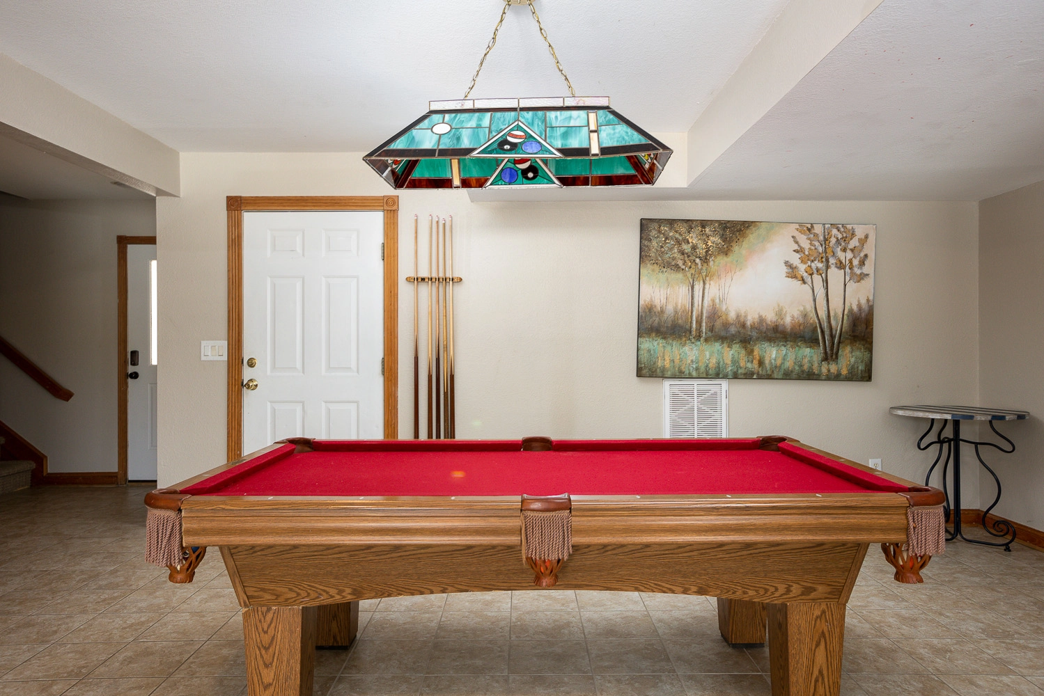 Game room with pool table, arcade game, wet bar, ice maker, full-size refrigerator; laundry; patio with gated private pool, two hot tubs, gas grill; garage.