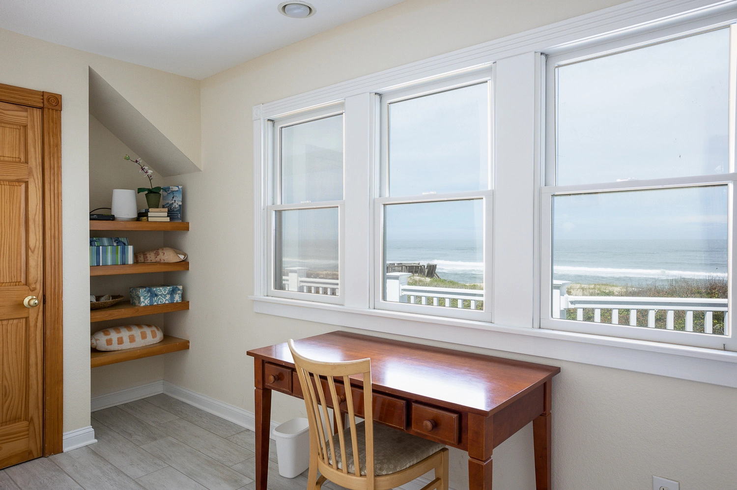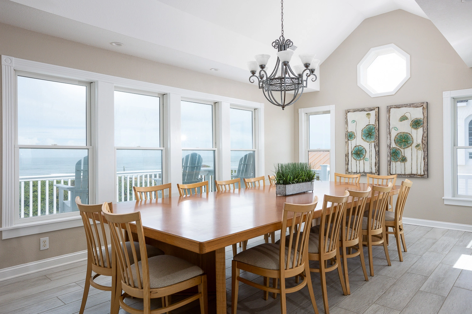 "Sunrise - Sunset offers a unique beach front experience. The large gathering area on the third floor features a fully equipped kitchen where multiple "chefs" can organize and prepare meals. The large dining table allows family and friends to come together at meal time to engage in discussion and share their daily plans and experiences. The table enhances communication among family and friends the old fashioned way. The seating arrangement in the sitting area faces both west and east so that visitors can admire both the sun rises and the sunsets. During our week we even were blessed with a beautiful rainbow. The house offers multiple places where individuals can be alone or in small groups. There is even a small "office" space on the third floor for those who might want to write or study. The porches and decks are expansive and inviting. We loved the foliage covered "dune berm" which served to protect the pool and hot tubs from the winds and rough surf. It also was a "hide out" for local wild life including deer and rabbits. Although our week was a bit rainy we enjoyed games and puzzles together and found time to discuss issues and resolve troublesome matters. It was literally the perfect house for our family and friends. to come together to rest and recharge."