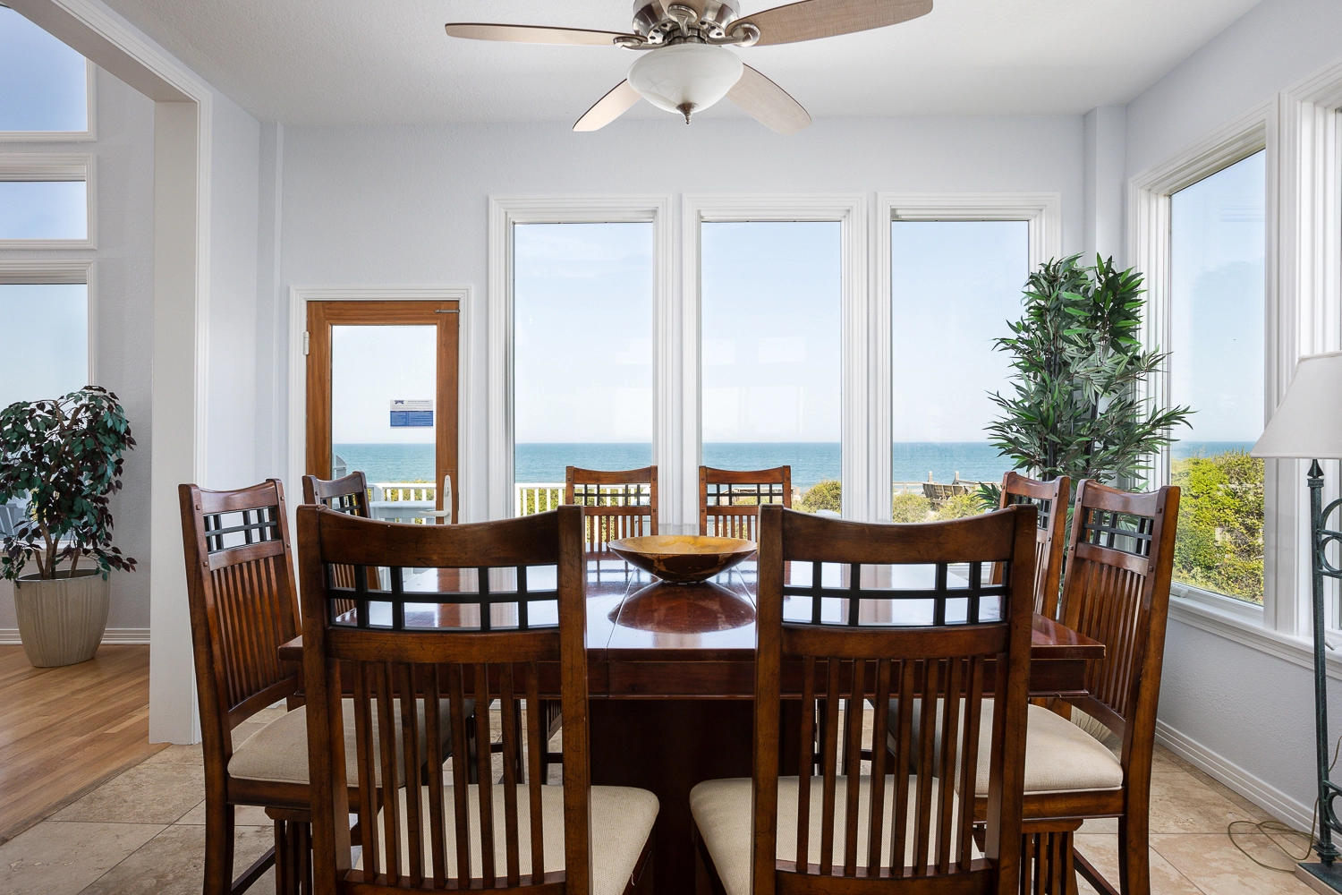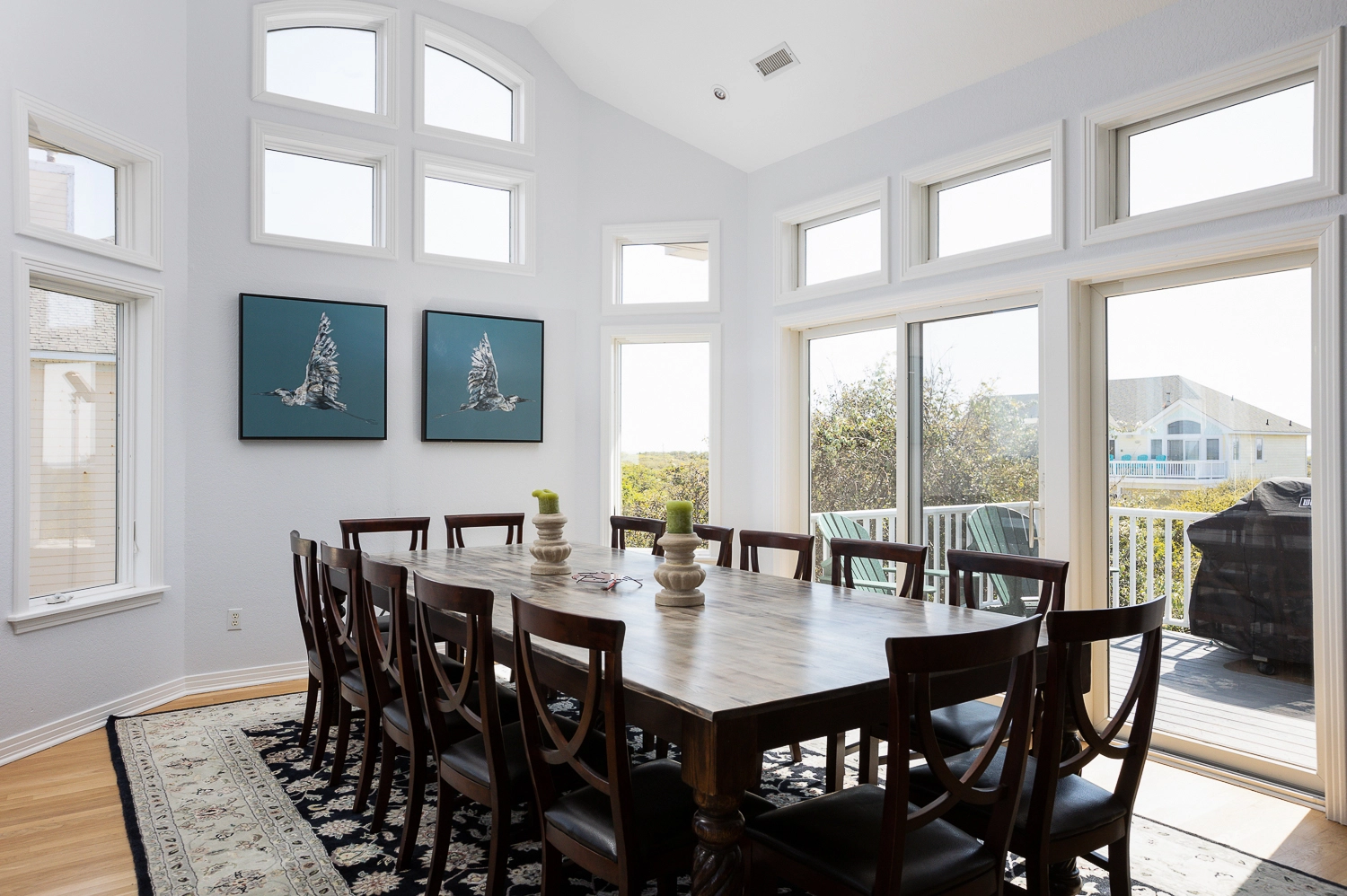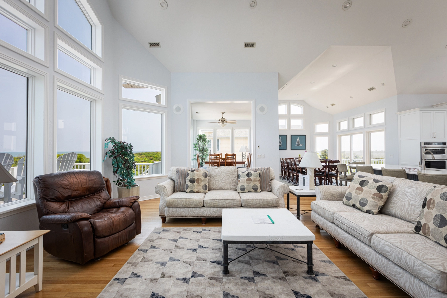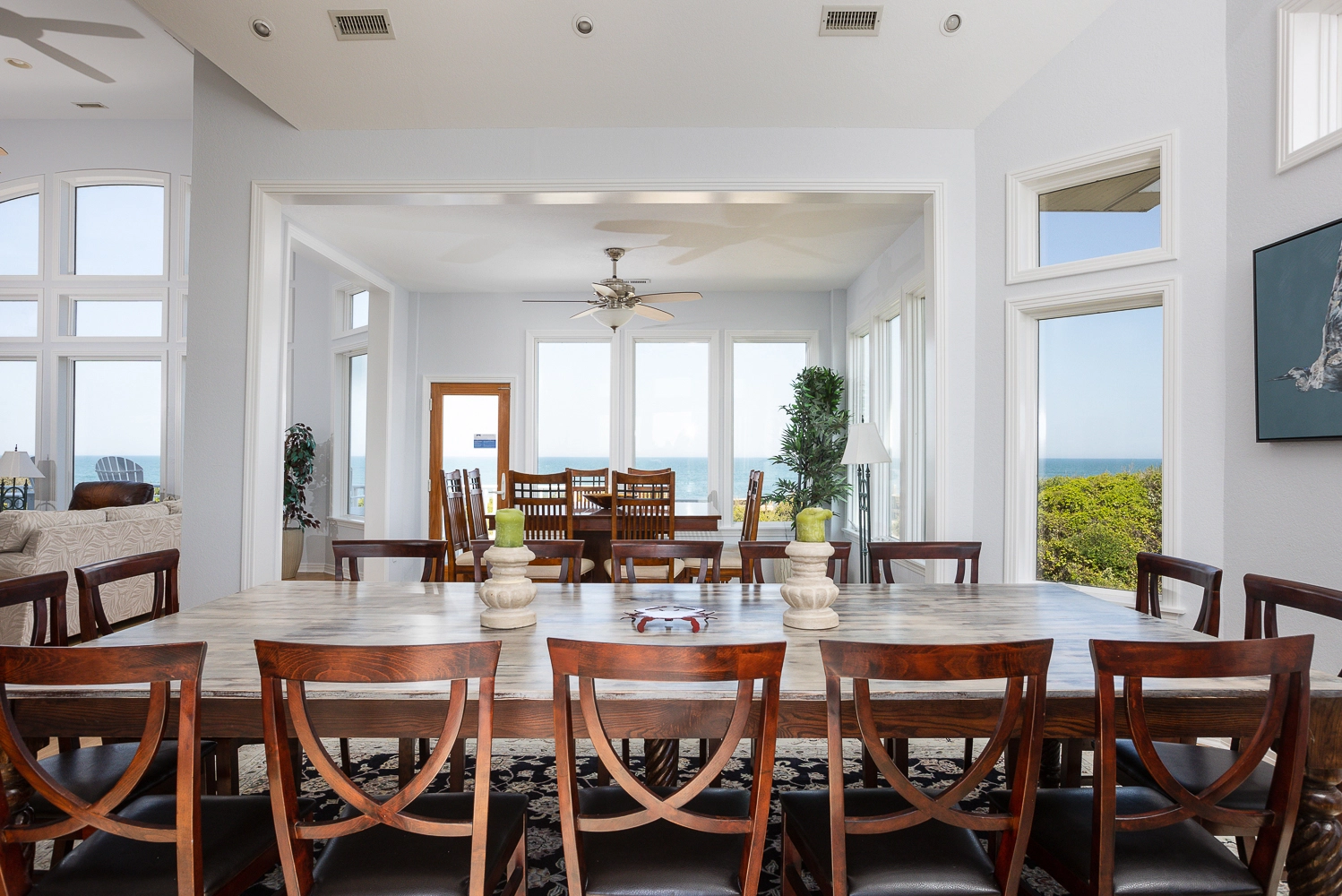 Great room; elegant kitchen with two ovens, two dishwashers, pantry and upscale cooktop; formal dining area with table seating for 14; breakfast bar with seating for 6; ocean view sunroom with additional dining area with seating for 8; both east- and west-facing decks; gas grill.