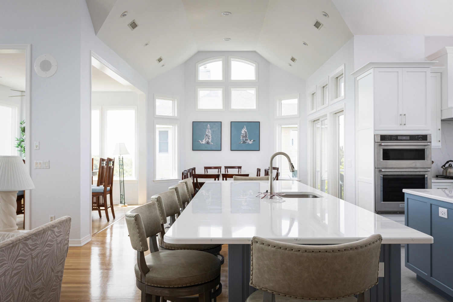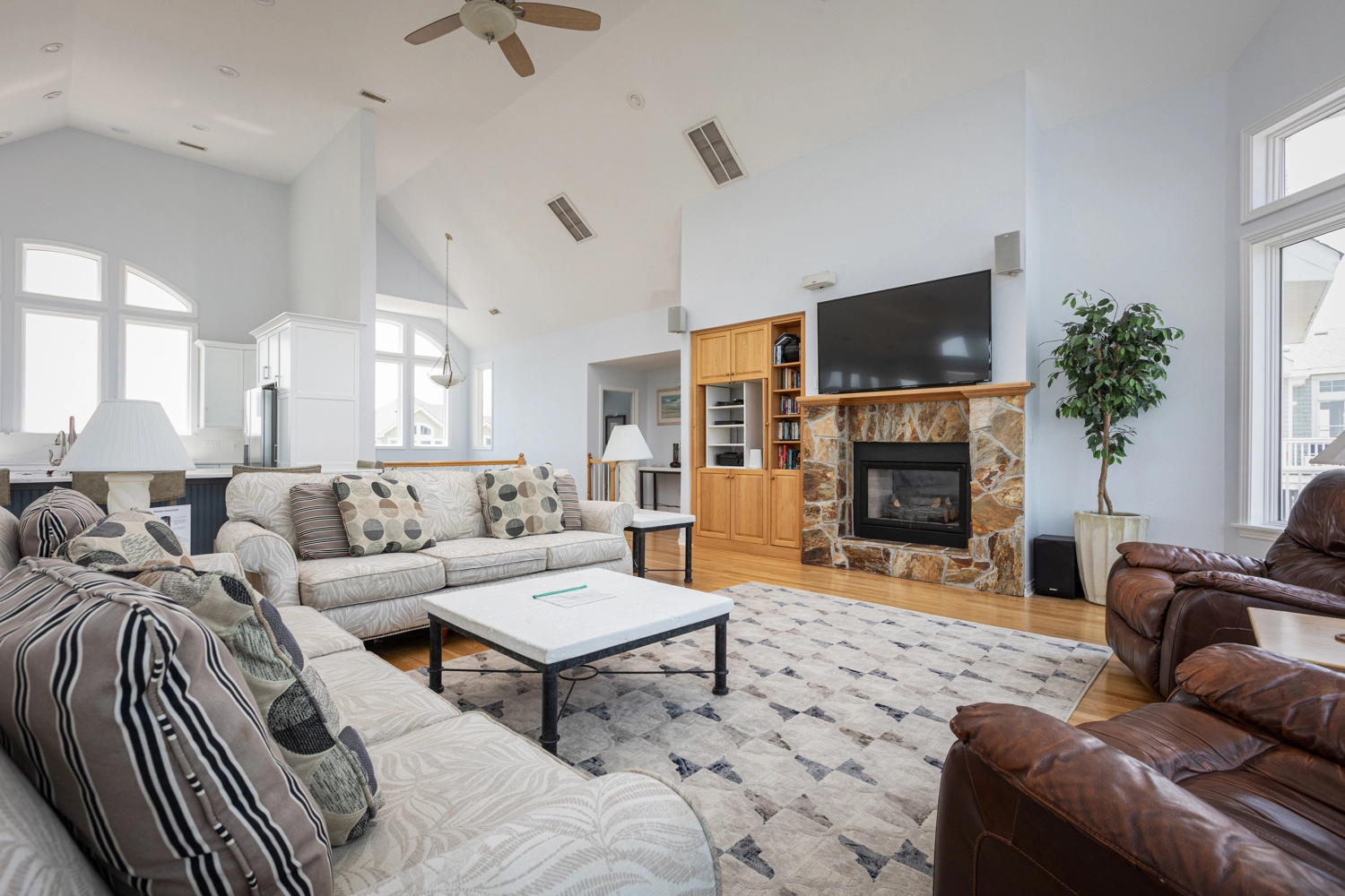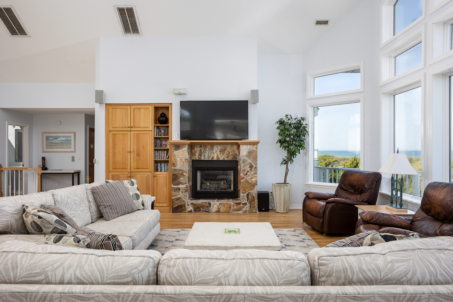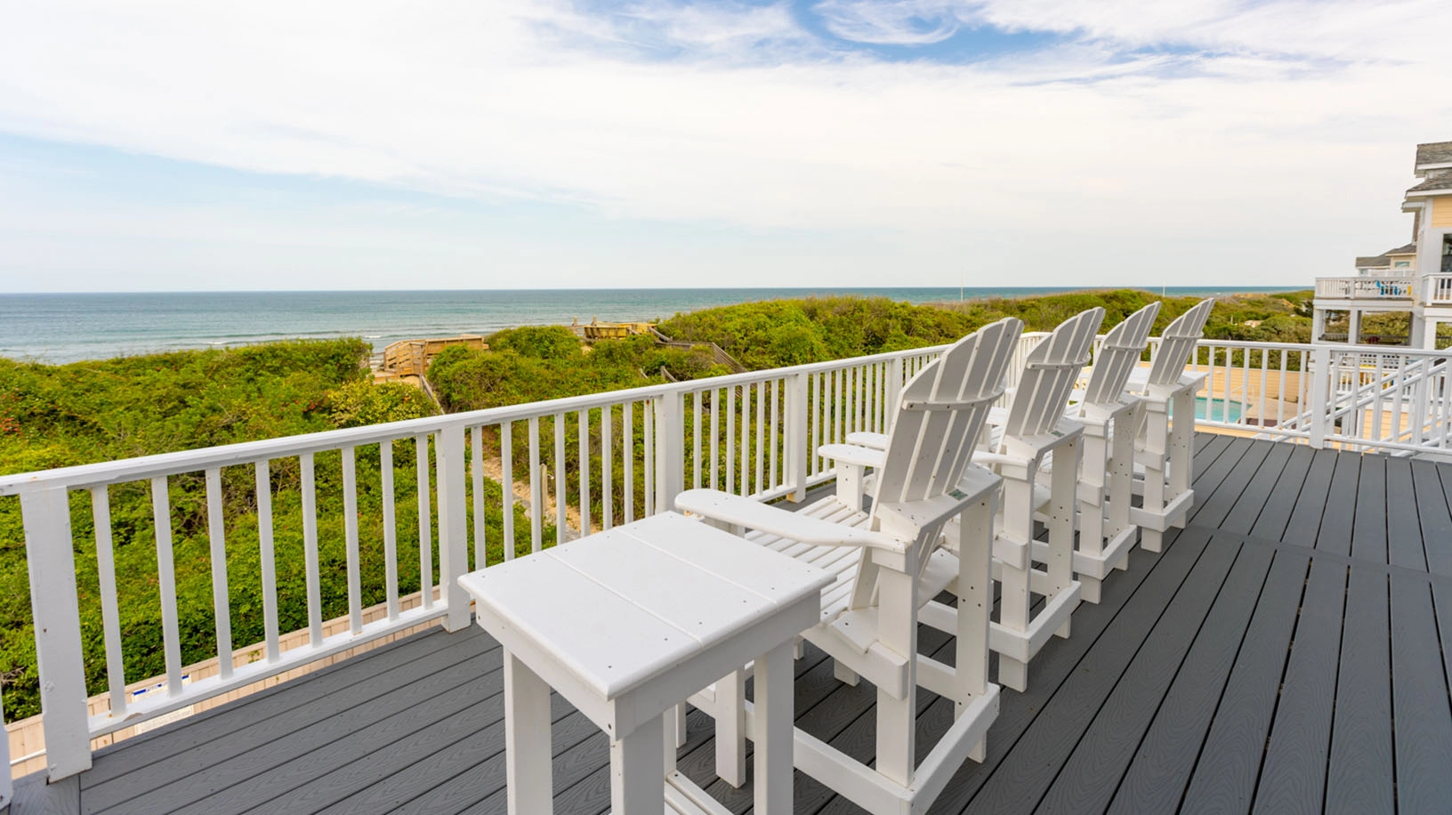 Great room; elegant kitchen with two ovens, two dishwashers, pantry and upscale cooktop; formal dining area with table seating for 14; breakfast bar with seating for 6; ocean view sunroom with additional dining area with seating for 8; both east- and west-facing decks; gas grill.