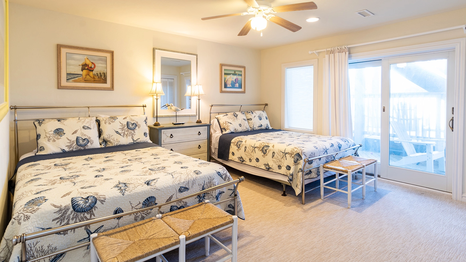 2 Queens, Semi-private bath, Standing shower, Deck access