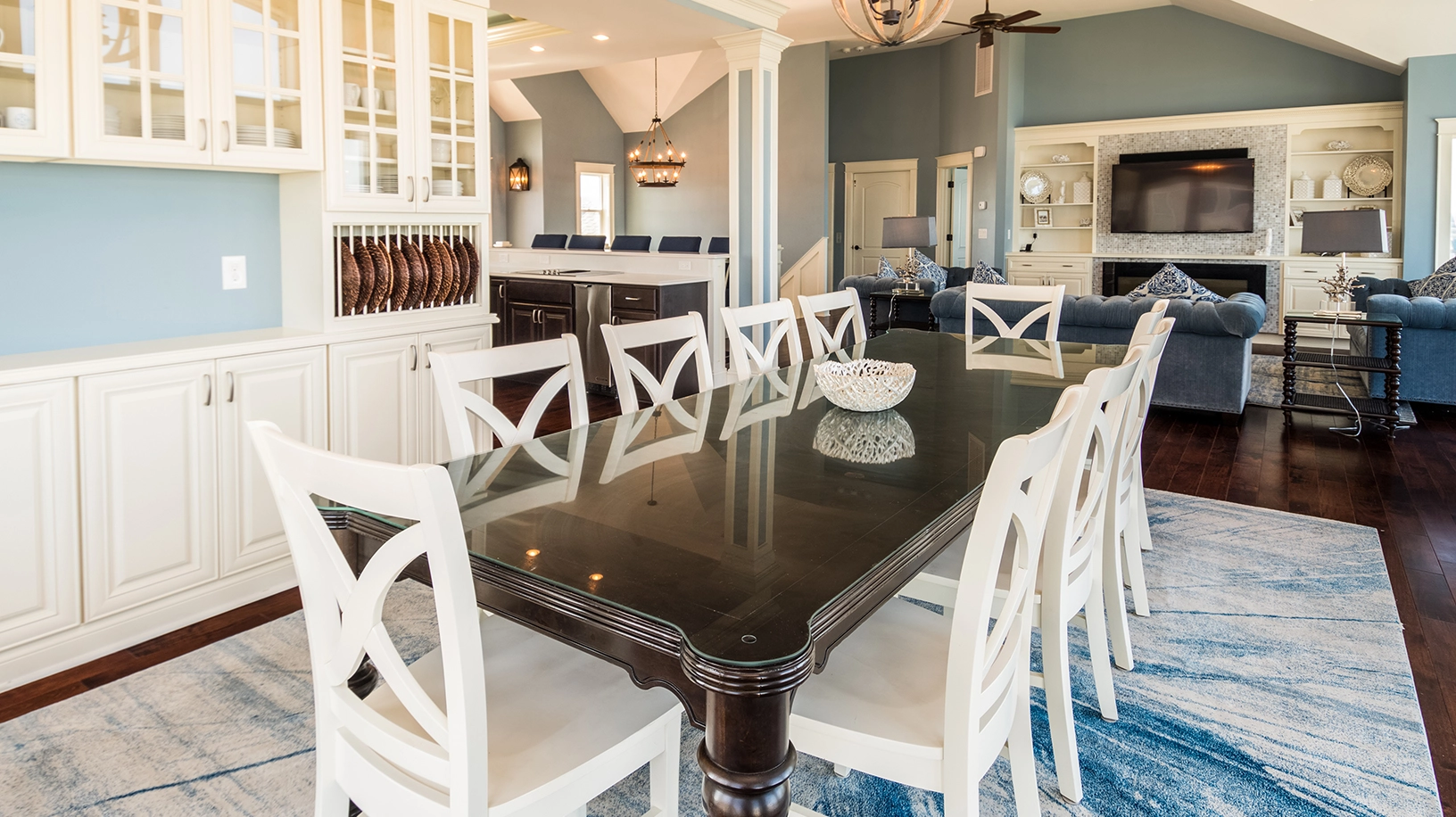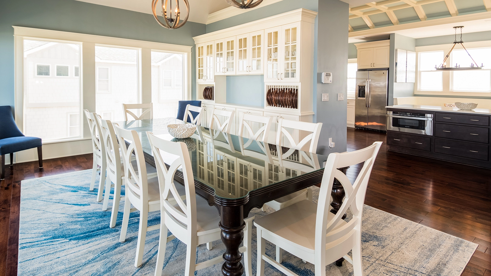 Great room; kitchen with two refrigerators, two cooktops, two dishwashers and three ovens; dining area; laundry.