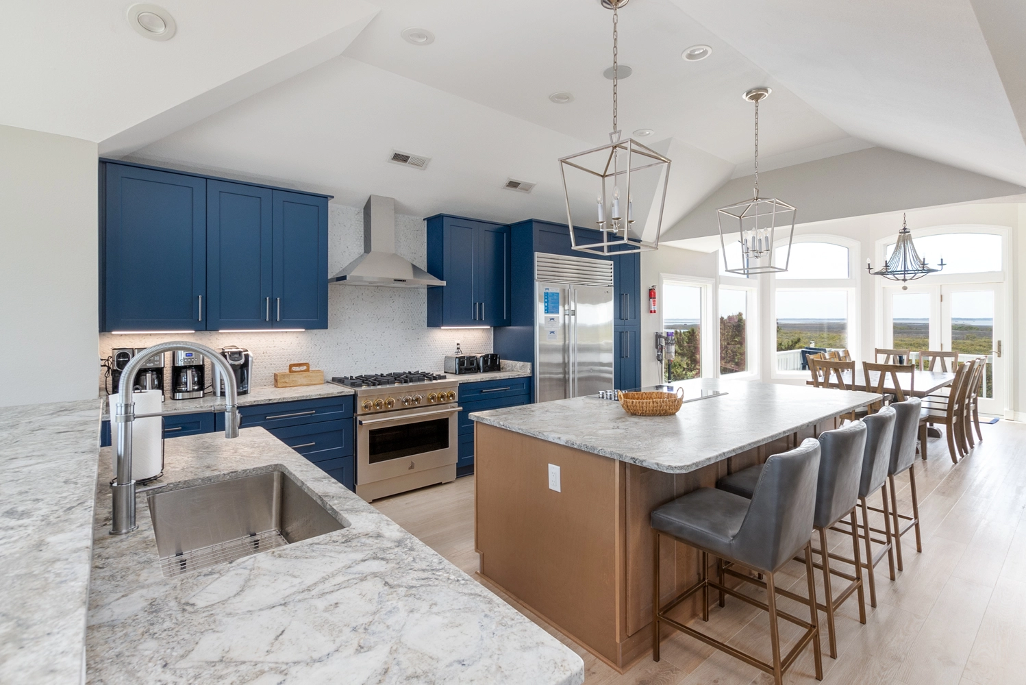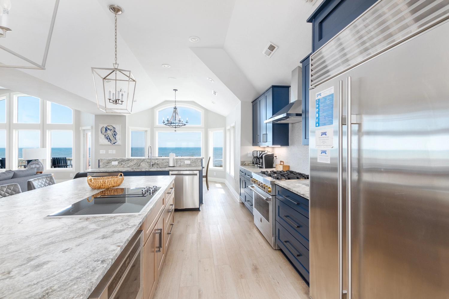 Great room with gas fireplace; chef's kitchen with two dishwashers, two refrigerators, two microwaves, 36" electric downdraft cooktop, 36" dual fuel range, 15" ice machine; two dining areas; breakfast island bar; sitting area.
