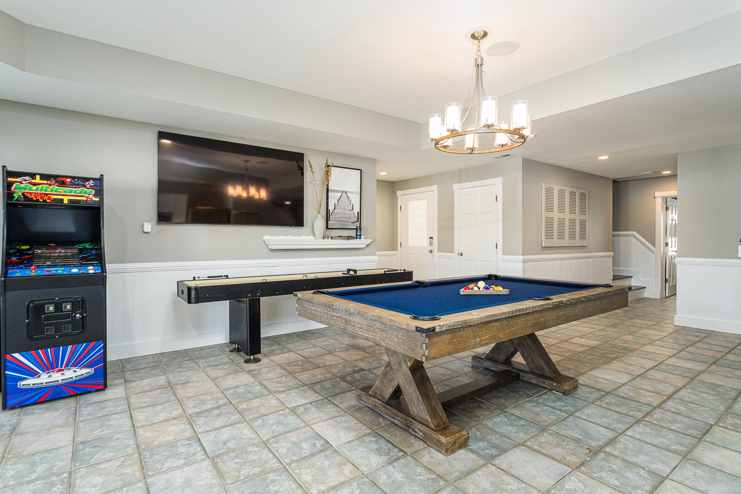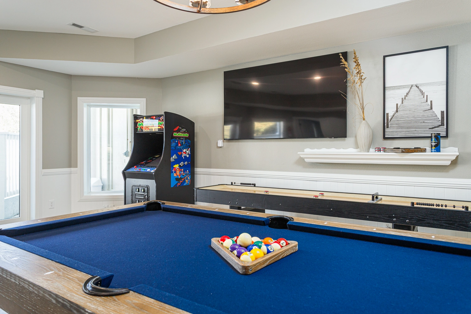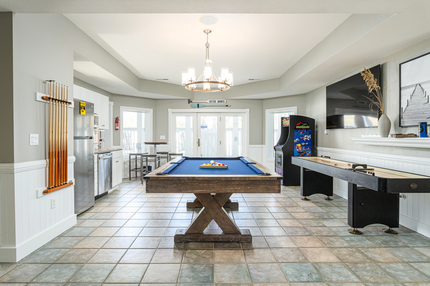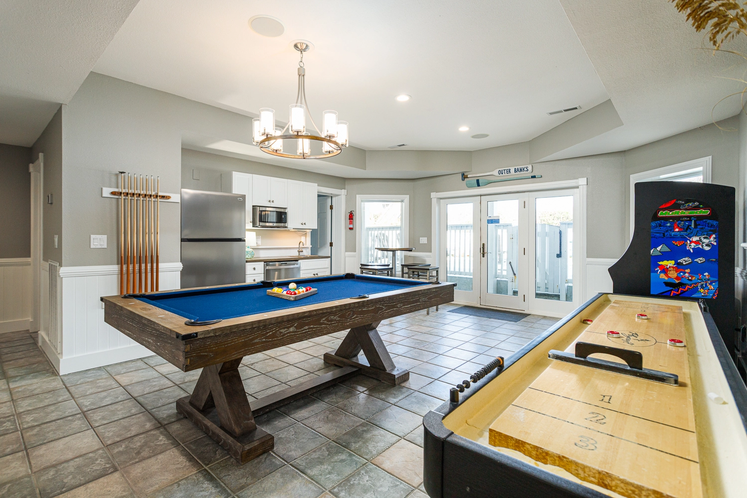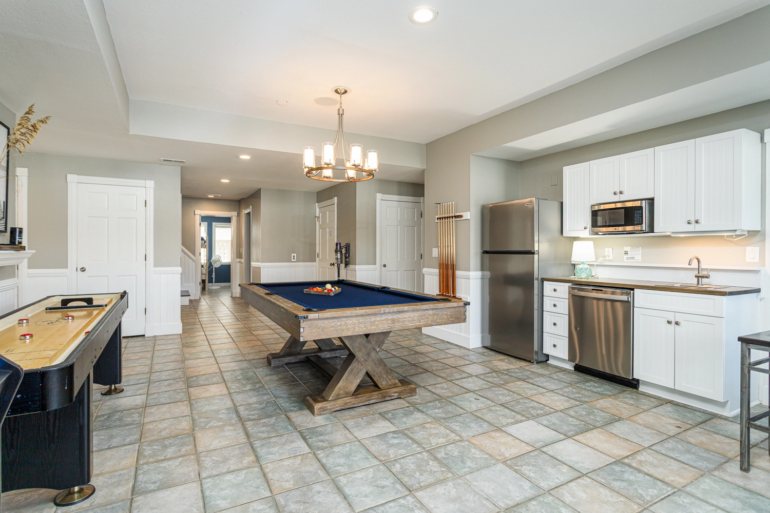 Rec room with pool table, shuffleboard, and bar area with refrigerator, dishwasher, mircrowave; double laundry.