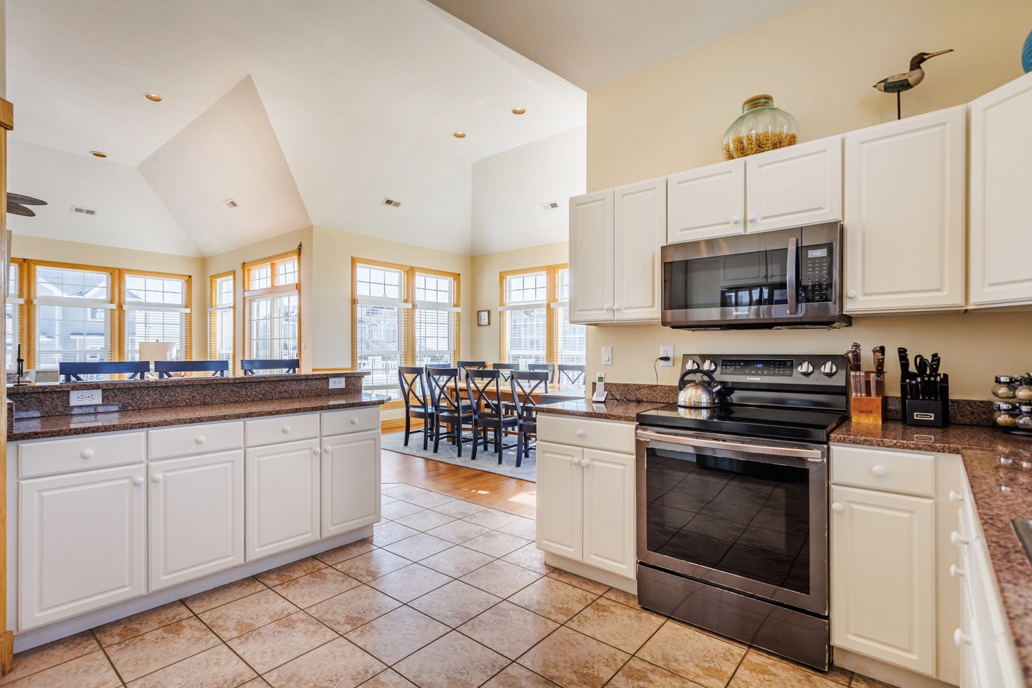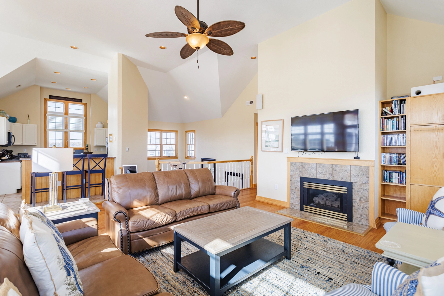 Great room with gas fireplace; kitchen; dining area.