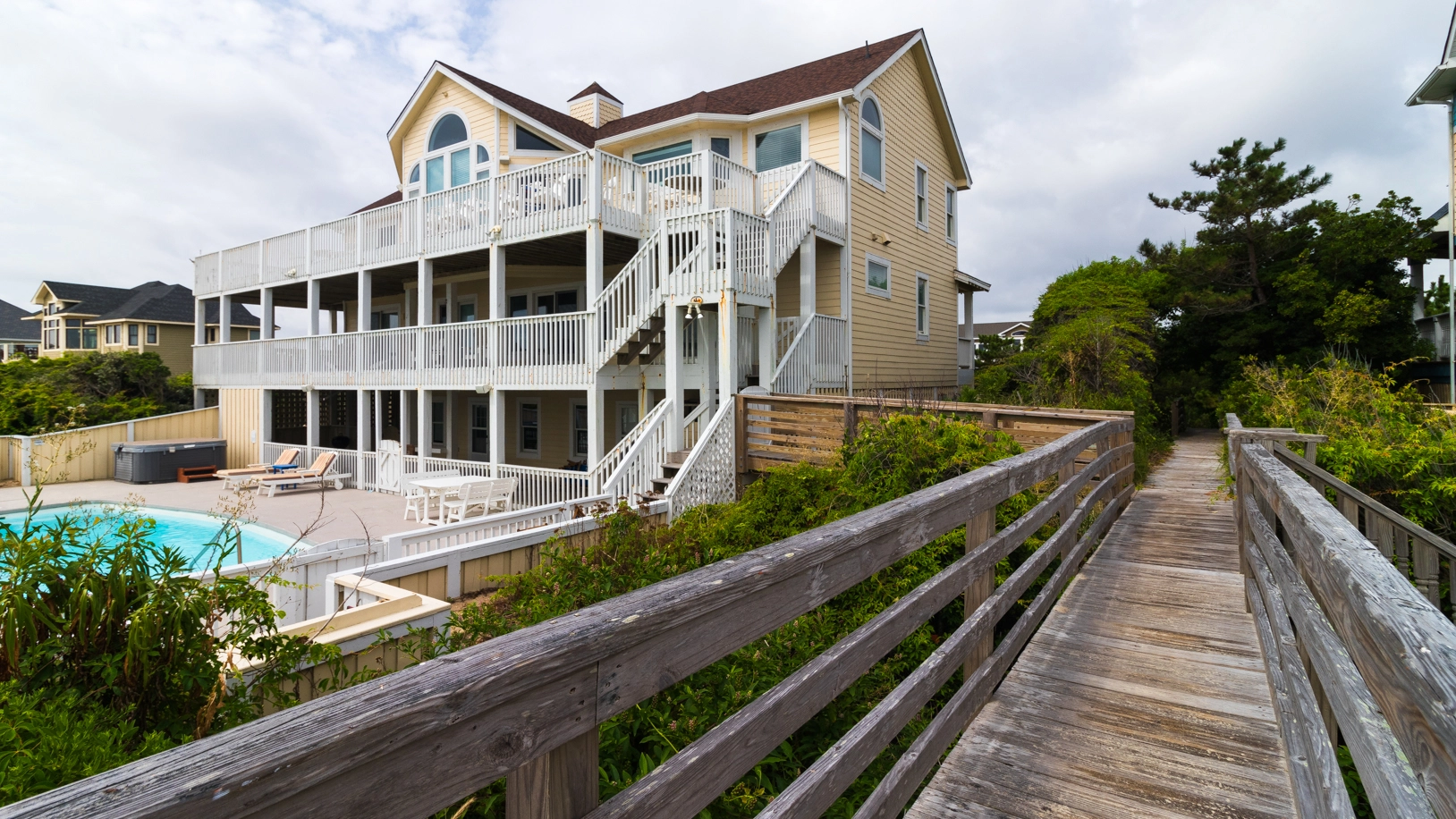 "The location of this home was fabulous!!!! It’s literally less than a minute to get on the beach with access shared only by the neighbor on one side. The house was very spacious with so many nice features like a small fridge and microwave on the second floor. That was so helpful with children staying on that floor. There’s so much seating for meals and sitting outside. The only reason I took away a star was because there’s some obvious wear and tear that needs addressed. The sliding glass doors lock, but they are rusting and some of the seals were hanging. The pool area needs some cement work around the rim. There were a lot of cracks. Finally, there were spiders and spiders webs al over outside. I think those should be sprayed! Overall I was very pleased and thought it was worth the price."