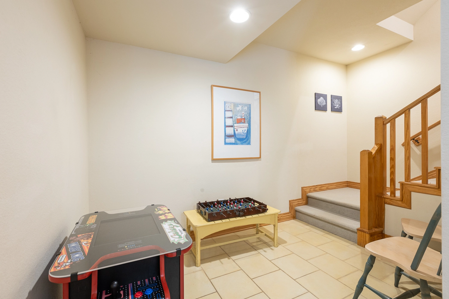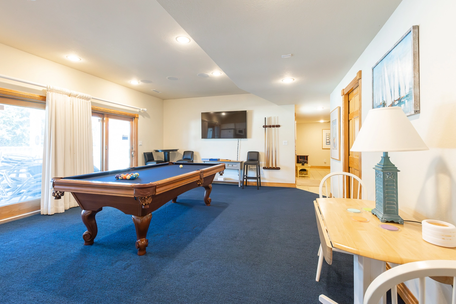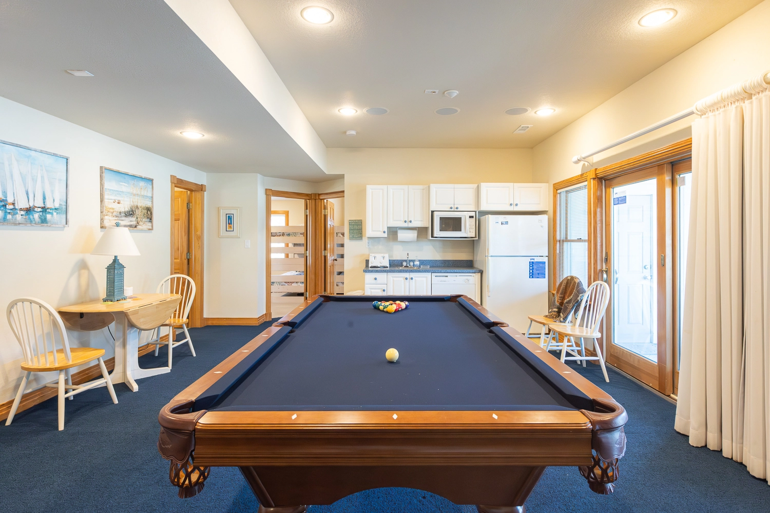 Rec room with pool table, arcade game, and kitchenette with refrigerator and dishwasher; laundry.