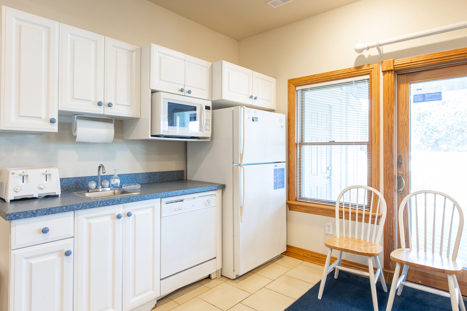 Great room with gas fireplace; kitchen with two refrigerators and two dishwashers; dining area.
