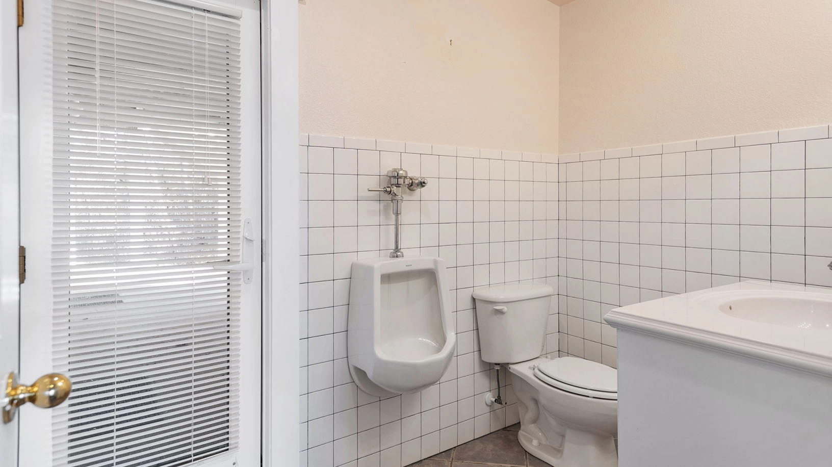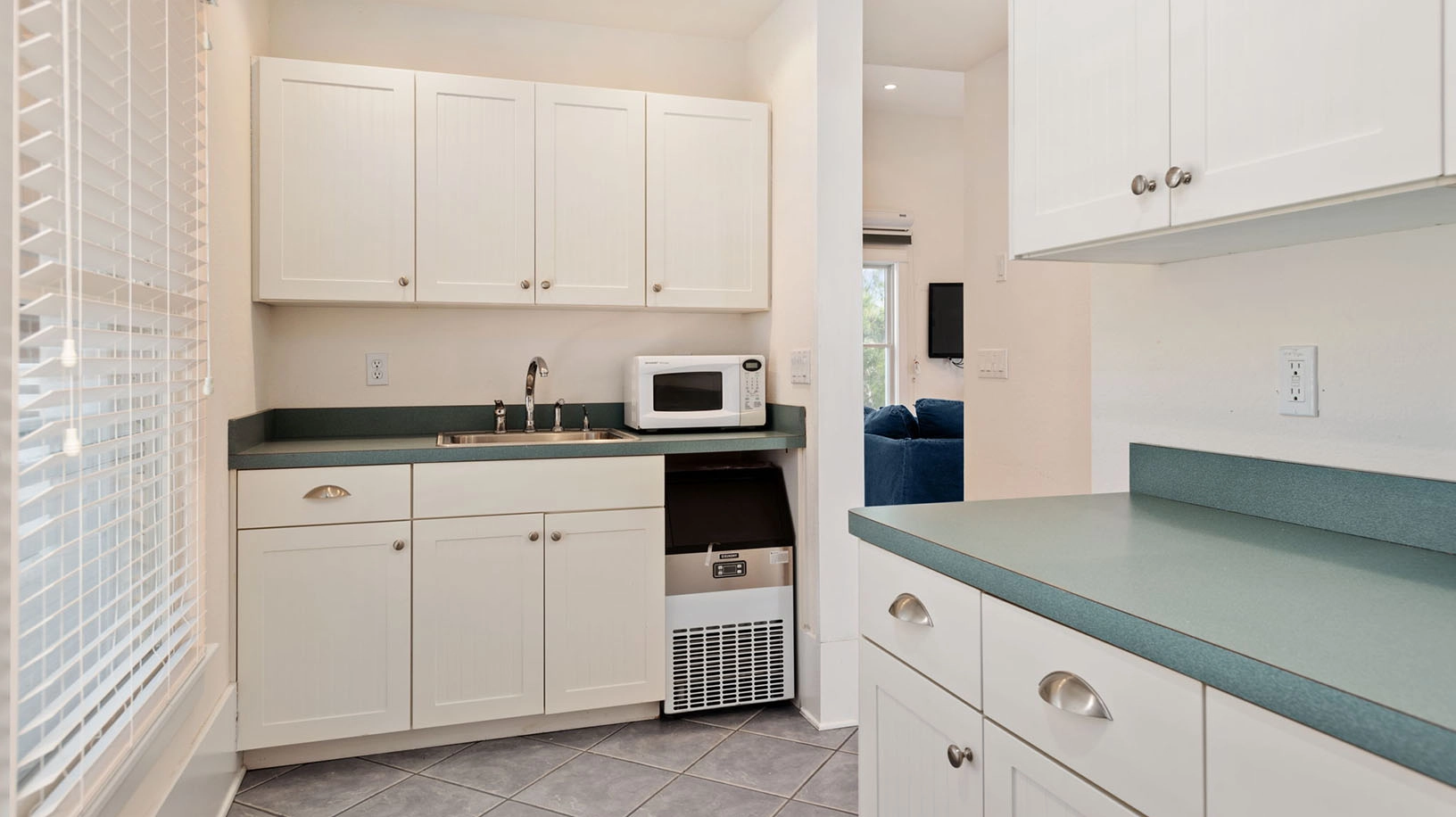 Detached media room with kitchenette and beverage refrigerator and half bath.