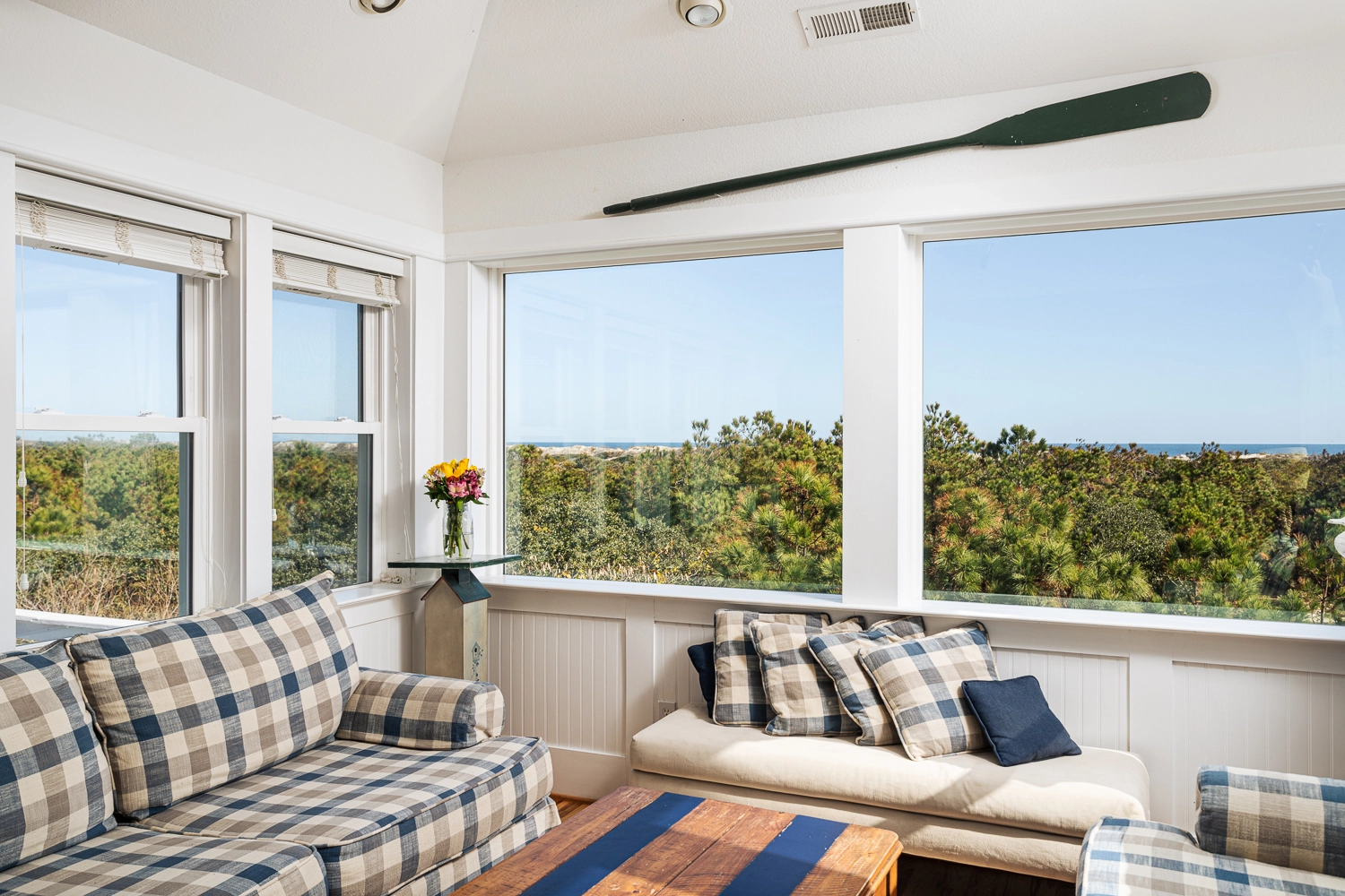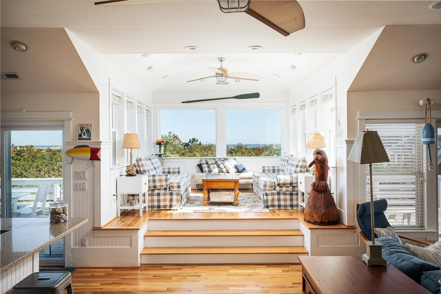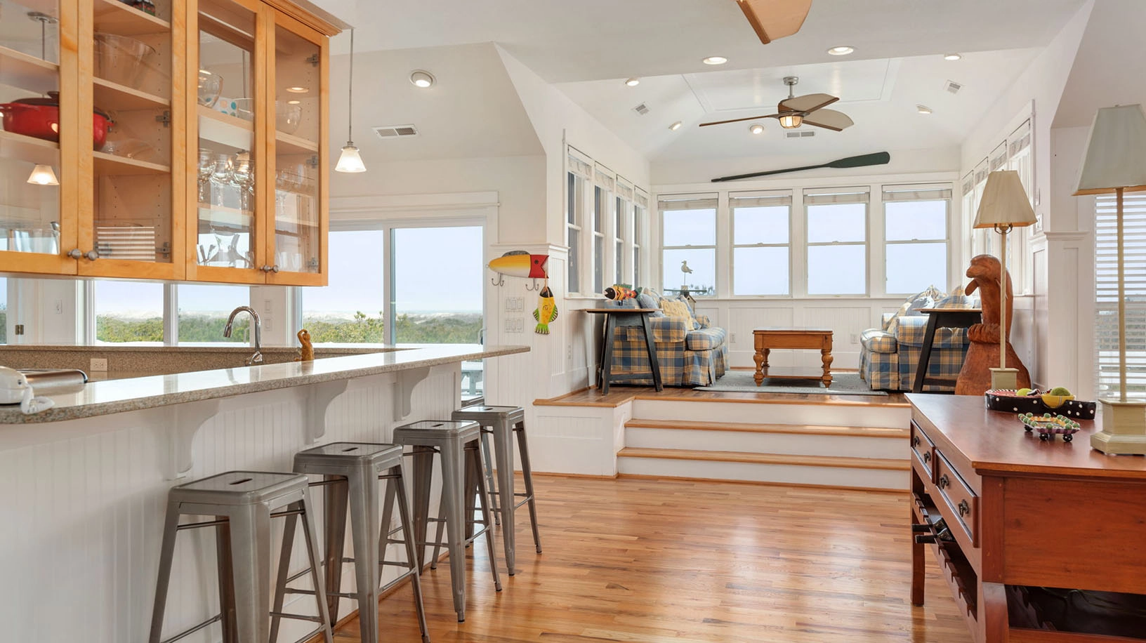 Great room; kitchen with two dishwashers; dining area; screened porch; ship's watch.