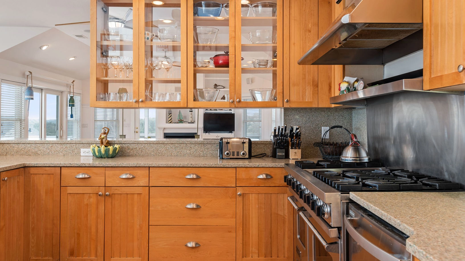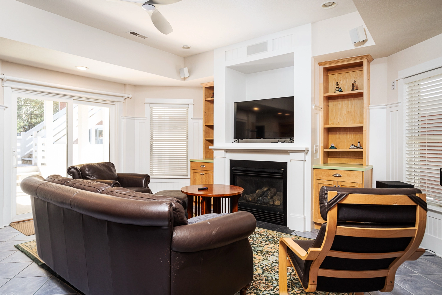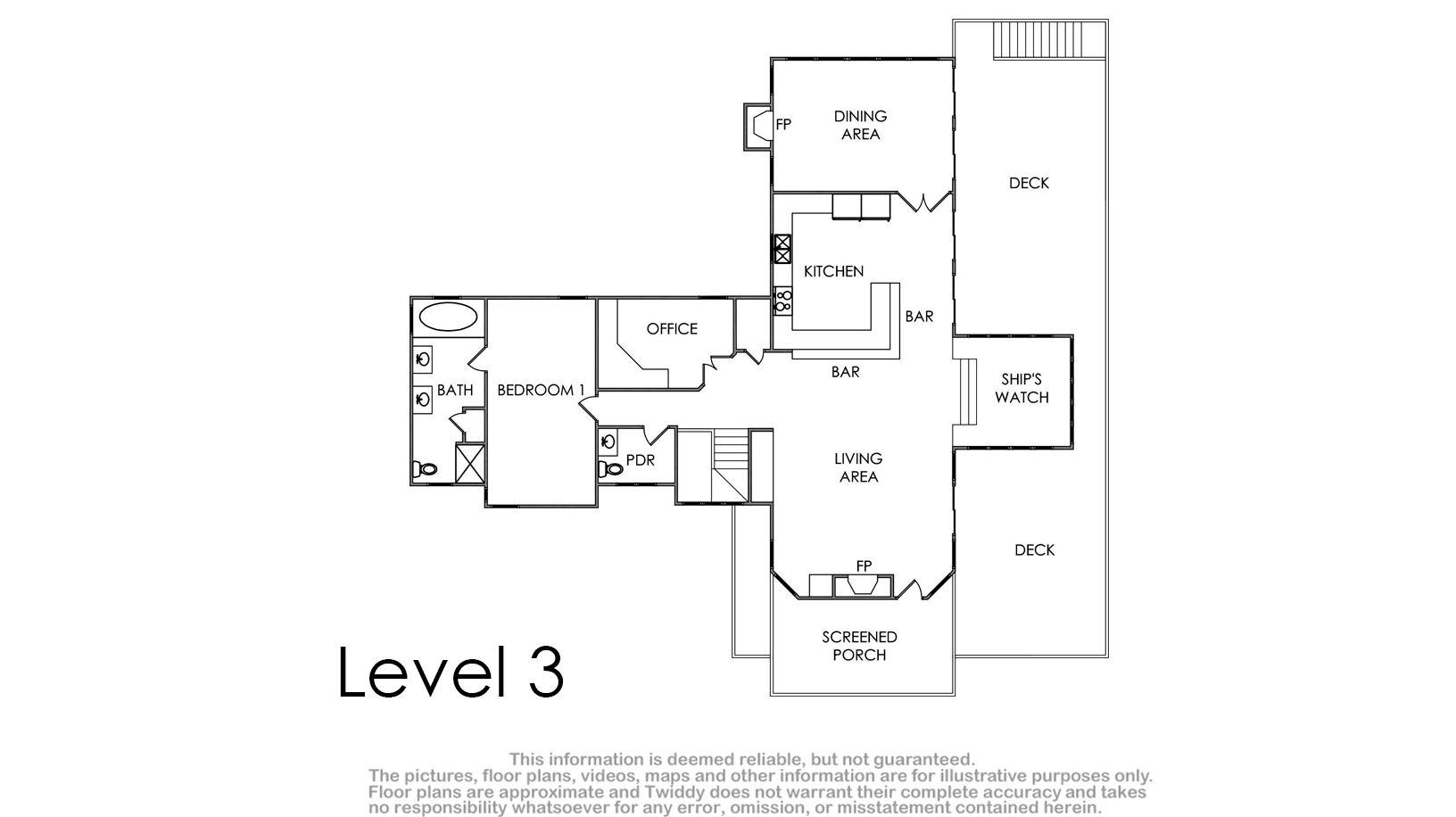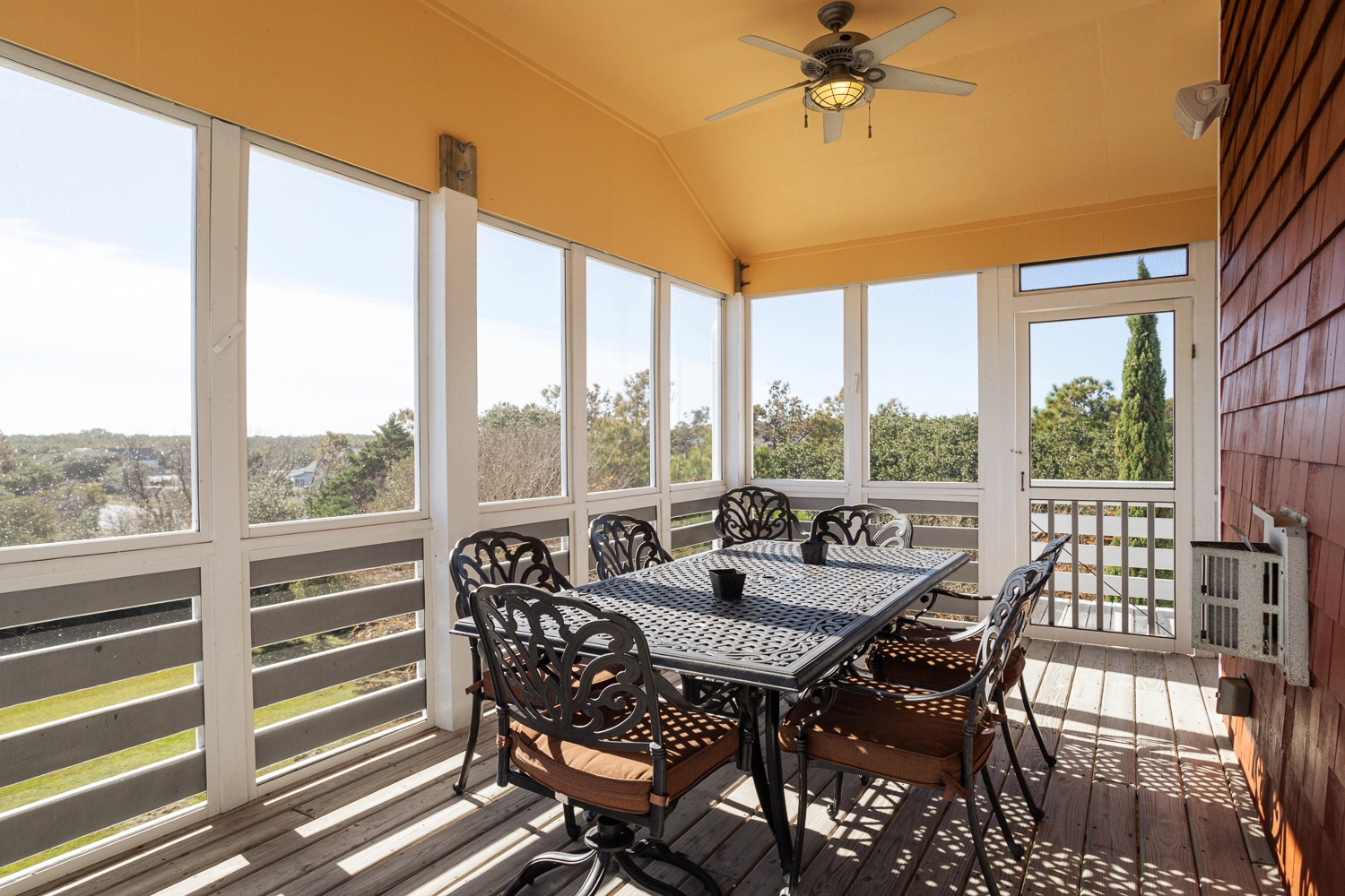 Great room; kitchen with two dishwashers; dining area; screened porch; ship's watch.
