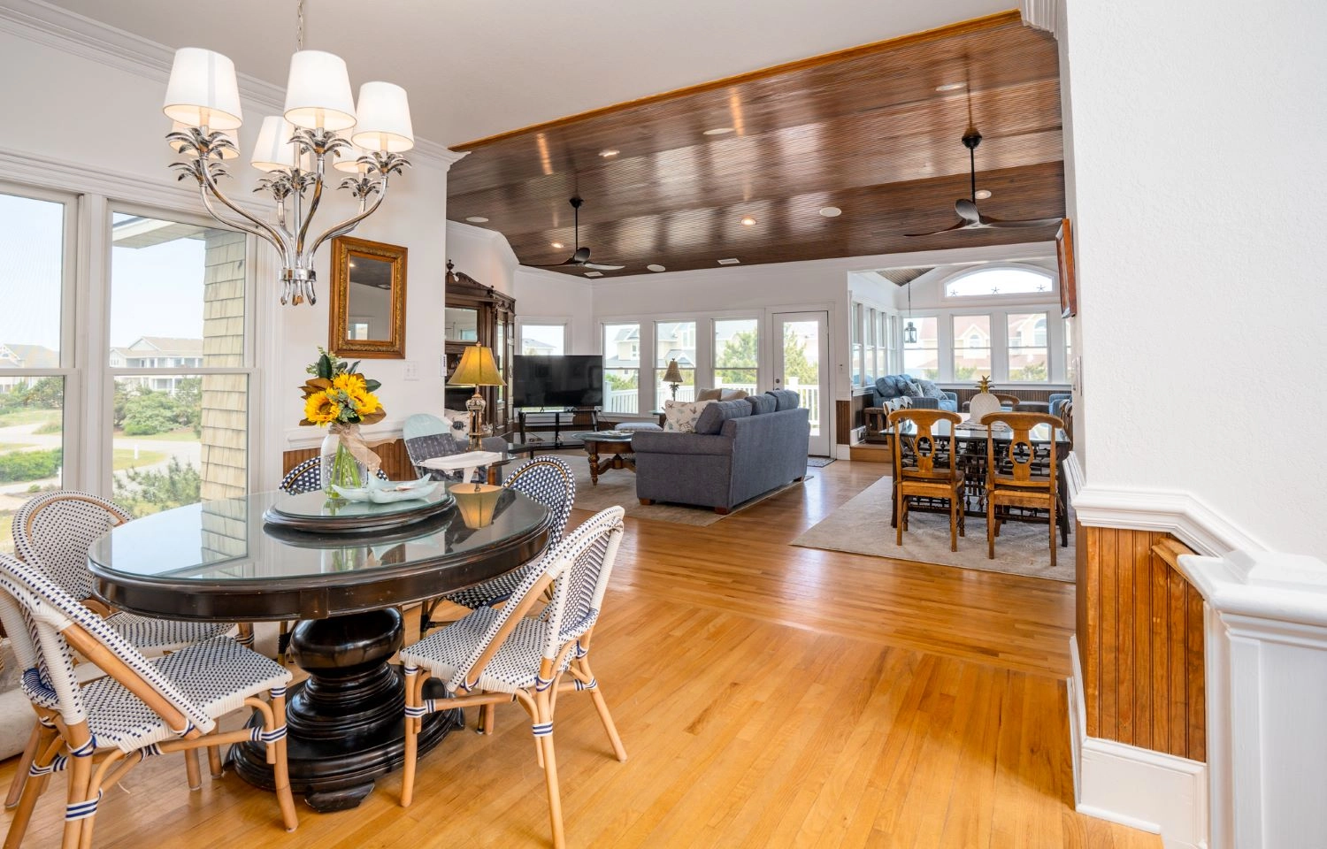 "The deck, the pool, and the large living/dining area"
