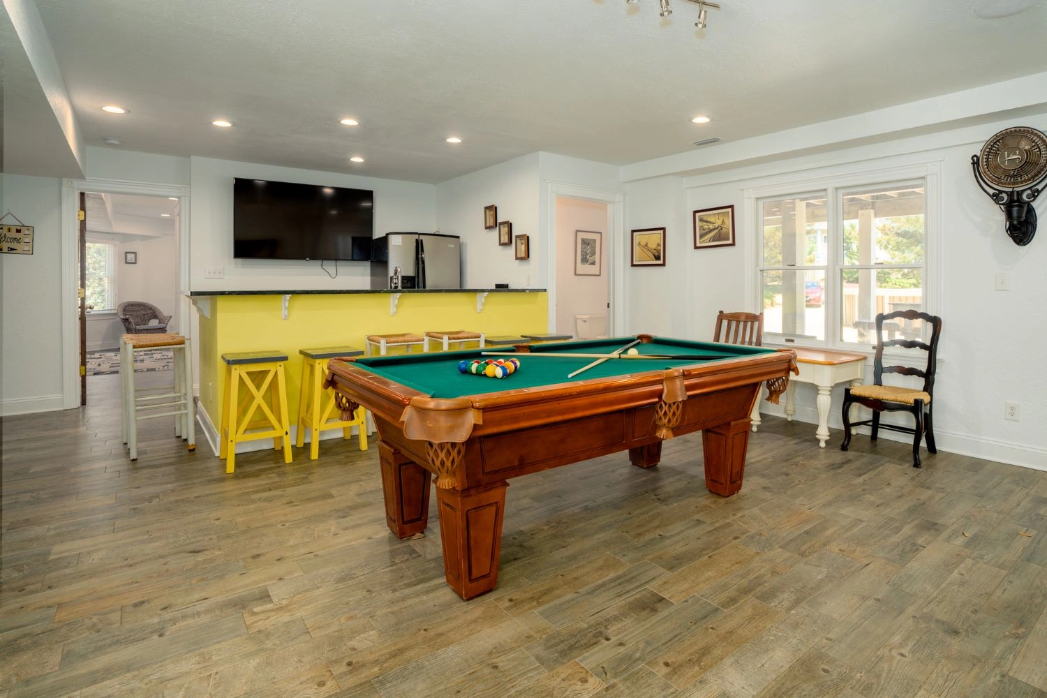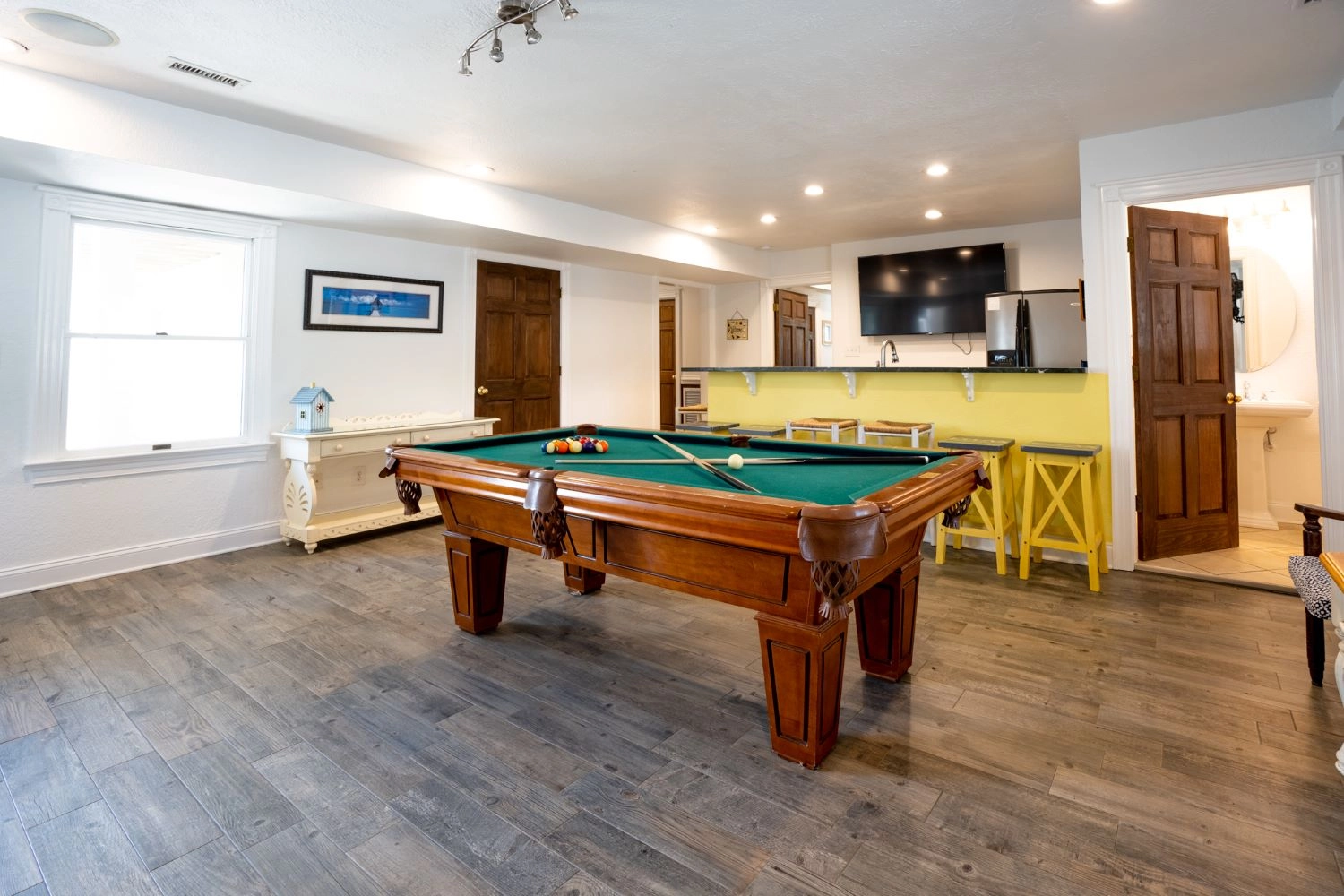 Rec room with pool table and kitchenette.