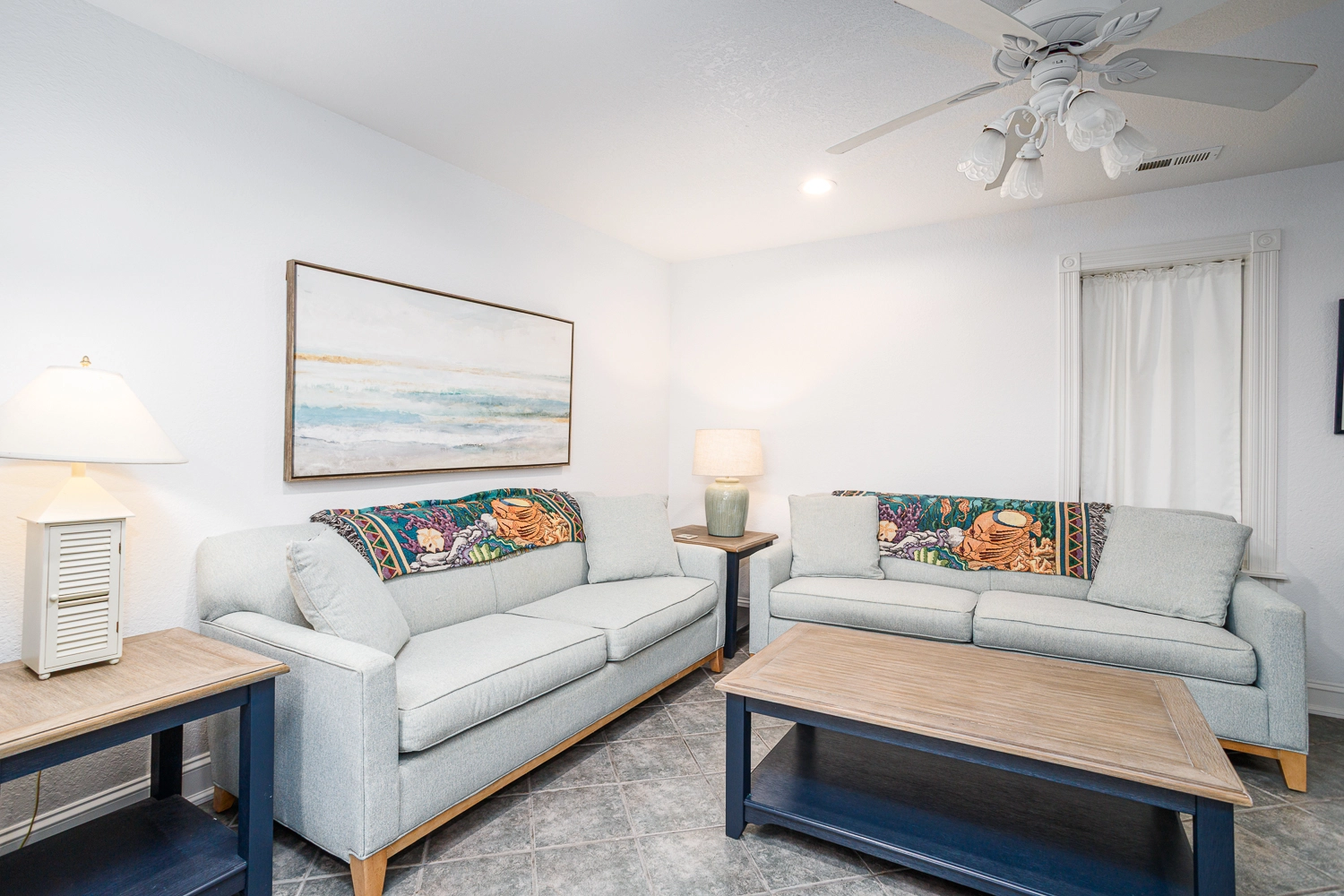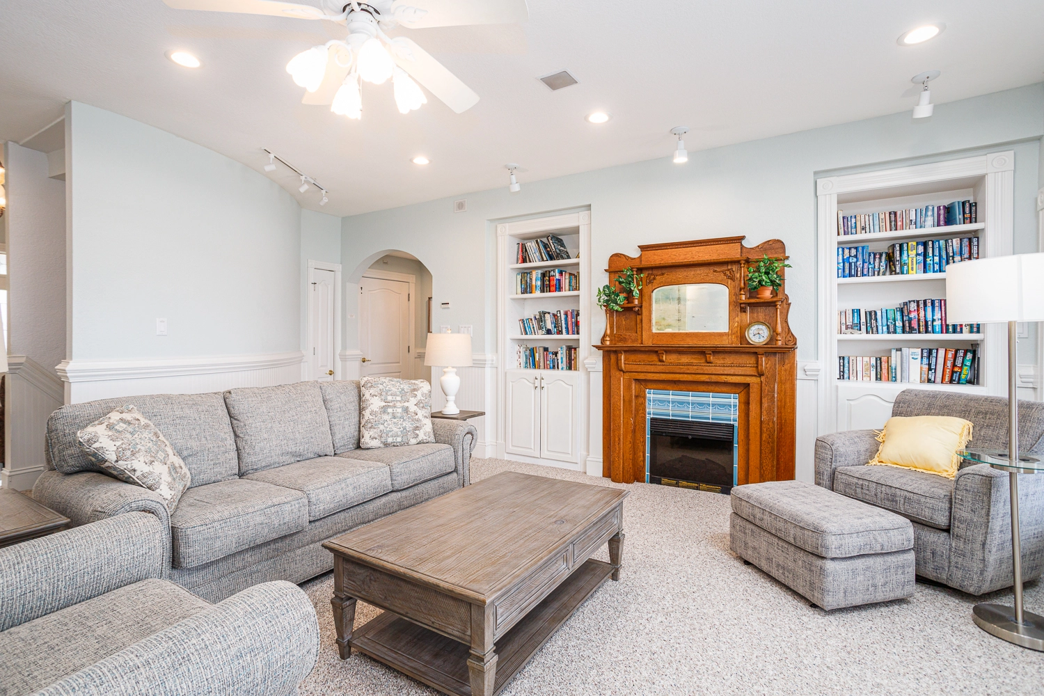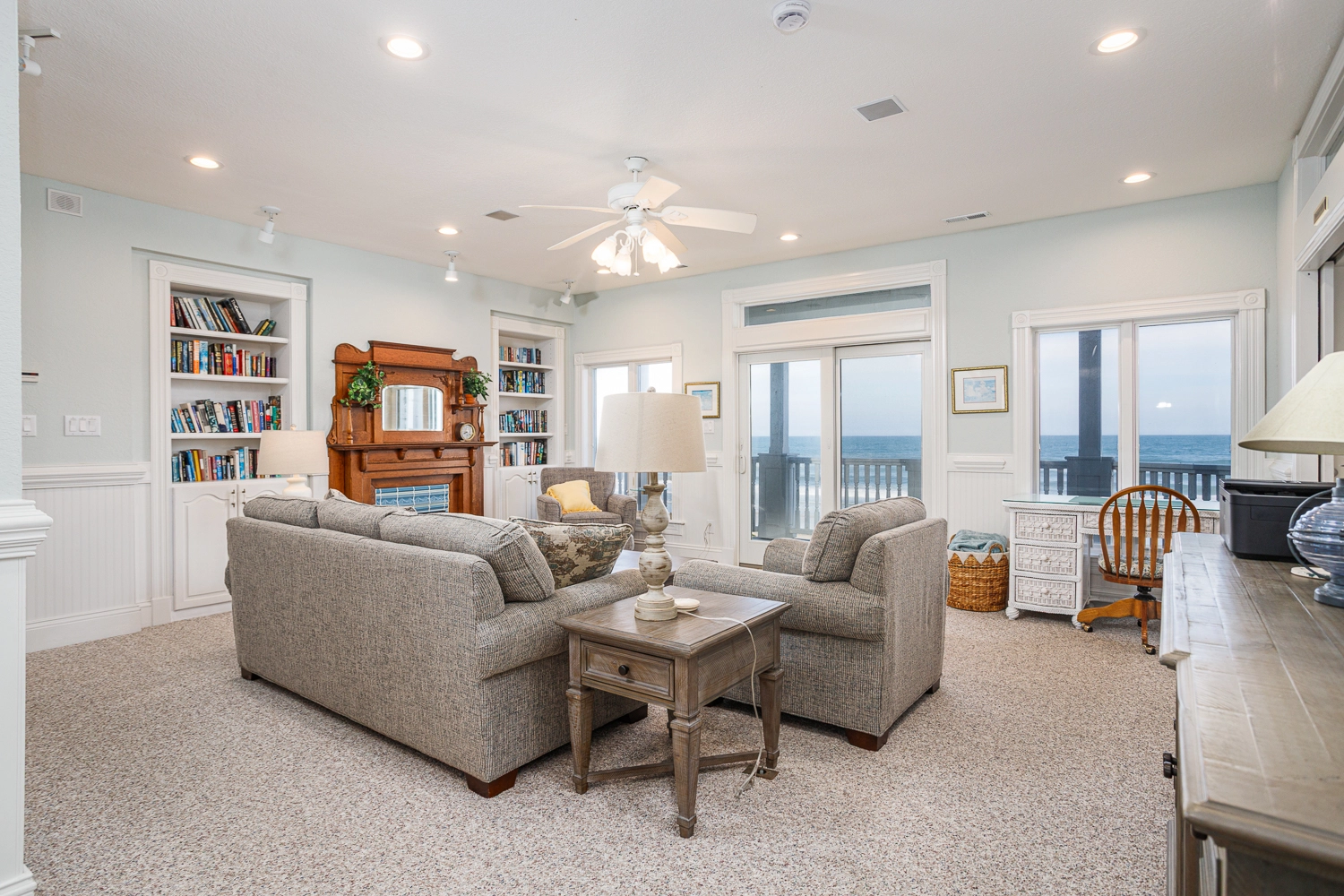 Sitting area with electric fireplace; laundry with two washers and two dryers.