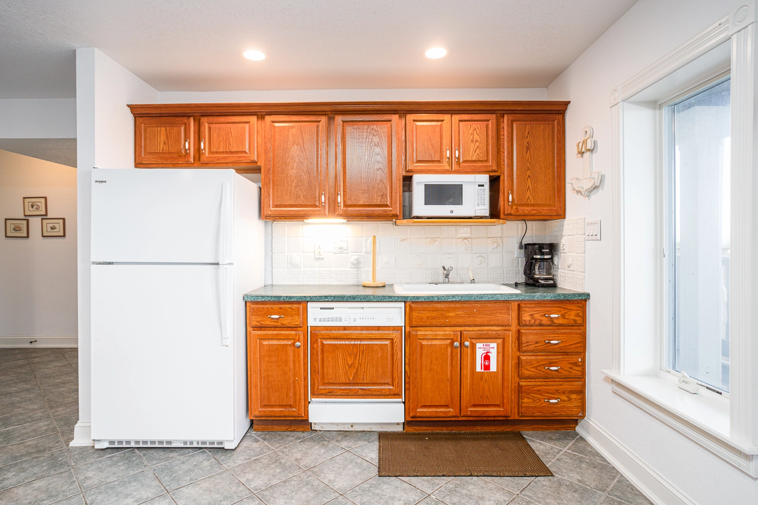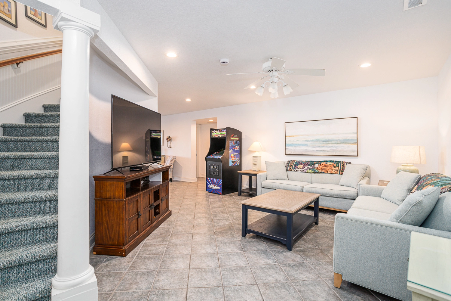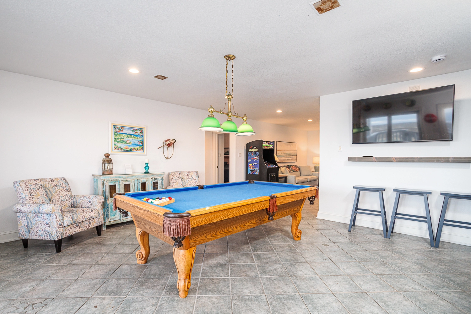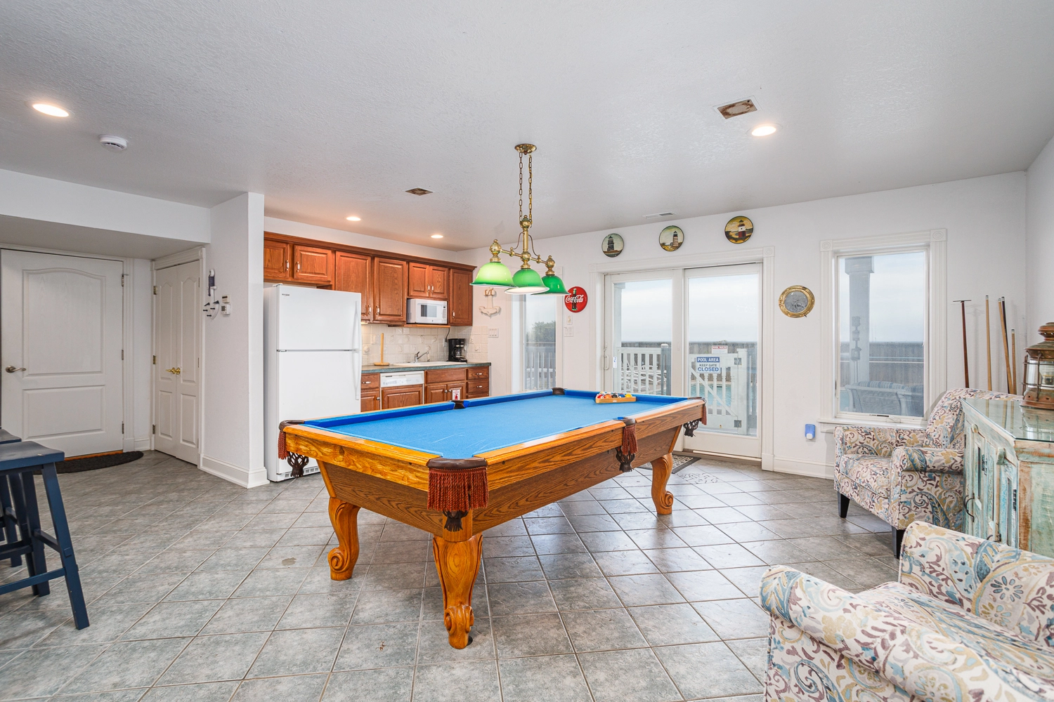 Rec room with pool table, arcade game, and kitchenette with refrigerator and dishwasher; sitting area.