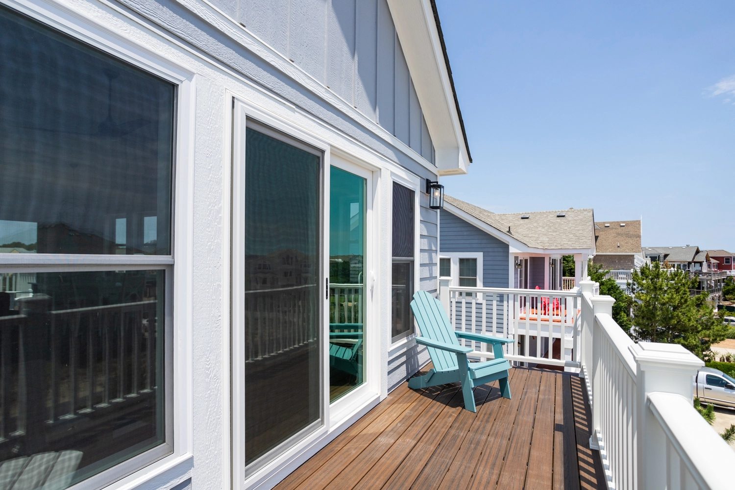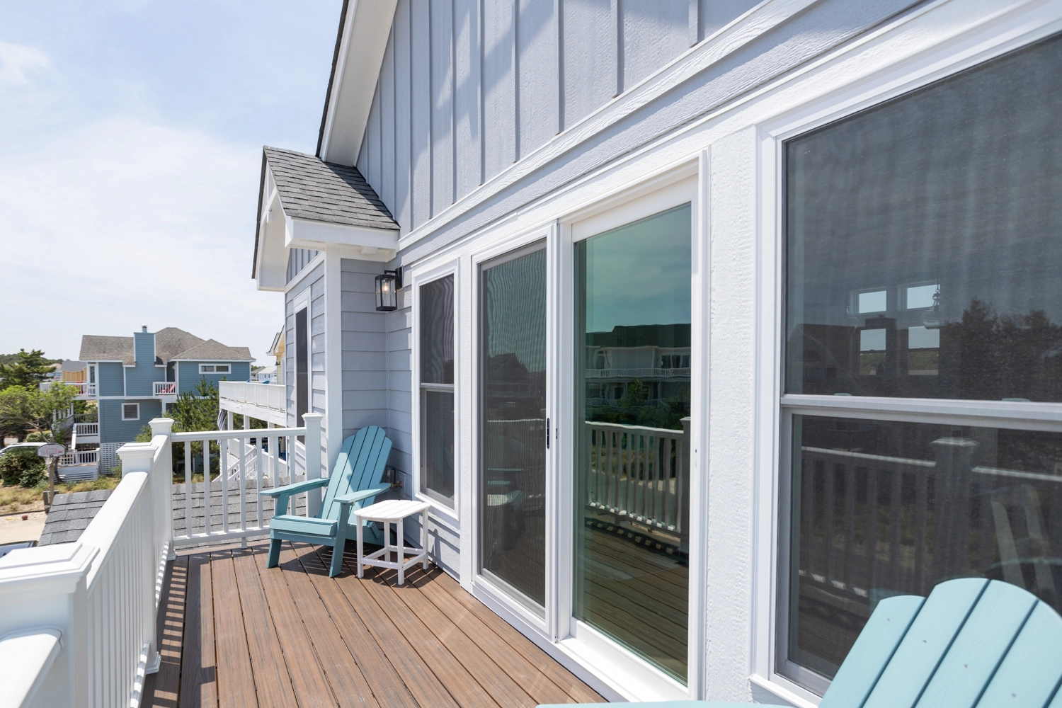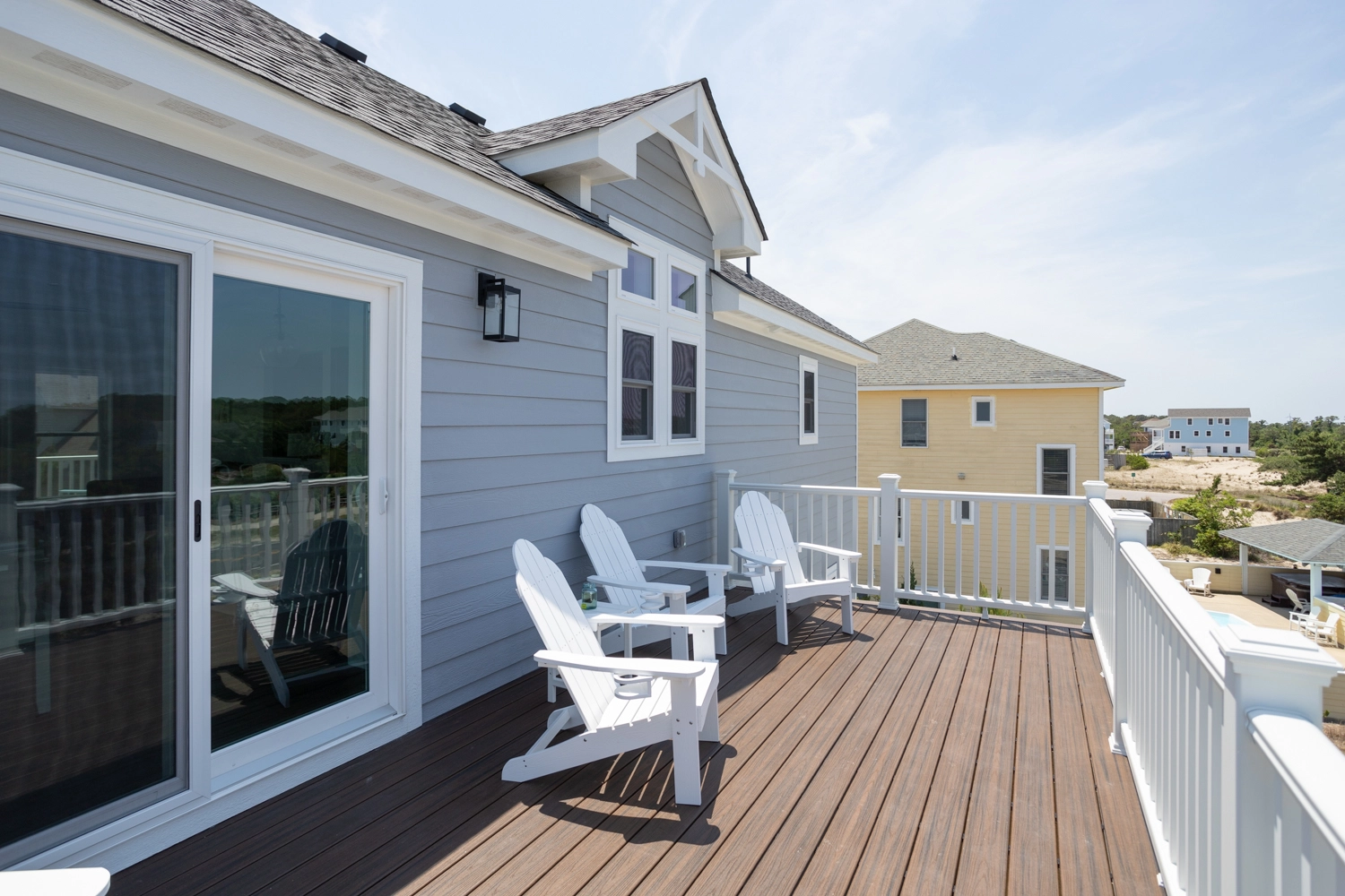 "The house is only about a 5 minute walk to the beach. The house is well built with lots of closet space in the bedrooms. The decks and railings are made from composite materials so no need to worry about splinters, and plenty of chairs are provided. A full size refrigerator on the ground level provides ample space to complement the large refrigerator in the kitchen. The pool area, along with the tables and chairs provided, is very nice. The pool has a large tanning shelf (about 6') which would be good for smaller children. The issue we had with this house is a lack of privacy as there are 2 windows in the 3rd floor bedroom that do not have window treatments and they face the house to the left, the same applies to the "kids" bedroom on the 2nd floor with 2 sets of bunk beds. The dining/living room also lack window treatments on the side facing the house to the right."